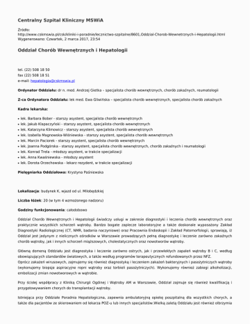 Centralny Szpital Kliniczny MSWiA Źródło: http://www.cskmswia.pl/csk/kliniki-i-poradnie/lecznictwo-szpitalne/8601,Oddzial-Chorob-Wewnetrznych-i-Hepatologii.html Wygenerowano: Czwartek, 2 marca 2017, 23:54 Oddział Chorób Wewnętrznych i Hepatologii tel. (22) 508 18 50 fax (22) 508 18 51 e-mail: [email protected] Ordynator Oddziału: dr n. med. Andrzej Gietka – specjalista chorób wewnętrznych, chorób zakaźnych, reumatologii Z-ca Ordynatora Oddziału: lek med. Ewa Gliwińska – specjalista chorób wewnętrznych, specjalista chorób zakaźnych Kadra lekarska: ● lek. Barbara Bober - starszy asystent, specjalista chorób wewnętrznych ● lek. Jakub Klapaczyński - starszy asystent, specjalista chorób wewnętrznych ● lek. Katarzyna Klimowicz - starszy asystent, specjalista chorób wewnętrznych ● lek. Izabella Magnowska-Wiśniewska - starszy asystent, specjalista chorób wewnętrznych ● lek. Marcin Paciorek - starszy asystent, specjalista chorób wewnętrznych ● lek. Joanna Podgórska - starszy asystent, specjalista chorób wewnętrznych, chorób zakaźnych i reumatologii ● lek. Konrad Trela - młodszy asystent, w trakcie specjalizacji ● lek. Anna Kwaśniewska - młodszy asystent ● lek. Dorota Orzechowska - lekarz rezydent, w trakcie specjalizacji Pielęgniarka Oddziałowa: Krystyna Paśniewska Lokalizacja: budynek K, wjazd od ul. Milobędzkiej Liczba łóżek: 20 (w tym 4 wzmożonego nadzoru) Godziny funkcjonowania: całodobowo Oddział Chorób Wewnętrznych i Hepatologii świadczy usługi w zakresie diagnostyki i leczenia chorób wewnętrznych oraz praktycznie wszystkich schorzeń wątroby. Bardzo bogate zaplecze laboratoryjne a także doskonale wyposażony Zakład Diagnostyki Radiologicznej (CT, NMR, badania naczyniowe) oraz Pracownia Endoskopii i Zakład Patomorfologii, sprawiają, iż Oddział jest jedynym z nielicznych ośrodków w Warszawie prowadzących pełną diagnostykę i leczenie zarówno zakaźnych chorób wątroby, jak i innych schorzeń miąższowych, cholestatycznych oraz nowotworów wątroby. Główną domeną Oddziału jest diagnostyka i leczenie zarówno ostrych, jak i przewlekłych zapaleń wątroby B i C, według obowiązujących standardów światowych, a także według programów terapeutycznych refundowanych przez NFZ. Oprócz zakażeń wirusowych, zajmujemy się również diagnostyką i leczeniem zakażeń bakteryjnych i pasożytniczych wątroby (wykonujemy biopsje aspiracyjne ropni wątroby oraz torbieli pasożytniczych). Wykonujemy również zabiegi alkoholizacji, embolizacji zmian nowotworowych w wątrobie. Przy ścisłej współpracy z Kliniką Chirurgii Ogólnej i Wątroby AM w Warszawie, Oddział zajmuje się również kwalifikacją i przygotowywaniem chorych do transplantacji wątroby. Istniejąca przy Oddziale Poradnia Hepatologiczna, zapewnia ambulatoryjną opiekę poszpitalną dla wszystkich chorych, a także dla pacjentów ze skierowaniem od lekarza POZ-u lub innych specjalistów.Wielką zaletą Oddziału jest również olbrzymia wszechstronność w zakresie leczenia schorzeń internistycznych. Wykaz procedur medycznych wykonywanych w Oddziale Chorób Wewnętrznych i Hepatologii: ● hospitalizacje w zakresie chorób wewnętrznych, ● leczenie ostrych i przewlekłych zapaleń wątroby, ● przezskórna gruboigłowa biopsja wątroby, ● przezskórna cienkoigłowa biopsja wątroby, ● alkoholizacja guzów wątroby, ● embolizacja guzów wątroby, ● diagnostyka i leczenie marskości wątroby, ● przygotowanie do transplantacji wątroby, ● wszystkie procedury diagnostyczne dostępne na terenie szpitala. Wykaz niezbędnych dokumentów do planowanego przyjęcia: ● skierowanie do Szpitala od lekarza POZ-u lub specjalisty, ● dowód osobisty, ● druk ZUS ZUA lub odcinek renty /lub emerytury, ● aktualne badania, ● grupa krwi, ● dotychczasowa dokumentacja medyczna. Wykaz niezbędnych rzeczy osobistych: ● przybory toaletowe, ● pidżama, ● kapcie, ● ręczniki. Poradnia Hepatologiczna: Rejestracja do Poradni Hepatologicznej odbywa się w rejestracji do lekarzy specjalistów. Rejestracja do Poradni WZW i konsultacje skierowań w trybie pilnym odbywają się w Poradni Hepatologicznej i pod nr tel. 022-508-18-55 Poradnia Hepatologiczna: tel. (22) 508 18 55 Lokalizacja: Budynek K, Parter, Gabinet nr 18 Godziny przyjęć: poniedziałek 10.00 - 17.00 wtorek -piątek 8.00 – 15.00 Drukuj Generuj PDF Powiadom znajomego Wstecz