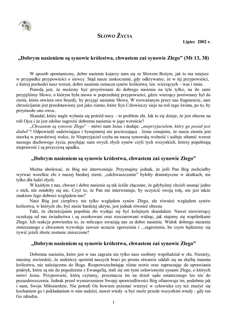 SŁOWO ŻYCIA Lipiec 2002 r. „Dobrym nasieniem są synowie królestwa, chwastem zaś synowie Złego” (Mt 13, 38) W sposób spontaniczny, dobre nasienie kojarzy nam się ze Słowem Bożym, jak to ma miejsce w przypadku przypowieści o siewcy. Stąd nasze zaskoczenie, gdy odkrywamy, że w tej przypowieści, z której pochodzi nasz werset, dobre nasienie oznacza synów królestwa, tzn. wierzących – was i mnie. Prawdą jest, że możemy być przyrównani do dobrego nasienia na tyle tylko, na ile sami przyjęliśmy Słowo, o którym była mowa w poprzedniej przypowieści, gdzie wierzący porównany był do ziemi, która otwiera swe bruzdy, by przyjąć nasienie Słowa. W rozważanym przez nas fragmencie, sam chrześcijanin jest przedstawiony jest jako ziarno, które Syn Człowieczy sieje na roli tego świata, po to, by przyniosło ono owoc. Skandal, który nagle wyłania się pośród nocy – to problem zła. Jak to się dzieje, że jest obecne na roli Ojca i że jest zdolne zagrozić dobremu nasieniu w jego wzroście? „Chwastem są synowie Złego” – mówi nam Jezus i dodaje: „nieprzyjacielem, który go posiał jest diabeł”! Odpowiedź zadziwiająca i bynajmniej nie pocieszająca . Jezus oznajmia, że nasza ziemia jest stawką w prawdziwej walce, że Nieprzyjaciel czyha na naszą synowską wolność i usiłuje stłumić wzrost naszego duchowego życia, posyłając nam swych złych synów czyli tych wszystkich, którzy popełniają nieprawość i są przyczyną upadku. „Dobrym nasieniem są synowie królestwa, chwastem zaś synowie Złego” Można ubolewać, że Bóg nie interweniuje. Przyznajmy jednak, że jeśli Pan Bóg zechciałby wyrwać wszelkie zło z naszej biednej ziemi, „odchwaszczanie” byłoby dramatyczne w skutkach, nie tylko dla ludzi złych. W każdym z nas, chwast i dobre nasienie są tak ściśle złączone, że gdybyśmy chcieli usunąć jedno z nich, nie ostałoby się nic. Czyż to, że Pan nie interweniuje, by oczyścić swoją rolę, nie jest także znakiem Jego dobroci względem nas? Nasz Bóg jest cierpliwy nie tylko względem synów Złego, ale również względem synów królestwa, w których zło, być może bardziej ukryte, jest jednak również obecne. Fakt, że chrześcijanin popełnia zło wydaje się być kolejnym skandalem. Nawet niewierzący oczekują od nas świadectwa i są zszokowani oraz rozczarowani widząc, jak stajemy się wspólnikami Złego. Ich reakcja potwierdza to, że milcząco uważają nas za dobre nasienie. Widok dobrego nasienia zmieszanego z chwastem wywołuje zawsze uczucie zgorszenia i ...zagrożenia, bo czym będziemy się żywić jeżeli zboże zostanie zniszczone? „Dobrym nasieniem są synowie królestwa, chwastem zaś synowie Złego” Dobremu nasieniu, które jest w nas zagraża nie tylko nasz osobisty współudział w złu. Niestety, musimy stwierdzić, że niektórzy spośród naszych braci po prostu otwarcie oddali się na służbę innemu królestwu, nie należącemu do Boga. Rozpowszechniając różne teorie oraz zapraszając do uprawiania praktyk, które są nie do pogodzenia z Ewangelią, stali się oni tymi osławionymi synami Złego, o których mówi Jezus. Przypowieść, którą czytamy, przeznacza im na dzień sądu ostatecznego los nie do pozazdroszczenia. Jednak przed wymierzeniem Swojej sprawiedliwości Bóg ofiarowuje im, podobnie jak i nam, Swoje Miłosierdzie. Nie potrafi On bowiem przestać wierzyć w człowieka czy też znużyć się kochaniem go i pokładaniem w nim nadziei, nawet wtedy -a być może przede wszystkim wtedy - gdy ten Go zdradza. 1 „Kochajcie Waszych nieprzyjaciół i módlcie się za tych, którzy was prześladują; tak będziecie synami Ojca waszego, który jest w Niebie; ponieważ On sprawia, że słońce Jego wschodzi nad złymi i nad dobrymi, i On zsyła deszcz na sprawiedliwych i niesprawiedliwych” (Mt 5, 44-45). Moglibyśmy dopowiedzieć: na dobre nasienie i na chwast. Nie jest to, co prawda, tematem naszej przypowieści, ale nie ma wątpliwości, że Pan chce nas wprowadzić w Jego spojrzenie na złych ludzi. Jeśli nie czynią oni dobra to dlatego, że nie odkryli jeszcze radości czynienia dobra. Co więcej, zasługują na nasze współczucie, gdyż to oni sami są pierwszymi ofiarami zła, które rozpowszechniają. A jeśli nie odkryli dobra, to być może dlatego, że nikt jeszcze nie zaświadczył wobec nich ani słowem, ani przykładem. Forsując nieco naszą interpretację, moglibyśmy powiedzieć, że Pan zabrania swoim sługom wyrwania chwastu, nie tylko z troski o to, by nie zniszczyć dobrego nasienia, ale także, by pozwolić mu przemienić chwast! Jezus oczekuje od nas, że ośmielimy się otwarcie okazać naszą radość z przynależności do Niego, by z kolei On mógł się cieszyć widokiem dzieci Ojca, wcześniej zagubionych w szeregach Nieprzyjaciela, a teraz powracających pod Jego sztandar. „Dobrym nasieniem są synowie królestwa, chwastem zaś synowie Złego” Jesteśmy dobrym nasieniem zasianym na roli Ojca, który oczekuje od nas, że będziemy przekazywać dalej świadectwo Jego Syna, w mocy Ducha Świętego, którego On nam udziela. Jak kłos, który jaśnieje w letnim słońcu, tak nasze życie powinno ukazywać niewidzialne, ale jakże obecne słońce Bożej miłości, które jest w stanie przemienić nasze biedne, jałowe życie w urodzajny łan zboża. W ten letni i wakacyjny czas dobrze jest sobie przypomnieć to posłanie i misję, jaką powierzył nam Ojciec. Tak, jak On sieje dobre nasienie swego Słowa w naszym życiu, by je użyźnić, podobnie i my jesteśmy zaproszeni do tego, by stać się nasieniem rzuconym w ziemię, którego owoce sprawiedliwości i pokoju wznoszą się ponad chwastem. 2
