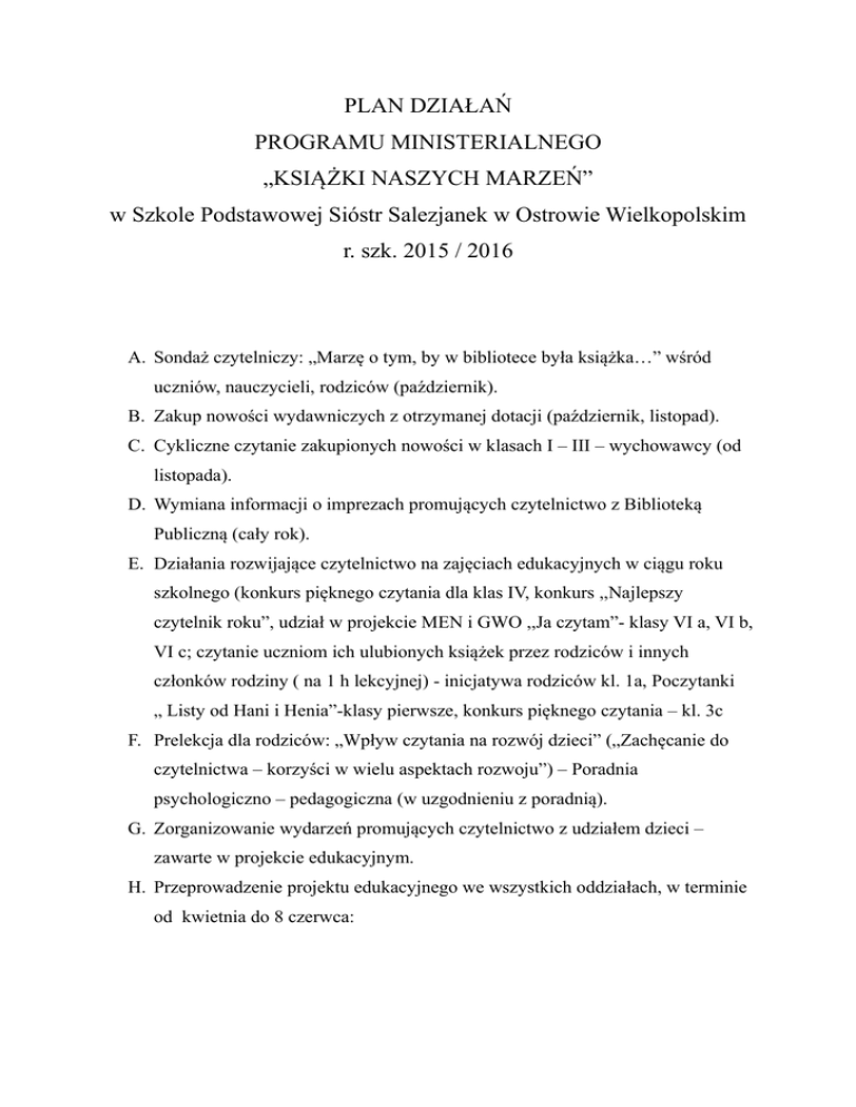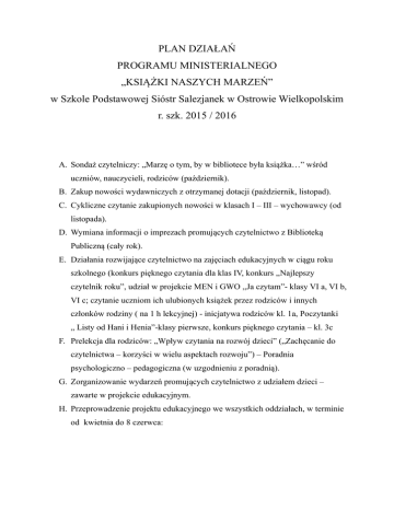 PLAN DZIAŁAŃ PROGRAMU MINISTERIALNEGO „KSIĄŻKI NASZYCH MARZEŃ” w Szkole Podstawowej Sióstr Salezjanek w Ostrowie Wielkopolskim r. szk. 2015 / 2016 A. Sondaż czytelniczy: „Marzę o tym, by w bibliotece była książka…” wśród uczniów, nauczycieli, rodziców (październik). B. Zakup nowości wydawniczych z otrzymanej dotacji (październik, listopad). C. Cykliczne czytanie zakupionych nowości w klasach I – III – wychowawcy (od listopada). D. Wymiana informacji o imprezach promujących czytelnictwo z Biblioteką Publiczną (cały rok). E. Działania rozwijające czytelnictwo na zajęciach edukacyjnych w ciągu roku szkolnego (konkurs pięknego czytania dla klas IV, konkurs ,,Najlepszy czytelnik roku”, udział w projekcie MEN i GWO ,,Ja czytam”- klasy VI a, VI b, VI c; czytanie uczniom ich ulubionych książek przez rodziców i innych członków rodziny ( na 1 h lekcyjnej) - inicjatywa rodziców kl. 1a, Poczytanki „ Listy od Hani i Henia”-klasy pierwsze, konkurs pięknego czytania – kl. 3c F. Prelekcja dla rodziców: „Wpływ czytania na rozwój dzieci” („Zachęcanie do czytelnictwa – korzyści w wielu aspektach rozwoju”) – Poradnia psychologiczno – pedagogiczna (w uzgodnieniu z poradnią). G. Zorganizowanie wydarzeń promujących czytelnictwo z udziałem dzieci – zawarte w projekcie edukacyjnym. H. Przeprowadzenie projektu edukacyjnego we wszystkich oddziałach, w terminie od kwietnia do 8 czerwca: Założenia projektu: Problem czytania w dobie kultury obrazkowej często spędza sen z powiek nauczycielom. Większość uczniów niechętnie sięga po lektury, a zamiast nich woli obejrzeć adaptacje filmowe lub przeczytać streszczenie książki poleconej przez nauczyciela. Motywowanie uczniów do czytania jest trudne, a badane co roku wyniki czytelnictwa alarmują. Wyjściem naprzeciw temu wyzwaniu jest niniejszy projekt. Zaprojektowane zadania powinny przyczynić się do bliższego zapoznania uczniów z bogatym światem książek i pokonanie stereotypowego podejścia do nich. Projekt będzie realizowany w klasach I –VI szkoły podstawowej. Czas realizacji: kwiecień – czerwiec 2016r. Cele ogólne: - rozbudzanie zainteresowań czytelniczych; - motywowanie uczniów do czytania; - kształcenie wrażliwości czytelniczej; - rozbudzanie ciekawości ucznia; - zmotywowanie uczniów do korzystania z biblioteki szkolnej. Cele szczegółowe: Uczeń: - podejmuje częściej z własnej inicjatywy czytanie książek; - formułuje opinie o książce za pomocą odpowiedniego słownictwa; - potrafi odszukać książkę w zasobach bibliotecznych posługując się spisem alfabetycznym; - wskazuje wybranych autorów książek dla dzieci i młodzieży; - doskonali umiejętność dyskusji i inne kompetencje komunikacyjne; - planuje, organizuje i ocenia własne działania; - poszukuje i selekcjonuje zebrany materiał; Metody: - poszukujące i problemowe /dyskusja, wywiad, audycja/ - dramowe (inscenizacja, scenki dramowe); - praktycznego działania: czytanie, słuchanie, mówienie; - konkursy; - wycieczka. Formy: indywidualna, grupowa, zespołowa. L.p. 1. Zadanie Sposób realizacji Zapoznanie uczniów z projektem , sposobem realizacji, oceną Termin Słowka klas: I, II – III, IV - VI „Książki naszych marzeń” Informacje w bibliotece Informacje na „gazetce” bibliotecznej Odpowiedz ialni I tydzień M. Junyszek + KPB 2. Zadanie 1 Klasowe kąciki czytelnicze: „Kącik mola książkowego” 3 Zadanie 2 „Książka na wakacje” 4. Zadanie 3 Wycieczki tematyczne 5. 6. Zadanie 4 Przeprowadzenie wywiadu z rodzicem: „Co czytałem gdy miałem 12 lat?” Zadanie 5 Złote myśli o książkach 7. Zadanie 6 Dlaczego warto czytać książki? – Zbieranie informacji o nowościach czytelniczych pojawiających się w bibliotece (krótkie notatki: np. tytuł, autor) Prezentowanie realizacji zadań projektu (na gazetkach klasowych) Prace plastyczne: - „Książka o jakiej marzę” – praca w formacie A4 Prace literackie i plastyczne: - samodzielne przygotowanie prac plastycznych; - pisanie recenzji proponowanych na wakacje książek; - sprawdzenie prac po względem stylistyki i poprawności językowej Wizyta w Bibliotece Publicznej; - rozmowa na temat nowości wydawniczych oraz ulubionych książek dla młodzieży, - poznanie zasad funkcjonowania biblioteki - korzystania z katalogu bibliotecznego Przeprowadzenie wywiadu „Co czytali moi rodzice, gdy mieli 12 lat?” Umieszczenie ciekawych wywiadów w kąciku czytelniczym Uczniowie wyszukują w domu sentencje, przysłowia myśli na temat czytelnictwa i książek, - interpretacja sentencji na lekcji, analiza językowa. - umieszczenie wybranych sentencji w kąciku czytelniczym Jaki to tytuł?– konkurs wiedzy o książkach programu „Książki naszych marzeń” ( konkurs na gazetce) przez cały czas I tydzień. projektu uczniowie klas IV – VI + wychowawcy nauczyciele klas I – III, uczniowie uczniowie klas IV – VI p. A. Zawidzka p. P. Woźniak w wybranym terminie wizyta w Filii Biblioteki Publicznej dla Dzieci i Młodzieży wychowawcy klas + M. Junyszek organizują wycieczki Uczniowie klas IV - VI wychowawcy II tydzień p. M. Junyszek III tydzień kl. V + wychowawcy p. M. Junyszek uczniowie którzy zgłoszą się do konkursu 8. konkurs, dyskusja Praca literacko – plastyczna: IV tydzień Tworzymy alternatywne zakończenie dowolnie wybranej książki. /opowiadanie, komiks/ Debata klasowa: „Dlaczego warto czytać książki?”. /godzin wychowawcze/wnioski z debaty zaprezentowane na gazetce bibliotecznej. Zadanie 7 Konkurs fotograficzny „Czytam, bo „Czytam, bo lubię” V tydzień lubię” -przedstawienie kryteriów Stworzenie wystawy w bibliotece „Atlas czytelnictwa” ( z wypracowanych materiałów) 9. 10. Podsumowanie projektu Słówko z inscenizacją: Ocena i ewaluacja klasyIV-VI p. A. Zawidzka p. P. Woźniak uczniowie klas III – p. M. Michalak; klas– VI; p. G. Czaja chętni uczniowie z kl. V