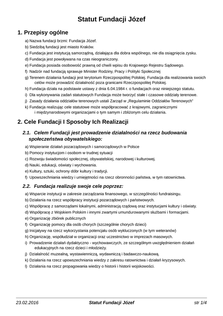 Statut Fundacji Józef 1. Przepisy ogólne a) Nazwa fundacji brzmi: Fundacja Józef. b) Siedzibą fundacji jest miasto Kraków. c) Fundacja jest instytucją samorządną, działająca dla dobra wspólnego, nie dla osiągnięcia zysku. d) Fundacja jest powoływana na czas nieograniczony. e) Fundacja posiada osobowość prawną od chwili wpisu do Krajowego Rejestru Sądowego. f) Nadzór nad fundacją sprawuje Minister Rodziny, Pracy i Polityki Społecznej g) Terenem działania fundacji jest terytorium Rzeczpospolitej Polskiej. Fundacja dla realizowania swoich celów może prowadzić działalność poza granicami Rzeczpospolitej Polskiej. h) Fundacja działa na podstawie ustawy z dnia 6.04.1984 r. o fundacjach oraz niniejszego statutu. i) Dla wykonywania zadań statutowych Fundacja może tworzyć stałe i czasowe oddziały terenowe. j) Zasady działania oddziałów terenowych ustali Zarząd w „Regulaminie Oddziałów Terenowych” k) Fundacja realizując cele statutowe może współpracować z krajowymi, zagranicznymi i międzynarodowymi organizacjami o tym samym i zbliżonym celu działania. 2. Cele Fundacji I Sposoby Ich Realizacji 2.1. Celem Fundacji jest prowadzenie działalności na rzecz budowania społeczeństwa obywatelskiego: a) Wspieranie działań pozarządowych i samorządowych w Polsce b) Pomocy instytucjom i osobom w trudnej sytuacji c) Rozwoju świadomości społecznej, obywatelskiej, narodowej i kulturowej. d) Nauki, edukacji, oświaty i wychowania. e) Kultury, sztuki, ochrony dóbr kultury i tradycji. f) Upowszechniania wiedzy i umiejętności na rzecz obronności państwa, w tym ratownictwa. 2.2. Fundacja realizuje swoje cele poprzez: a) Wsparcie instytucji w zakresie zarządzania finansowego, w szczególności fundraisingu. b) Działania na rzecz współpracy instytucji pozarządowych i państwowych. c) Współpracę z samorządami lokalnymi, administracją rządową oraz instytucjami kultury i oświaty. d) Współpracę z Wojskiem Polskim i innymi zwartymi umundurowanymi służbami i formacjami. e) Organizację zbiórek publicznych f) Organizację pomocy dla osób chorych (szczególnie chorych dzieci) g) Inicjatywy na rzecz wykorzystania potencjału osób wykluczonych (w tym weteranów) h) Organizację, współudział w organizacji oraz uczestnictwo w imprezach masowych. i) Prowadzenie działań dydaktyczno - wychowawczych, ze szczególnym uwzględnieniem działań edukacyjnych na rzecz dzieci i młodzieży. j) Działalność muzealną, wystawienniczą, wydawniczą i badawczo-naukową. k) Działania na rzecz upowszechniania wiedzy z zakresu ratownictwa i działań kryzysowych. l) Działania na rzecz propagowania wiedzy o historii i historii wojskowości. 23.02.2016 Statut Fundacji Józef str 1/4 3. Majątek Fundacji 3.1. Fundusz założycielski stanowią: a) Kwota 3000zł przyznana przez fundatorów w akcie fundacyjnym 3.2. Majątek Fundacji może pochodzić również z: a) Dodatkowych wkładów finansowych od fundatorów. b) Środków z krajowych i zagranicznych darowizn, zbiórek, zapisów i spadków. c) Odsetek od lokat kapitałowych i papierów wartościowych. d) Innych środków finansowych, rzeczowych i wartości niematerialnych od osób fizycznych, przedsiębiorców i instytucji krajowych i zagranicznych. e) Zysków z prowadzonej Działalności Gospodarczej f) Fundacja może ubiegać się o dofinansowanie swojej działalności przez inne podmioty i w sposób określony przez prawo. 3.3. Zasady zarządzania Majątkiem Fundacji: a) Fundacja prowadzi gospodarkę finansową zgodnie z obowiązującymi w tym zakresie przepisami. b) Szczegółowe Zasady gospodarki finansowej Fundacji w granicach wyznaczanych przez prawo ustala Zarząd Stowarzyszenia. c) Majątek Fundacji może być lokowany na rachunkach bankowych, w jednostkach uczestnictwa w funduszach inwestycyjnych oraz w papierach wartościowych, co nie wyklucza przyjmowania środków finansowych w gotówce d) Z zachowaniem przepisów prawa, lokowanie majątku Fundacji może być dokonywane również za granicą. e) Majątek Fundacji nie może być przeznaczony na udzielanie pożyczek lub zabezpieczanie zobowiązań w stosunku do członków Zarządu lub Rady Programowej Fundacji, pracowników oraz innych osób z którymi wyżej wspomniani pozostają w związku małżeńskim, we wspólnym pożyciu, albo w stosunku pokrewieństwa lub powinowactwa w linii prostej lub bocznej do drugiego stopnia, albo są związani z tytułu przysposobienia, opieki lub kurateli, zwanych dalej „osobami bliskimi”. f) Zabrania się przekazywania majątku Fundacji na rzecz członków jej Zarządu, Rady lub pracowników, oraz ich osób bliskich, na zasadach innych niż w stosunku do osób trzecich, w szczególności, jeżeli przekazanie to następuje bezpłatnie lub na preferencyjnych warunkach. g) Nie jest dopuszczalne wykorzystanie majątku Fundacji na rzecz członków Zarządu lub Rady Programowej Fundacji, pracowników na innych zasadach niż w stosunku do osób trzecich, chyba że to wykorzystanie bezpośrednio wynika z celu statutowego. h) Z majątku Fundacji nie może być finansowany zakup towarów lub usług od podmiotów, w których uczestniczą członkowie Zarządu lub Rady Programowej Fundacji, oraz ich osób bliskich, na zasadach innych niż w stosunku do osób trzecich lub po cenach wyższych niż rynkowe. 3.4. Działalność gospodarcza a) Podjęcie, zawieszenie lub zakończenie prowadzenia działalności gospodarczej jest możliwe na podstawie uchwały Zarządu. b) Rodzaj prowadzonej działalności jest określony we wpisie do KRS, który aktualizuje Zarząd na podstawie Uchwały Zarządu. c) Rodzaj prowadzonej działalności powinien służyć Celom Fundacji, lub wykorzystywać istniejący potencjał organizacji. 23.02.2016 Statut Fundacji Józef str 2/4 4. Rachunkowość Fundacji a) Fundacja prowadzi rachunkowość zgodnie z obowiązującymi w tym zakresie przepisami. b) Roczne sprawozdanie finansowe z działalności 