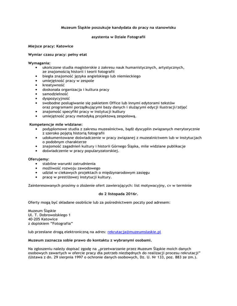 Muzeum Śląskie poszukuje kandydata do pracy na stanowisku asystenta w Dziale Fotografii Miejsce pracy: Katowice Wymiar czasu pracy: pełny etat Wymagania: • ukończone studia magisterskie z zakresu nauk humanistycznych, artystycznych, ze znajomością historii i teorii fotografii • biegła znajomość języka angielskiego lub niemieckiego • umiejętność pracy w zespole • kreatywność • doskonała organizacja i kultura pracy • samodzielność • dyspozycyjność • swobodne posługiwanie się pakietem Office lub innymi edytorami tekstów oraz programami porządkującymi bazy danych i służącymi edycji ilustracji/zdjęć • znajomość specyfiki pracy w instytucji kultury • umiejętność pracy metodyką projektową zespołową. Kompetencje mile widziane: • podyplomowe studia z zakresu muzealnictwa, bądź dyscyplin związanych merytorycznie z szeroko pojętą historią fotografii • udokumentowane doświadczenie w pracy związanej z muzealnictwem lub w instytucjach o podobnym charakterze • znajomość zagadnień kultury i historii Górnego Śląska, mile widziane publikacje • doświadczenie w pracy popularyzatorskiej. Oferujemy: • stabilne warunki zatrudnienia • możliwość rozwoju zawodowego • udział w ciekawych projektach o międzynarodowym zasięgu • pracę w prestiżowej instytucji kultury. Zainteresowanych prosimy o złożenie ofert zawierających: list motywacyjny, cv w terminie do 2 listopada 2016r. Oferty mogą być składane osobiście lub za pośrednictwem poczty pod adresem: Muzeum Śląskie Ul. T. Dobrowolskiego 1 40-205 Katowice z dopiskiem ”Fotografia” lub przesłane drogą elektroniczną na adres: [email protected] Muzeum zaznacza sobie prawo do kontaktu z wybranymi osobami. Na zgłoszeniu należy dopisać zgodę na „przetwarzanie przez Muzeum Śląskie moich danych osobowych zawartych w ofercie pracy dla potrzeb niezbędnych do realizacji procesu rekrutacji” (Ustawa z dn. 29 sierpnia 1997 o ochronie danych osobowych, Dz. U. Nr 133, poz. 883 ze zm.).