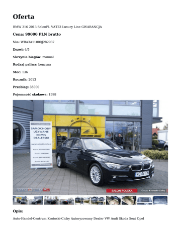 Oferta BMW 316 2013 SalonPL VAT23 Luxury Line GWARANCJA Cena: 99000 PLN brutto Vin: WBA3A11000J282937 Drzwi: 4/5 Skrzynia biegów: manual Rodzaj paliwa: benzyna Moc: 136 Rocznik: 2013 Przebieg: 35000 Pojemność skokowa: 1598 Opis: Auto-Handel-Centrum Krotoski-Cichy Autoryzowany Dealer VW Audi Skoda Seat Opel MOŻLIWOŚĆ SPRAWDZENIA POJAZDU W AUTORYZOWANEJ STACJI OBSŁUGI -----------------------------------------------------------------------------------------------------------------------------------------------------Uwaga: Miejsce ekspozycji pojazdu - Grupa Krotoski – Cichy, Salon OPEL CK Auto ul. Obornicka 125, 62-002 Poznań – Suchy Las Osoba kontaktowa tel: Patryk Czerniawski - 601 750 883 Daniel Michałowski - 781 440 156 Tel: 61 8163 358 MOŻLIWA JAZDA PRÓBNA PO WCZEŚNIEJSZYM UZGODNIENIU TERMINU -----------------------------------------------------------------------------------------------------------------------------------------------------BMW 316i LUXURY LINE Silnik 1.6 Benzyna 136KM Pierwszy właściciel - kupiony w polskim salonie BMW Samochód z GWARANCJĄ PRODUCENTA Pakiet serwisowy: BMW Service Inclusive 5/100 (pakiet serwisowy na 5 lat/100 tyś km) Data pierwszej rejestracji: 12.04.2013 Klimatyzacja elektroniczna, dwustrefowa Tapicerka skórzana Podgrzewane fotele przednie Elektryczne szyby Elektryczne lusterka Trójramienna, sportowa kierownica obszyta skórą, multufunkcyjna Czujniki parkowania z tyłu Przednie lampy przeciwmgielne Czujnik deszczu BMW Teleservices Alarm Felgi aluminiowe BMW 17" Fabryczne radio CD z gniazdem USB Fabryczny zestaw głośnomówiący Bluetooth Bezkluczykowy system odpalania samochodu Możliwość zmiany trybu jazdy (PRO ECO, COMFORT, SPORT) Komputer pokładowy 6XAIRBAG ABS Kontrola trakcji - DTC i inne FAKTURA VAT 23% - kupujący zwolniony z opłaty skarbowej, możliwość odliczenia VAT przy zakupie na firmę. -----------------------------------------------------------------------------------------------------------------------------------------------------Oferujemy kompleksową obsługę sprzedaży ratalnej na bardzo dogodnych warunkach - w celu bliższego zapoznania się z aktualną ofertą finansowania prosimy o kontakt : Daniel Michałowski tel. 781 440 156 Oferujemy ubezpieczenia samochodowe z wiodących na rynku ubezpieczalni - możliwość zakupu pakietu ubezpieczeniowego na miejscu. Oferujemy możliwość jazdy próbnej przed zakupem oraz usługę inspekcji pojazdu w autoryzowanym serwisie Opel. Przyjmujemy również w rozliczeniu każdy pojazd. -----------------------------------------------------------------------------------------------------------------------------------------------------Uwaga: Miejsce ekspozycji pojazdu - Grupa Krotoski – Cichy, Salon OPEL CK Auto ul. Obornicka 125, 62-002 Poznań – Suchy Las Osoba kontaktowa tel: Patryk Czerniawski - 601 750 883 Daniel Michałowski - 781 440 156 Tel: 61 8163 358 Godziny otwarcia: pon - pt 9.00 - 18.00 sob 9.00 - 14.00 MOŻLIWA JAZDA PRÓBNA PO WCZEŚNIEJSZYM UZGODNIENIU TERMINU -----------------------------------------------------------------------------------------------------------------------------------------------------Ogłoszenie ma charakter informacyjny i stanowi zaproszenie do zawarcia umowy (art. 71 Kodeksu cywilnego); nie stanowi natomiast oferty handlowej w rozumieniu art. 66 § 1 Kodeksu cywilnego. W celu sprawdzenia zgodności oferty oraz uzyskania wszelkich informacji prosimy kontaktować się z handlowcem d.s. samochodów używanych Auto możesz zobaczyć: Grupa Krotoski – Cichy, Salon OPEL CK Auto ul. Obornicka 125, 62-002 Poznań – Suchy Las Tel: 61 8163 358 Patryk Czerniawski GSM: 601 750 883 e-mail: [email protected] Daniel Michałowski GSM: 781 440 156 e-mail: [email protected]