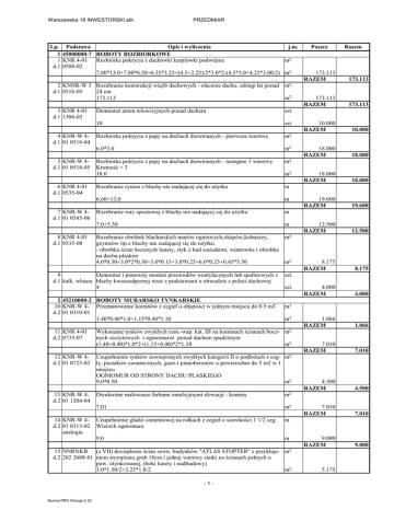 Warszawska 18 INWESTORSKI.ath Lp. 1 1 d.1 PRZEDMIAR Podstawa Opis i wyliczenia j.m. 45000000-7 ROBOTY ROZBIÓRKOWE KNR 4-01 Rozbiórka pokrycia z dachówki karpiówki podwójnie m2 0508-02 7.80*13.0+7.80*6.50+6.35*3.25+(4.5+2.25)/2*3.0*2-(4.5*3.0+4.25*3.00/2) m2 2 KNNR-W 3 Rozebranie konstrukcji więźb dachowych - ołacenie dachu; odstęp łat ponad m2 d.1 0516-05 24 cm 173.113 m2 3 KNR 4-01 d.1 1306-02 4 KNR-W 4d.1 01 0518-04 5 KNR-W 4d.1 01 0518-05 6 KNR 4-01 d.1 0535-04 7 KNR-W 4d.1 01 0545-06 8 KNR 4-01 d.1 0535-08 DemontaŜ anten telewizyjnych ponad dachem szt. 10 szt. Rozbiórka pokrycia z papy na dachach drewnianych - pierwsza warstwa m2 6.0*3.0 m2 Rozbiórka pokrycia z papy na dachach drewnianych - następne 3 warstwy Krotność = 3 18.0 m2 Rozebranie rynien z blachy nie nadającej się do uŜytku m 6.60+13.0 m Rozebranie rury spustowej z blachy nie nadającej się do uŜytku m 7.0+5.50 m Rozebranie obróbek blacharskich murów ogniowych,okapów,kołnierzy, m2 gzymsów itp.z blachy nie nadającej się do uŜytku - obróbka ścian bocznych lunety, styk z bud sasiednim, wiatrowka i obrobka na dachu plaskim 4.0*0.30+3.0*2*0.30+3.0*0.15+3.0*0.25+6.0*0.25+0.45*5.50 m2 9 DemontaŜ i ponowny montaŜ przewodów wentylacynych lub spalinowych z d.1 kalk. własna blachy kwasoodpornej wraz z podstawami o obwodzie z polaci dachowej 4 2 45210000-2 ROBOTY MURARSKO TYNKARSKIE 10 KNR-W 4- Przemurowanie kominów z cegieł o objętości w jednym miejscu do 0.5 m3 d.2 01 0310-01 1.40*0.40*1.0+1.15*0.40*1.10 11 KNR 4-01 d.2 0735-07 12 KNR-W 4d.2 01 0725-03 13 KNR-W 4d.2 01 1204-04 14 KNR-W 4d.2 01 0313-02 analogia m2 szt. 173.113 RAZEM 173.113 173.113 RAZEM 173.113 10.000 RAZEM 10.000 18.000 RAZEM 18.000 18.000 RAZEM 18.000 19.600 RAZEM 19.600 12.500 RAZEM 12.500 8.175 RAZEM 8.175 4.000 RAZEM 4.000 1.066 RAZEM 1.066 7.010 RAZEM 7.010 4.500 RAZEM 4.500 7.010 RAZEM 7.010 9.000 RAZEM 9.000 m3 m3 Uzupełnienie tynków zewnętrznych zwykłych kategorii II o podłoŜach z ceg- m2 ły, pustaków ceramicznych, gazo-i pianobetonów o powierzchni do 5 m2 w 1 miejscu OGNIOMUR OD STRONY DACHU PŁASKIEGO 9.0*0.50 m2 Dwukrotne malowanie farbami emulsyjnymi elewacji - kominy m2 7.01 m2 Uzupełnienie gładzi cementowej na rolkach z cegieł o szerokości 1 1/2 ceg. Wierzch ogniomura m 9.0 m 15 NNRNKB (z.VII) docieplenie ścian zewn. budynków "ATLAS STOPTER" z przykleje- m2 d.2 202 2608-01 niem styropianu grub 10cm i jednej warstwy siatki na ścianach pełnych o pow. otynkowanej, (boki lunety i nadbudowy) 3.0*1.50/2+3.25*1.8/2 m2 Norma PRO Wersja 4.22 Razem szt. Wykonanie tynków zwykłych cem.-wap. kat. III na kominach ścianach bocz- m2 nych szczytowych i ogniomurze ponad dachem spadzistym (1.40+0.40)*1.0*2+(1.15+0.40)*2*1.10 m2 -1- Poszcz 5.175 Warszawska 18 INWESTORSKI.ath Lp. Podstawa PRZEDMIAR Opis i wyliczenia 16 NNRNKB (z.VII) docieplenie ścian zewn. budynków "ATLAS STOPTER" - ochrona d.2 202 2608-08 naroŜników wypukłych na styropianie z dod. wzmocnieniem jedną warstwą siatki 1.90*2+2.25 17 KNR-W 2d.2 02 0612-03 3 18 KNR 4-01 d.3 0419-02 19 KNR-W 4d.3 01 0416-02 20 KNR-W 4d.3 01 0416-04 21 KNR-W 4d.3 01 0417-01 4 24 KNR-W 2d.4 02 0515-02 Poszcz RAZEM m ROBOTY CIESIELSKIE Wykonanie rusztowania przy kominach o obw. od 2 do 5 m szt. 2.00 szt. Wymiana elementów konstrukcyjnych dachu - krokwie zwykłe m 6.0 m Wymiana elementów konstrukcyjnych dachu - murłaty i podwaliny m 3.0 m Wzmocnienie krokwi przez nabicie jednostronnie desek grubości 32 mm m 6.0*6 m 6.050 RAZEM 6.050 8.125 RAZEM 8.125 2.000 RAZEM 2.000 6.000 RAZEM 6.000 3.000 RAZEM 3.000 36.000 RAZEM 36.000 72.500 RAZEM 72.500 3.600 RAZEM 3.600 m2 m2 Wymiana deskowania dachu z desek o grubości 25 mm na styk m2 - wycięcie zgnitych i zmurszałych desek na dachu pod pokrycie z papy i przybicie nowych - przyjęto 20 % powIerzchni 18.0*0.2 m2 OBRÓBKI BLACHARSKIE RYNNY I RURY SPUSTOWE Obróbki przy szerokości w rozwinięciu ponad 25 cm - z blachy z cynkowoty- m2 tanowej 6.0*0.32+4.0*0.32+3.0*2*0.32+3.25*0.50*2+3.0*0.25+3.0*0.28+6.0*0.28+ m2 6.0*0.50+5.50*0.45+3.0*0.45 18.465 RAZEM 25 NNRNKB Obróbki blacharskie z blachy powlekanej o szer.w rozwinięciu do 25 cm d.4 202 0541-01 0.25*3.0*2+6.0*0.25+2.90*0.25+1.85*2*0.25 m2 26 KNR-W 2d.4 02 0520-04 Rynny dachowe półokrągłe o śr. 15 cm - z blachy z cynkowotytanowej m 19.60 m Rury spustowe okrągłe o śr. 12 cm - z blachy z cynkowotytanowej m 12.50 m 27 KNR-W 2d.4 02 0527-03 Razem 5.175 m Izolacje cieplne i przeciwdźwiękowe z wełny mineralnej poziome z płyt ukła- m2 danych na sucho - jedna warstwa grub 12cm Skos poddasza nad kuchnią 2.50*3.25 m2 22 KNNR-W 3 Dwukrotna impregnacja grzybobójcza drewna metodą smarowania drewna d.3 0504-04 preparatami solowymi - bale i krawędziaki - drewniana konstrukcja dachu 72.50 23 KNR-W 4d.3 01 0418-02 j.m. m2 18.465 4.650 RAZEM 4.650 19.600 RAZEM 19.600 12.500 RAZEM 12.500 5 POKRYCIE DACHOWE Z DACHÓWKI ZAKŁADKOWEJ CEMENTOWEJ CZERWONEJ "S" 28 KNR 0-15II Pokrycie dachów nieodeskowanych dachówką ceramiczną z otworami z przy- m2 d.5 0517-01 kręceniem wkrętami - ułoŜenie na krokwiach ekranu zabezpieczającego z folii 173.113 m2 173.113 RAZEM 173.113 29 KNR 0-15II Pokrycie dachów nieodeskowanych dachówką ceramiczną z otworami z przy- m2 d.5 0517-02 kręceniem wkrętami impregnacja, przycięcie i przybicie kontrłat i łat 173.113 m2 173.113 RAZEM 173.113 -2- Norma PRO Wersja 4.22 Warszawska 18 INWESTORSKI.ath PRZEDMIAR Lp. Podstawa Opis i wyliczenia 30 KNR AT-09 Dachówki cementowe podwójne S kolor czerwony IBF Bolesławiec d.5 0701-02 dachówka zwykła dachówka krawędziowa, lewa/prawa 173.113 j.m. m2 m2 31 KNR AT-09 Dachówki cementowe podwójne S IBF Bolesławiec - dachówki specjalne d.5 0701-04 wywietrznikowa 2.00 szt. 32 KNR AT-09 Dachówki cementowe IBF Bolesławiec ; kalenica - gąsiory podstawowe d.5 0702-01 4.50+2.50+8.90 m szt. m 33 KNR AT-09 Dachówki cementowe IBF Bolesławiec ; kalenica - gąsior początkowy i koń- szt. d.5 0702-0