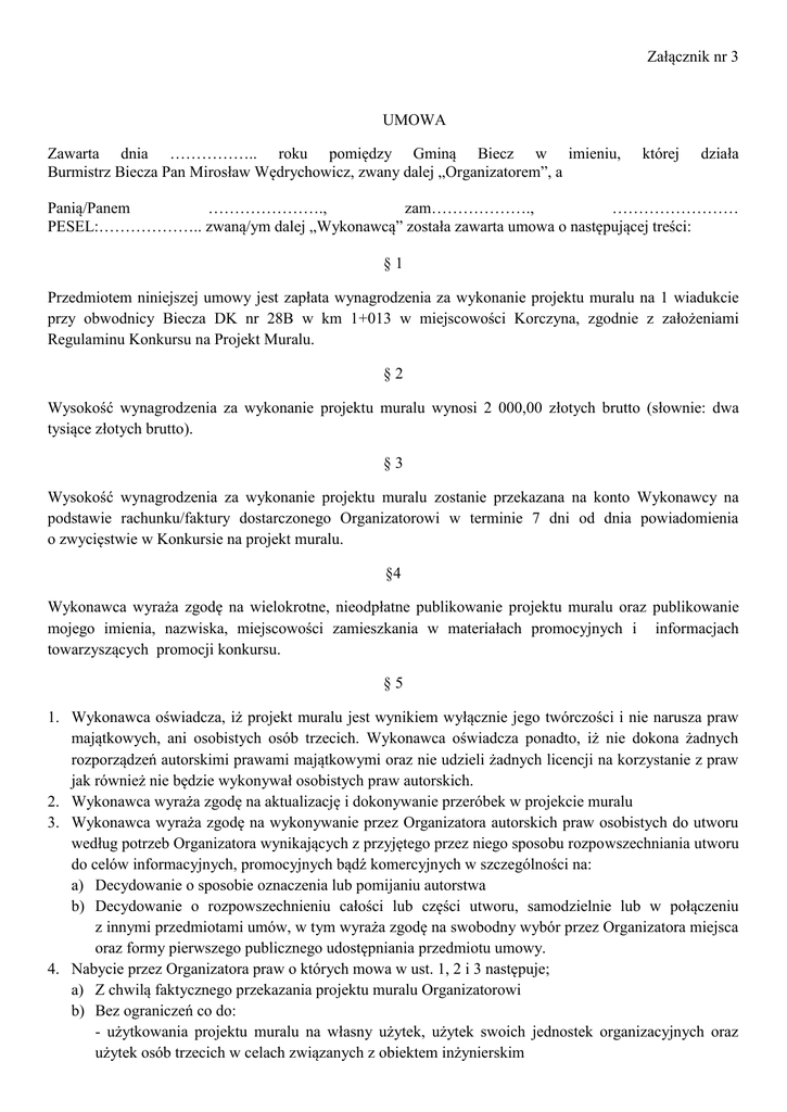 Załącznik nr 3 UMOWA Zawarta dnia …………….. roku pomiędzy Gminą Biecz w imieniu, Burmistrz Biecza Pan Mirosław Wędrychowicz, zwany dalej „Organizatorem”, a której działa Panią/Panem …………………., zam………………., …………………… PESEL:……………….. zwaną/ym dalej „Wykonawcą” została zawarta umowa o następującej treści: §1 Przedmiotem niniejszej umowy jest zapłata wynagrodzenia za wykonanie projektu muralu na 1 wiadukcie przy obwodnicy Biecza DK nr 28B w km 1+013 w miejscowości Korczyna, zgodnie z założeniami Regulaminu Konkursu na Projekt Muralu. §2 Wysokość wynagrodzenia za wykonanie projektu muralu wynosi 2 000,00 złotych brutto (słownie: dwa tysiące złotych brutto). §3 Wysokość wynagrodzenia za wykonanie projektu muralu zostanie przekazana na konto Wykonawcy na podstawie rachunku/faktury dostarczonego Organizatorowi w terminie 7 dni od dnia powiadomienia o zwycięstwie w Konkursie na projekt muralu. §4 Wykonawca wyraża zgodę na wielokrotne, nieodpłatne publikowanie projektu muralu oraz publikowanie mojego imienia, nazwiska, miejscowości zamieszkania w materiałach promocyjnych i informacjach towarzyszących promocji konkursu. §5 1. Wykonawca oświadcza, iż projekt muralu jest wynikiem wyłącznie jego twórczości i nie narusza praw majątkowych, ani osobistych osób trzecich. Wykonawca oświadcza ponadto, iż nie dokona żadnych rozporządzeń autorskimi prawami majątkowymi oraz nie udzieli żadnych licencji na korzystanie z praw jak również nie będzie wykonywał osobistych praw autorskich. 2. Wykonawca wyraża zgodę na aktualizację i dokonywanie przeróbek w projekcie muralu 3. Wykonawca wyraża zgodę na wykonywanie przez Organizatora autorskich praw osobistych do utworu według potrzeb Organizatora wynikających z przyjętego przez niego sposobu rozpowszechniania utworu do celów informacyjnych, promocyjnych bądź komercyjnych w szczególności na: a) Decydowanie o sposobie oznaczenia lub pomijaniu autorstwa b) Decydowanie o rozpowszechnieniu całości lub części utworu, samodzielnie lub w połączeniu z innymi przedmiotami umów, w tym wyraża zgodę na swobodny wybór przez Organizatora miejsca oraz formy pierwszego publicznego udostępniania przedmiotu umowy. 4. Nabycie przez Organizatora praw o których mowa w ust. 1, 2 i 3 następuje; a) Z chwilą faktycznego przekazania projektu muralu Organizatorowi b) Bez ograniczeń co do: - użytkowania projektu muralu na własny użytek, użytek swoich jednostek organizacyjnych oraz użytek osób trzecich w celach związanych z obiektem inżynierskim - zwielokrotnianie projektu muralu dowolną techniką w dowolnej ilości - wyświetlanie i odtwarzanie całości lub wybranych fragmentów projektu muralu - wykorzystanie w utworach multimedialnych - wykorzystanie całości lub fragmentów projektu do celów promocyjnych i reklamy. 5. W razie gdy jakikolwiek podmiot trzeci wystąpi z roszczeniem odszkodowawczym albo z roszczeniem o naruszenie osobistych lub majątkowych praw autorskich do projektu muralu, Organizator zawiadomi Wykonawcę o tym fakcie. Wówczas Wykonawca zobowiązany będzie do przystąpienia do sporu po stronie Organizatora w terminie 14 dni 6. Wykonawca zwróci Organizatorowi wszelkie zapłacone przez niego koszty stanowiące zapłatę na rzecz podmiotów trzecich tytułu roszczenia o jakich mowa w ustępie poprzedzającym. 7. Wykonawca zobowiązuje się, że wykonując przedmiot porozumienia będzie przestrzegał przepisów ustawy z dnia 4 lutego 1994 r. o prawie autorskim i prawach pokrewnych (Dz. U. z 2006 r., Nr 90 poz. 631 ze zm.) i nie naruszy praw majątkowych osób trzecich, a projekt muralu przekaże Organizatorowi w stanie wolnym od obciążeń prawami tych osób. §6 1. Wszelkie zmiany treści umowy mogą być dokonane wyłącznie za obopólnym porozumieniem stron i wymagają formy pisemnej (aneksu) pod rygorem nieważności. 2. W sprawach nieuregulowanych niniejszą umową będą miały zastosowanie przepisy kodeksu cywilnego. 3. Wszelkie spory mogące wyniknąć w związku z realizacją niniejszej umowy będą rozstrzygane przez sąd Rejonowy w Gorlicach. 4. Umowę sporządzono w trzech jednobrzmiących egzemplarzach, dwa dla Organizatora i jeden dla Wykonawcy. ………………………………………….. Wykonawca ……………………………… Organizator