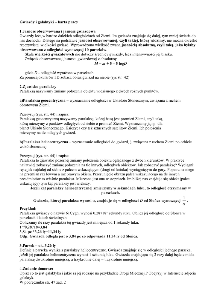 Gwiazdy i galaktyki – karta pracy 1.Jasność obserwowana i jasność gwiazdowa Gwiazdy leżą w bardzo dalekich odległościach od Ziemi. Im gwiazda znajduje się dalej, tym mniej światła do nas dochodzi. Dlatego na podstawie jasności obserwowanej, czyli takiej, którą widzimy, nie można określić rzeczywistej wielkości gwiazd. Wprowadzono wielkość zwaną jasnością absolutną, czyli taką, jaka byłaby obserwowana z odległości wynoszącej 10 parseków. Skala wielkości gwiazdowych nie dotyczy średnicy gwiazdy, lecz intensywności jej blasku. Związek obserwowanej jasności gwiazdowej z absolutną: M = m + 5 – 5 logD gdzie D - odległość wyrażona w parsekach. Za pomocą okularów 3D zobacz obraz gwiazd na niebie (rys str 42) 2.Zjawisko paralaksy Paralaksą nazywamy zmianę położenia obiektu widzianego z dwóch rożnych punktów. a)Paralaksa geocentryczna – wyznaczanie odległości w Układzie Słonecznym, związana z ruchem obrotowym Ziemi, Przerysuj (rys. str. 44) i zapisz: Paralaksą geocentryczną nazywamy paralaksę, której bazą jest promień Ziemi, czyli taką, którą mierzymy z punktów odległych od siebie o promień Ziemi. Wyznaczamy ją np. dla planet Układu Słonecznego, Księżyca czy też sztucznych satelitów Ziemi. Ich położenia mierzymy na tle odległych gwiazd. b)Paralaksa heliocentryczna – wyznaczanie odległości do gwiazd, ), związana z ruchem Ziemi po orbicie wokółsłonecznej. Przerysuj (rys. str. 44) i zapisz: Paralaksa to zjawisko pozornej zmiany położenia obiektu oglądanego z dwóch kierunków. W praktyce najłatwiej zobaczyć zmianę położenia na tle innych, odległych obiektów. Jak zobaczyć paralaksę? Wyciągnij rękę jak najdalej od siebie z palcem wskazującym (drugi od kciuka) wyciągniętym do góry. Popatrz na niego na przemian raz lewym a raz prawym okiem. Przesunięcie obrazu palca wskazującego na tle innych przedmiotów to właśnie paralaksa. Mierzona jest ona w stopniach. Im bliżej nas znajduje się obiekt (palec wskazujący) tym kąt paralaksy jest większy. Jeżeli kąt paralaksy heliocentrycznej zmierzymy w sekundach łuku, to odległość otrzymamy w parsekach. Gwiazda, której paralaksa wynosi α, znajduje się w odległości D od Słońca wynoszącej 1  . Przykład: Paralaksa gwiazdy o nazwie 61Cygni wynosi 0,28718” sekundy łuku. Oblicz jej odległość od Słońca w parsekach i latach świetlnych. Obliczamy ile razy paralaksa tej gwiazdy jest mniejsza od 1 sekundy łuku. 1”/0,28718=3,84 3,84 pc *3,26 ly=11,34 ly Odp: Gwiazda odległa jest o 3,84 pc co odpowiada 11,34 ly od Słońca. 3.Parsek – ok. 3,26 ly Definicja parseka wynika z paralaksy heliocentryczne. Gwiazda znajduje się w odległości jednego parseka, jeżeli jej paralaksa heliocentryczna wynosi 1 sekundę łuku. Gwiazda znajdująca się 2 razy dalej będzie miała paralaksę dwukrotnie mniejszą, a trzykrotnie dalej – trzykrotnie mniejszą. 4.Zadanie domowe: Opisz co to jest galaktyka i jakie są jej rodzaje na przykładzie Drogi Mlecznej.? Obejrzyj w Internecie zdjęcia galaktyk. W podręczniku str. 47 zad. 2