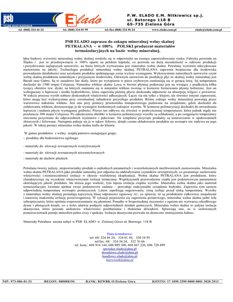 P .W . EL AD O E. M. Ni tk i e wicz s p .j . ul . Ba t or e g o 11 8 B 65-7 35 Z i el on a G óra tel. (068) 324 44 24 tel. (068) 324 01 99 tel./fax (068) 324 56 24 www.elado.com.pl [email protected] PSB ELADO zaprasza do zakupu mineralnej wełny skalnej PETRALANA - w 100% POLSKI producent materiałów termoizolacyjnych na bazie wełny mineralnej. Idea budowy wytwórni mineralnej wełny skalnej zrodziła się w odpowiedzi na rosnące zapotrzebowanie rynku. Fabryka powstała na Śląsku i jest to przedsięwzięcie w 100% oparte na polskim kapitale, co pozwala na dużą niezależność w zakresie produkcji i pozyskiwania najlepszych surowców, na bazie których wytwarzana jest mineralna wełna skalna. Petralanę wyróżnia zdecydowane nastawienie na jakość. Technologia produkcji mineralnej wełny skalnej PETRALANA zapewnia bezpieczne dla środowiska prowadzenie działalności oraz uzyskanie produktu spełniającego coraz wyższe wymagania. Wykorzystanie naturalnych surowców czyni wełnę skalną produktem naturalnym i przyjaznym środowisku. Głównym surowcem do produkcji płyt ze skalnej wełny mineralnej jest Bazalt oraz Gabro. Są to zasadowe lite skały, które po wytopieniu w piecu szybowym zamieniają się w gorącą lawę. Jej temperatura dochodzi do 1500 stopni Celsjusza. Naturalne włókno skalne Lawa w formie płynnej podawana jest na wirujące z prędkością kilku tysięcy obrotów tzw. dyski, na których zamienia się w naturalne włókno tworząc w komorze formowania płynny kobierzec. Jest on wzbogacany o lepiszcze i środki hydrofobowe, które zapewnią później płycie doskonałą odporność na absorpcję wilgoci z powietrza. W trakcie procesu wyrób nabiera doskonałych właściwości adhezyjnych. Łączy się nie tylko z klejem, ale również innymi zaprawami, które mogą być wykorzystane przy ewentualnej zabudowie przyszłego produktu. Różne rodzaje wełny mineralnej powstają przez warstwowo nałożone włókno. Jest ono przy pomocy przenośnika transportowego podawane na urządzenie, gdzie dochodzi do zafalowania włókien, dostosowując je do wymogów konkretnych rodzajów wyrobu. W komorze polimeryzacji dochodzi do utwardzenia lepiszcza i nadania płycie wymaganej grubości. Proces ten odbywa się również w podwyższonej temperaturze, która jednak nigdy nie przekracza 300 stopni Celsjusza. Po zakończeniu obróbki w komorze polimeryzacji wyroby są schładzane, a po osiągnięciu temperatury otoczenia przycinane do odpowiednich wymiarów i pakowani. Na sztaplarce przycięte produkty są umieszczanie w opakowaniach zbiorczych i foliowane. Następnie pakuje się je w rękaw foliowy, dzięki czemu składowanie produktu na zewnątrz nie wpływa na jego jakość. W takiej postaci mineralna wełna skalna trafia do klienta. W gamie produktów z wełny znajdą państwo następujące grupy: - produkty dla budownictwa ogólnego - materiały do elewacji zewnętrznych wentylowanych - materiały do elewacji zewnętrznych niewentylowanych - materiały do dachów płaskich Petralana tworzy jedyny, niepowtarzalny produkt o unikalnych parametrach i wszechstronnych możliwościach zastosowania. Mineralna wełna skalna PETRALANA jako produkt naturalny jest odporna na oddziaływanie czynników zewnętrznych, co gwarantuje zachowanie właściwości i nienaruszalności izolacji w okresie wieloletniej eksploatacji. Wełna skalna PETRALANA jest produktem, który charakteryzuje się wysokimi właściwościami izolacji termicznej. Współczynnik przewodzenia ciepła jest podstawowym parametrem określającym jakość produktu. Im niższa jego wartość, tym lepsza izolacja cieplna wyrobu. Mineralna wełna skalna jako materiał termoizolacyjny świetnie spełnia swoje podstawowe zadanie – powoduje maksymalne ocieplenie budynku. Zapewnia tym samym odpowiednią temperaturę wewnątrz pomieszczeń. Latem zapobiega nagrzewaniu, zimą izoluje przed niską temperaturą. Wyroby z mineralnej wełny skalnej posiadają najwyższą klasę odporności ogniowej A1, co sprawia, że są produktami całkowicie niepalnymi i stanowią znakomitą izolację przeciwogniową. W sytuacji pojawienia się zagrożenia pożarowego, mineralna wełna skalna pełni rolę zabezpieczenia, które opóźnia rozprzestrzenianie się płomieni. Ponadto w bezpośredniej styczności z ogniem nie wytwarza szkodliwego dymu i płonących kropli, co z kolei ułatwia podjęcie odpowiednich działań gaśniczych. Mineralna wełna skalna to jedyna izolacja akustyczna, która posiada unikatowe właściwości pochłaniania i tłumienia dźwięków. Sprawiają one, że w izolowanych pomieszczeniach panuje atmosfera pełna ciszy i spokoju. Izolacja akustyczna pozwala na skuteczne zmniejszenie hałasu. Materiały Petralana można nabyć w PSB ELADO w Zielonej Górze ul. Batorego 118 B Dane kontaktowe: tel: 68/ 324 44 24, 324 01 50, 320 34 95 tel/fax: 68/ 324 56 24, 322 76 66 tel. kom.: 604 914 144, 606 889 308, 668 667 226, 606 720 499 [email protected] [email protected] [email protected] [email protected] NIP: 973-086-01-51 REGON: 080088194 BANK: BZWBK O/Zielona Góra KONTO: 17 1090 2590 0000 0001 3028 2913