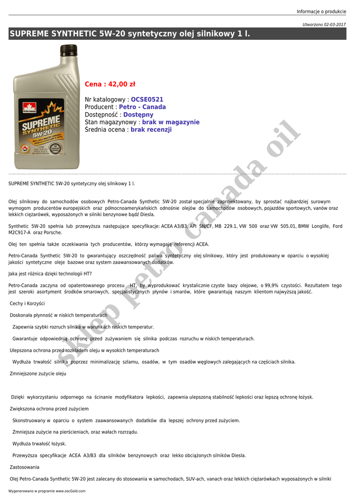 Informacje o produkcie Utworzono 02-03-2017 SUPREME SYNTHETIC 5W-20 syntetyczny olej silnikowy 1 l. Cena : 42,00 zł da oi l Nr katalogowy : OCSE0521 Producent : Petro - Canada Dostępność : Dostępny Stan magazynowy : brak w magazynie Średnia ocena : brak recenzji ca na SUPREME SYNTHETIC 5W-20 syntetyczny olej silnikowy 1 l. Olej silnikowy do samochodów osobowych Petro-Canada Synthetic 5W-20 został specjalnie zaprojektowany, by sprostać najbardziej surowym wymogom producentów europejskich oraz północnoamerykańskich odnośnie olejów do samochodów osobowych, pojazdów sportowych, vanów oraz lekkich ciężarówek, wyposażonych w silniki benzynowe bądź Diesla. Synthetic 5W-20 spełnia lub przewyższa następujące specyfikacje: ACEA A3/B3, API SN/CF, MB 229.1, VW 500 oraz VW 505.01, BMW Longlife, Ford M2C917-A oraz Porsche. tr o Olej ten spełnia także oczekiwania tych producentów, którzy wymagają referencji ACEA. Petro-Canada Synthetic 5W-20 to gwarantujący oszczędność paliwa syntetyczny olej silnikowy, który jest produkowany w oparciu o wysokiej jakości syntetyczne oleje bazowe oraz system zaawansowanych dodatków. pe Jaka jest różnica dzięki technologii HT? Petro-Canada zaczyna od opatentowanego procesu HT, by wyprodukować krystalicznie czyste bazy olejowe, o 99,9% czystości. Rezultatem tego jest szeroki asortyment środków smarowych, specjalistycznych płynów i smarów, które gwarantują naszym klientom najwyższą jakość. p Cechy i Korzyści Doskonała płynność w niskich temperaturach le Zapewnia szybki rozruch silnika w warunkach niskich temperatur. sk Gwarantuje odpowiednią ochronę przed zużywaniem się silnika podczas rozruchu w niskich temperaturach. Ulepszona ochrona przed rozkładem oleju w wysokich temperaturach Wydłuża trwałość silnika poprzez minimalizację szlamu, osadów, w tym osadów węglowych zalegających na częściach silnika. Zmniejszone zużycie oleju Dzięki wykorzystaniu odpornego na ścinanie modyfikatora lepkości, zapewnia ulepszoną stabilność lepkości oraz lepszą ochronę łożysk. Zwiększona ochrona przed zużyciem Skonstruowany w oparciu o system zaawansowanych dodatków dla lepszej ochrony przed zużyciem. Zmniejsza zużycie na pierścieniach, oraz wałach rozrządu. Wydłuża trwałość łożysk. Przewyższa specyfikacje ACEA A3/B3 dla silników benzynowych oraz lekko obciążonych silników Diesla. Zastosowania Olej Petro-Canada Synthetic 5W-20 jest zalecany do stosowania w samochodach, SUV-ach, vanach oraz lekkich ciężarówkach wyposażonych w silniki Wygenerowano w programie www.oscGold.com benzynowe bądź Diesla. W okresie pomiędzy wymianami olej ten może być także stosowany jako dolewka do konwencjonalnego oleju silnikowego o takiej samej klasie lepkości. Najlepsze efekty będą jednakże osiągnięte dzięki całkowitej zmianie oleju i filtra. Olej silnikowy do samochodów osobowych Petro-Canada Synthetic 5W-20 może zapewnić dodatkową ochronę oraz spokój użytkowników podczas jazdy w różnego rodzaju surowych warunkach, takich jak: krótkie podróże częste zatrzymywanie i ruszanie przy znaczącym wykorzystaniu biegu jałowego ciągnięcie przyczepy (jazda z przyczepą) wydłużona jazda autostradą przy dużych prędkościach oi l szczególnie wysokie lub niskie temperatury Nawet jeśli używasz najnowocześniejszego syntetycznego oleju silnikowego, zalecamy postępowanie zgodnie z instrukcjami producentów pojazdów w celu dokonania zmian oleju i filtrów tak często jak to potrzebne. sk le p pe tr o ca na da Kliknij aby pobrać specyfikacje PDF