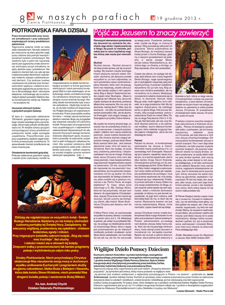 8 w naszych parafiach Ziemia Piotrkowska PIOTRKOWSKA FARA DZISIAJ Prace konserwatorskie przy szczycie schodkowym i przy szkarpach wspierających ściany prezbiterium zakończone. Tegoroczne zadanie niosło ze sobą wiele niewiadomych. Nie było wiadomo jak zniszczone są stare gotyckie cegły przez ostatnie lata pokryte twardym i szczelnym tynkiem cementowym. Nie wiadomo było w jakim tak naprawdę stanie jest sygnaturka (mała dzwonnica) wieńcząca szczyt schodkowy na styku dachów nawy i prezbiterium. Nie wiadomo również było czy uda się bez rozbierania połaci dachowych wybudować misterne, wiszące rusztowanie ponad dachami. Czy podczas budowy rusztowania lub podczas prac konserwatorskich spękana i osłabiona konstrukcyjnie sygnaturka po prostu nie runie w dół przebijając dach i starożytne sklepienia, roztrzaskując się na czarno-białych płytach posadzki.Niektóre obawy konserwatorów ziściły się. Niektóre – na szczęście nie. Usuwanie wtórnych tynków z gotyckich przypór (szkarp). W lipcu b.r. rozpoczęto odsłanianie 700-letnich, gotyckich cegieł spod grubego i bardzo twardego tynku cementowego, którym były pokryte od kilkudziesięciu lat. W obrębie szkarp (przypór) wzmacniających ściany prezbiterium praktycznie każda cegła wymagała uzupełnienia. Pracochłonność prac przy uzupełnianiu ubytków cegieł wielokrotnie przewyższyły oczekiwania. To spowodowało również przedłużenie się czasu trwania prac. Odnalezienie kamieniarki gotyckiej. Podczas odsłaniania gotyckich szkarp z warstw tynku wykonawcy natrafili na Pójść za Jezusem to znaczy zawierzyć Pierwszymi elementami powierzenia się Jezusowi są: szukanie Go, słuchanie Jego słowa i wpatrywanie się w Niego. Na pozór to niewiele, jednakże jest to rzecz kapitalnej wagi, bez której cała reszta jest niemożliwa. niespodziewania na detale kamienne – będące prostymi w formie gzymsami wieńczącymi uskok pierwszej kondygnacji.Było to o tyle zaskakujące, że zabytkowego detalu architektonicznego nie odnaleziono dotychczas nigdzie w obrębie murów kościoła farnego. Niestety detale kamieniarskie były znacznie uszkodzone. Ubytki były na tyle duże, że nie było możliwe ich eksponowanie.Podjęto decyzję o ich częściowej rekonstrukcji. Prace poprzedziła analiza formalna – mówiąc wprost kamiennym detalom należało długo się przyglądać aby właściwie odczytać ich pierwotny kształt. Rozpoczęto od przygotowania mas uzupełniających o odpowiednich właściwościach dopasowanych do właściwości fizycznych starego kamienia. Dobranie właściwych spoiw, kruszyw i koloru pozwoliły na wykonanie uzupełnień w pełni imitujących zabytkowy kamień. Aby uzyskać ostateczny efekt przeprowadzono wiele prób i włożono bardzo dużo pracy – jednak uważamy, że rezultat znajdzie uznanie zarówno laików jak i specjalistów. (cdn…) Piotr Obłog Zbliżają się najpiękniejsze ze wszystkich świąt - Święta Bożego Narodzenia. Będziemy po raz kolejny obchodzić cudowną pamiątkę tej Świętej Nocy. Zasiądziemy do wieczerzy wigilijnej, przełamiemy się opłatkiem - chlebem braterstwa, zgody i miłości. Przy migocącym światełku zabrzmi kolęda „Bóg się rodzi, moc truchleje”. Ileż otuchy i radości mieści się w słowach tej kolędy. Zmęczeni walką z przeciwnościami tak bardzo pragniemy pokoju i wytchnienia po całym roku pracy. Drodzy Piotrkowianie. Niech przychodzący Chrystus obdarowuje Was nieustannie swoją mocą w duchowym wysiłku umiłowania Eucharystii i pragnieniem służby drugiemu człowiekowi. Matka Boża z Betlejem i Nazaretu, która dała światu Słowo Wcielone, niech prowadzi Was drogami światła, pokoju i zawierzenia Bożej Miłości. Ks. kan. Andrzej Chycki Dziekan Dekanatu Piotrkowskiego 1 9 g r u d n i a 2 0 1 3 r. Słuchać Słuchać Jezusa... Słuchać Jezusa to nie taka prosta sprawa, jak się na pozór wydaje. My bowiem zwykle słuchając innych słyszymy samych siebie. Owszem, słuchamy, ale słyszymy przede wszystkim to, co nam odpowiada, co nam potwierdza nasze wyobrażenia i plany. Nowości, które nam nie pasują, które nas niepokoją, zwykle odrzucamy, albo bardzo szybko o nich zapominamy. Bóg w Starym Testamencie bardzo często mówi: Słuchajcie... Słowo to występuje tam kilkaset razy. Jezus też często zachęca do słuchania, powtarza kilkakrotnie wezwanie: Kto ma uszy do słuchania, niechaj słuch7. Mieć uszy do słuchania... nie tylko do potwierdzania swoich przemyśleń i idei, ale do słuchania Ewangelii, czyli czegoś nowego, bo Ewangelia to po polsku Dobra Nowina. My zwykle nie chcemy słuchać tego, co wzywa nas do prawdziwej zmiany życia, co nas wyrywa z naszych przyzwyczajeń i odbiera nam naszą codzienną pewność, nasze ludzkie bezpieczeństwo. Nie chcemy słuchać czegoś absolutnie nowego, podczas kiedy Słowo Boże zawsze takim jest. Jest zawsze absolutnie nowe, inne niż nasze wyobrażenia. Nam się wydaje, że poza ową codzienną pewnością i bezpieczeństwem nie ma nic innego. Podczas kiedy Jezus Chrystus chce nam dać nową pewność, nowe bezpieczeństwo. Jego pewność i bezpieczeństwo oparte na zawierzeniu. On wie, że poza Nim tak naprawdę nie ma pewności i bezpieczeństwa, że inna pewność i bezpieczeństwo niż On są złudne. On chce nas doprowadzić do takiego przekonania, jakie zrodziło się w pewnym momencie u św. Piotra: Panie, do kogóż pójdziemy? Ty masz słowa życia wiecznego (J 6, 68). Dlatego Słowo, które do nas przychodzi, nie jest nam dawane do zapamiętania.Chrześcijaństwa, Jezusa Chrys-tusa nie można się nauczyć, tak jak uczymy się biologii, czy chemii, albo historii. Słowo Boże Jezus Chrystus jest dawany nam do medytacji. O Maryi Pismo mówi, że zachowywała wszystkie te sprawy (słowa) i rozważała je w swoim sercu (Łk 2, 19). Medytacja ta jednak, jak widać na przykładzie Maryji, nie polega na intelektualnej obróbce otrzymanego Słowa, która
