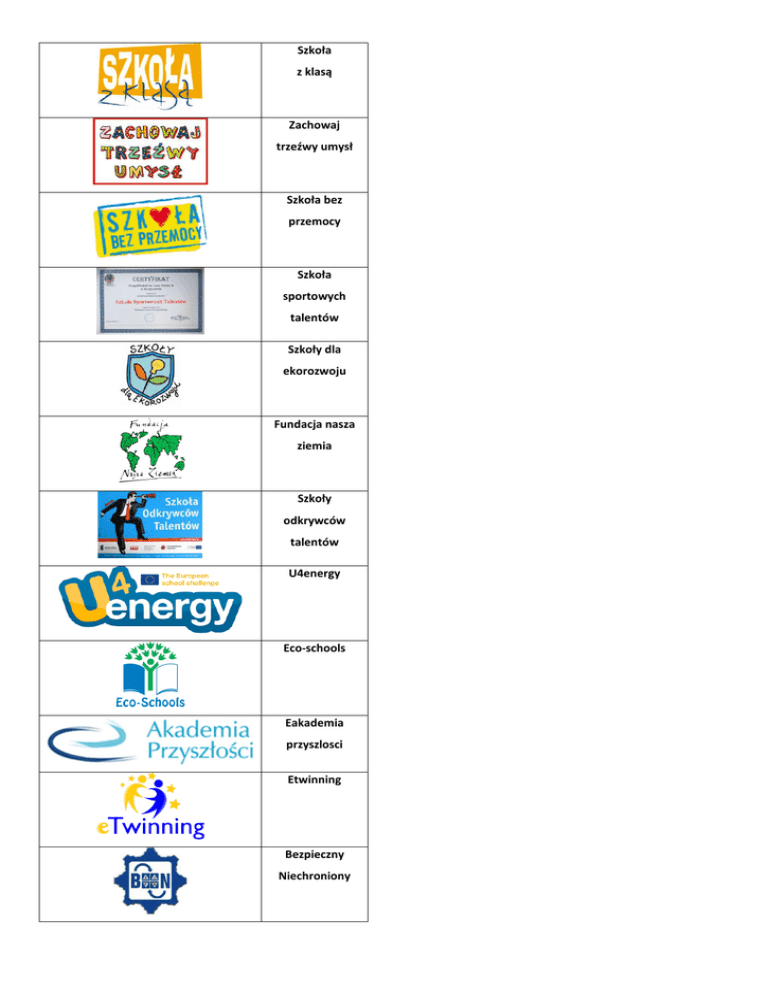 Szkoła z klasą Zachowaj trzeźwy umysł Szkoła bez przemocy Szkoła sportowych talentów Szkoły dla ekorozwoju Fundacja nasza ziemia Szkoły odkrywców talentów U4energy Eco-schools Eakademia przyszlosci Etwinning Bezpieczny Niechroniony