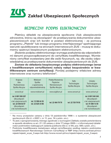 Zakład Ubezpieczeń Społecznych BEZPIECZNY PODPIS ELEKTRONICZNY Płatnicy składek na ubezpieczenia społeczne i/lub ubezpieczenie zdrowotne, którzy są obowiązani1 do przekazywania dokumentów ubezpieczeniowych oraz ich korekt w postaci elektronicznej – za pomocą programu „Płatnik” lub innego programu interfejsowego2 spełniającego warunki opublikowane na stronach internetowych ZUS – muszą te dokumenty opatrzyć bezpiecznym podpisem elektronicznym. Złożenie podpisu elektronicznego wymaga posłużenia się odpowiednimi danymi przyporządkowanymi do certyfikatu kwalifikowanego. Wymieniony certyfikat wystawiany jest dla osób fizycznych, np. dla osoby odpowiedzialnej za przekazywanie dokumentów ubezpieczeniowych do ZUS. Zestaw do składania bezpiecznego podpisu elektronicznego (wraz z kwalifikowanym certyfikatem) należy nabyć bezpośrednio w kwalifikowanym centrum certyfikacji. Poniżej podajemy właściwe adresy internetowe oraz numery telefonów3. Krajowa Izba Rozliczeniowa Spółka Akcyjna Mobicert Spółka z ograniczoną odpowiedzialnością Polska Wytwórnia Papierów Wartościowych Spółka Akcyjna Safe Technologies Spółka Akcyjna Unizeto Technologies Spółka Akcyjna www.kir.pl www.mobicert.pl www.sigillum.pl www.cencert.pl www.certum.pl tel. 22 720 79 55 tel. 0 801 540 340 (dla połączeń z tel. stacjonarnych) tel. 91 480 13 40 (dla połączeń z tel. komórkowych) tel. 0 801 500 207 (dla połączeń z tel. stacjonarnych) tel. 22 546 02 07 (dla połączeń z tel. komórkowych) 1 2 3 tel. 12 399 44 35 tel. 22 625 33 86 tel. 22 464 79 79 Na mocy przepisów ustawy z dnia 13 października 1998 r. o systemie ubezpieczeń społecznych (Dz.U. z 2007 r. nr 11, poz. 74 z późn. zm.). To jest z oprogramowania, którego zgodność z wymogami Zakładu została potwierdzona w sposób określony w art. 21 i 22 ustawy z dnia 17 lutego 2005 r. o informatyzacji działalności podmiotów realizujących zadania publiczne (Dz.U. nr 64, poz. 565 z późn. zm.). Podmioty kwalifikowane świadczące usługi certyfikacyjne według rejestru podmiotów kwalifikowanych Narodowego Centrum Certyfikacji w NBP (http://www.centrast.pl/ncc/ rejestr/rejestr_wysz_3.aspx lub http://www.nccert.pl/ncc/rejestr/rejestr_wysz_3.aspx). 1 Posiadanie kwalifikowanego certyfikatu umożliwia przesyłanie do ZUS drogą elektroniczną również innych dokumentów (np. wniosku płatnika składek o wydanie zaświadczenia o niezaleganiu w opłacaniu składek). Lista spraw, które aktualnie można zrealizować przy wykorzystaniu kwalifikowanego certyfikatu, znajduje się na stronach serwisu internetowego ZUS. Co warto wiedzieć o podpisie elektronicznym i certyfikacie kwalifikowanym Podpis elektroniczny. Dane w postaci elektronicznej, które wraz z innymi danymi, do których zostały dołączone lub z którymi są logicznie powiązane, służą do identyfikacji osoby składającej podpis elektroniczny. Bezpieczny podpis elektroniczny. Podpis elektroniczny, który: + jest przyporządkowany wyłącznie do osoby fizycznej składającej ten podpis, + jest sporządzany za pomocą, podlegających wyłącznej kontroli osoby składającej podpis, bezpiecznych urządzeń służących do składania podpisu elektronicznego oraz przyporządkowanych do tej osoby danych, + jest powiązany z danymi, do których został dołączony, w taki sposób, że jakakolwiek późniejsza zmiana tych danych jest rozpoznawalna. Podstawowe właściwości podpisu elektronicznego: + unikalność (każdy podpisany dokument elektroniczny ma unikalny podpis cyfrowy ściśle z nim związany), + integralność (jakakolwiek zmiana dokumentu podpisanego cyfrowo zostanie natychmiast wykryta w momencie weryfikacji podpisu), + niezaprzeczalność (tylko osoba posiadająca klucz prywatny korespondujący z kluczem publicznym wykorzystanym do weryfikacji podpisu mogła wygenerować podpis pod dokumentem). Elementy niezbędne do składania bezpiecznego podpisu elektronicznego Certyfikat kwalifikowany. Elektroniczne zaświadczenie – spełniające wymagania ustawy z dnia 18 września 2001 r. o podpisie elektronicznym4 – za pomocą którego dane służące do weryfikacji podpisu elektronicznego są przyporządkowane do osoby składającej podpis 4 2 Dz.U. nr 130, poz. 1450 z późn. zm. elektroniczny i które umożliwiają identyfikację tej osoby. Certyfikat jest wydawany przez kwalifikowane centrum certyfikacji na karcie kryptograficznej. Karta ma wbudowany specjalizowany procesor kryptograficzny. W pamięci karty zapisywane są zaszyfrowane informacje dotyczące użytkownika karty (osoby, która za jej pomocą składa bezpieczny podpis elektroniczny) i ewentualnie właściciela karty (podmiotu, który zakupił kartę z certyfikatem i ma prawo ją unieważnić). Generowanie bezpiecznego podpisu elektronicznego odbywa się w procesorze kryptograficznym karty, poza komputerem, na którym przygotowany został podpisywany dokument elektroniczny. Czytnik kart kryptograficznych. Niezbędny element pozwalający na połączenie komputera, na którym przygotowany został dokument elektroniczny z procesorem kryptograficznym karty, na czas składania bezpiecznego podpisu elektronicznego. Czytnik można połączyć przez jeden z powszechnie stosowanych interfejsów: RS232 (tzw. serial), USB lub PCMCIA (w laptopach). Niektóre czytniki wyposażone są np. w klawiatury do bezpiecznego podawania kodu PIN lub czytniki odcisku palca. Oprogramowanie do obsługi czytnika i karty. Oprogramowanie służące do administrowania kartą kryptograficzną (np. do zmiany kodów PIN, zarządzania certyfikatami zapisanymi na karcie itp.). Oprogramowanie do składania i weryfikacji bezpiecznego podpisu elektronicznego. Program „Płatnik” (począwszy od wersji 7.01.001) sam obsługuje proces składania bezpiecznego podpisu elektronicznego pod dokumentami przekazywanymi do ZUS. W tym przypadku nie jest potrzebne dodatkowe oprogramowanie. Zakup certyfikatu kwalifikowanego Certyfikat