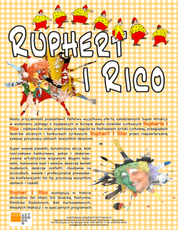 Ruphert i Rico Mamy przyjemność przedstawić Państwu wyjątkową ofertę całodziennych Super Atrakcji w wykonaniu jednego z najlepszych w Europie duetu clownów cyrkowych Rupherta i Rico - zdobywców wielu prestiżowych nagród na festiwalach sztuki cyrkowej, przeglądach teatrów ulicznych i konkursach cyrkowych. Ruphert i Rico przez niepowtarzalną zabawę przynoszą uśmiech wszystkim dzieciom. Super wesołe piosenki, dynamiczna akcja, blok rozrywkowo konkursowy, pokaz i obdarowywanie artystycznie wiązanymi długimi balonami, malowanie buzi i włosów, deszcze baniek mydlanych, deszcze confetti, chodzenie na szczudłach, wesołe i profesjonalne prowadzenie konferansjerki itd. itp. przyniosą wszystkim uśmiech i radość. Rupher i Rico występują w trakcie obchodów: Dni Miast, Dni Dziecka, Festynów, Pikników Rodzinnych, Bali Karnawałowych, Wesołych Wakacji i w specjalnych programach. SZYKART HURTOWNIA WRAŻEŃ POZYTYWNYCH Agencja Artystyczna Szyk-Art Katarzyna Tabernacka - Mulczyńska 64-100 Leszno ul. Na Skarpie 29 tel. 0 65 526 81 71 tel. 0 609 23 50 55 [email protected] www.szyk.note.pl