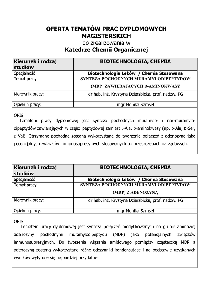OFERTA TEMATÓW PRAC DYPLOMOWYCH MAGISTERSKICH do zrealizowania w Katedrze Chemii Organicznej Kierunek i rodzaj studiów BIOTECHNOLOGIA, CHEMIA Biotechnologia Leków / Chemia Stosowana SYNTEZA POCHODNYCH MURAMYLODIPEPTYDÓW Specjalność Temat pracy (MDP) ZAWIERAJĄCYCH D-AMINOKWASY Kierownik pracy: dr hab. inż. Krystyna Dzierzbicka, prof. nadzw. PG Opiekun pracy: mgr Monika Samsel OPIS: Tematem pracy dyplomowej jest synteza pochodnych muramylo- i nor-muramylodipeptydów zawierających w części peptydowej zamiast L-Ala, D-aminokwasy (np. D-Ala, D-Ser, D-Val). Otrzymane pochodne zostaną wykorzystane do tworzenia połączeń z adenozyną jako potencjalnych związków immunosupresyjnych stosowanych po przeszczepach narządowych. Kierunek i rodzaj studiów BIOTECHNOLOGIA, CHEMIA Biotechnologia Leków / Chemia Stosowana SYNTEZA POCHODNYCH MURAMYLODIPEPTYDÓW Specjalność Temat pracy (MDP) Z ADENOZYNĄ Kierownik pracy: dr hab. inż. Krystyna Dzierzbicka, prof. nadzw. PG Opiekun pracy: mgr Monika Samsel OPIS: Tematem pracy dyplomowej jest synteza połączeń modyfikowanych na grupie aminowej adenozyny pochodnymi muramylodipeptydu (MDP) jako potencjalnych związków immunosupresyjnych. Do tworzenia wiązania amidowego pomiędzy cząsteczką MDP a adenozyną zostaną wykorzystane różne odczynniki kondensujące i na podstawie uzyskanych wyników wytypuje się najbardziej przydatne. Kierunek i rodzaj studiów TECHNOLOGIA CHEMICZNA, CHEMIA Technologia Organiczna / Chemia Stosowana SYNTEZA POCHODNYCH HYDROKSY- Specjalność Temat pracy AKRYDYNY/AKRYDONU Kierownik pracy: dr hab. inż. Krystyna Dzierzbicka, prof. nadzw. PG Opiekun pracy: dr inż. Grzegorz Cholewiński OPIS: W Katedrze podjęto tematykę związaną z otrzymywaniem potencjalnych związków immunosupresyjnych będących połączeniami akrydyny/akrydonu z kwasem mykofenolowym. Do syntezy zaprojektowanych związków potrzebne będą między innymi alkilohydroksylowe pochodne akrydyny/akrydonu zsyntetyzowane w ramach niniejszej pracy dyplomowej. Kierunek i rodzaj studiów TECHNOLOGIA CHEMICZNA, CHEMIA Technologia Organiczna / Chemia Stosowana SYNTEZA POCHODNYCH AMINO- Specjalność Temat pracy AKRYDYNY/AKRYDONU Kierownik pracy: dr hab. inż. Krystyna Dzierzbicka, prof. nadzw. PG Opiekun pracy: OPIS: Zaprojektowano dr inż. Grzegorz Cholewiński syntezę potencjalnych związków immunosupresyjnych będących połączeniami akrydyny/akrydonu z kwasem mykofenolowym. Do syntezy takich połączeń potrzebne będą między innymi aminoalkiloamino pochodne akrydyny/akrydonu zsyntetyzowane w ramach niniejszej pracy dyplomowej.