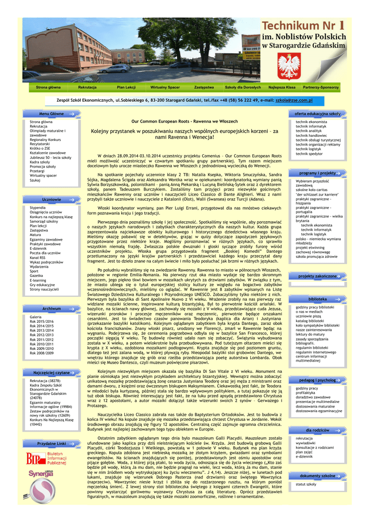 Strona główna Rekrutacja Plan Lekcji Wirtualny Spacer Zastępstwa Szkoły dla Dorosłych Najlepsza Klasa Partnerzy-Sponsorzy Zespół Szkół Ekonomicznych, ul.Sobieskiego 6, 83-200 Starogard Gdański, tel./fax +48 (58) 56 222 49, e-mail: [email protected] Menu Główne Strona główna Rekrutacja Olimpiady maturalne i zawodowe Regionalny Konkurs Recytatorski Krótko o ZSE Kształcenie zawodowe Jubileusz 50 - lecia szkoły Kadra szkoły Promocja szkoły Przetargi Wirtualny spacer Szukaj Uczniowie Stypendia Osiągnięcia uczniów Konkurs na najlepszą klasę Samorząd szkolny Plan lekcji Zastępstwa Matura Egzaminy zawodowe Praktyki zawodowe E-dziennik Poczta dla uczniów Kanał RSS Wykaz podręczników Wydarzenia Sport Gazetka E-learning Gry edukacyjne Strony nauczycieli Archiwum Galeria Rok 2015/2016 Rok 2014/2015 Rok 2013/2014 Rok 2012/2013 Rok 2011/2012 Rok 2010/2011 Rok 2009/2010 Rok 2008/2009 Najczęściej czytane Rekrutacja (38278) Kadra Zespołu Szkół Ekonomicznych w Starogardzie Gdańskim (24078) Egzamin maturalny informacje ogólne (19984) Zestaw podręczników na nowy rok szkolny (12609) Konkurs Na Najlepszą Klasę (10442) Przydatne Linki oferta edukacyjna szkoły Our Common European Roots - Rawenna we Włoszech Kolejny przystanek w poszukiwaniu naszych wspólnych europejskich korzeni – za nami Ravenna i Wenecja! W dniach 28.09.2014–03.10.2014 uczestnicy projektu Comenius – Our Common European Roots mieli możliwość uczestniczyć w czwartym spotkaniu grupy partnerskiej. Tym razem miejscem docelowym było urocze miasteczko Rawenna we Włoszech z jednodniową wycieczką do Wenecji. Na spotkanie pojechały uczennice klasy 2 TB: Natalia Ksepka, Wiktoria Smuczyńska, Sandra Sójka, Magdalena Ścigała oraz Aleksandra Wontka wraz w opiekunami: koordynatorką wymiany panią Sylwia Borzyszkowską, polonistkami – panią Anną Piekarską i Lucyną Bielińską-Sytek oraz z dyrektorem szkoły, panem Tadeuszem Burczykiem. Zostaliśmy tam przyjęci przez niezwykle gościnnych mieszkańców Rawenny oraz uczniów i nauczycieli Liceo Classico di Dante Alighieri. Wraz z nami przybyli także uczniowie i nauczyciele z Katalonii (Olot), Walii (Swansea) oraz Turcji (Adana). Włoski koordynator wymiany, pan Pier Luigi Errani, przygotował dla nas mnóstwo ciekawych form poznawania kraju i jego tradycji. Pierwszego dnia poznaliśmy szkołę i jej społeczność. Spotkaliśmy się wspólnie, aby porozmawiać o naszych językach narodowych i zabytkach charakterystycznych dla naszych kultur. Każda grupa zaprezentowała najciekawsze obiekty kulturowego i historycznego dziedzictwa własnego kraju. Mieliśmy okazję pobawić się w detektywów, grając w quizy dotyczące zapożyczeń językowych przygotowane przez niektóre kraje. Mogliśmy porozmawiać w różnych językach, co sprawiło wszystkim niemałą frajdę. Zwłaszcza polskie dwuznaki i głoski syczące zrobiły furorę wśród uczestników projektu. Włoska grupa przygotowała fragment „Boskiej Komedii” Dantego przetłumaczony na języki krajów partnerskich i przedstawiciel każdego kraju przeczytał dany fragment. Jest to dzieło znane na całym świecie i miło było posłuchać jak brzmi w różnych językach. Po południu wybraliśmy się na zwiedzanie Rawenny. Rawenna to miasto w północnych Włoszech, położone w regionie Emilia-Romania. Na pierwszy rzut oka miasto wydaje się bardzo skromnym miejscem, jego piękno tkwi bowiem w mozaikach ukrytych za drzwiami zabytków. W związku z tym, że miasto ubiega się o tytuł europejskiej stolicy kultury ze względu na bogactwo zabytków wczesnośredniowiecznych, mieliśmy co oglądać. W Rawennie jest 8 zabytków wpisanych na Listę Światowego Dziedzictwa Kulturalnego i Przyrodniczego UNESCO. Zobaczyliśmy tylko niektóre z nich. Pierwszym była bazylika di Sant Apolinaire Nuovo z VI wieku. Wrażenie zrobiły na nas pierwszy raz widziane mozaiki ścienne, inspirowane kulturą bizantyjską. Był to pierwotnie kościół ariański. W bazylice, na ścianach nawy głównej, zachowały się mozaiki z V wieku, przedstawiające cuda Jezusa, wizerunki proroków i procesje męczenników oraz męczennic, pierwotnie będące orszakami cesarskimi. Jest to świadectwo czasów panowania Teodoryka (kaplica dla Arian) i Justyniana (przekazanie bazyliki katolikom). Kolejnym oglądanym zabytkiem była krypta Dantego, zaraz obok kościoła franciszkanów. Znany włoski pisarz, urodzony we Florencji, zmarł w Rawennie będąc na wygnaniu. Podejrzewa się, że ceremonia pogrzebowa odbyła się w bazylice San Francesco, której początki sięgają V wieku. Tę budowlę również udało nam się zobaczyć. Świątynia wybudowana została w X wieku, a potem wielokrotnie była przebudowywana. Pod tutejszym ołtarzem mieści się krypta z X wieku, ozdobiona mozaikami podłogowymi. Krypta znajduje się pod poziomem gruntu, dlatego też jest zalana wodą, w której pływają ryby. Nieopodal bazyliki stoi grobowiec Dantego, we wnętrzu którego znajduje się grób oraz rzeźba przedstawiająca poetę autorstwa Lombarda. Obok mieści się Museo Dantesco, czyli muzeum poświęcone pisarzowi. Kolejnym niezwykłym miejscem okazała się bazylika Di San Vitale z VI wieku. Monument na planie ośmiokąta jest niezwykłym przykładem architektury bizantyjskiej. Wewnątrz można zobaczyć unikatową mozaikę przedstawiającą żonę cesarza Justyniana Teodorę oraz jej męża z ministrami oraz damami dworu, z księżmi oraz ówczesnym biskupem Maksymianem. Ciekawostką jest fakt, że Teodora w młodości była kurtyzaną, później stała się bardzo wpływowym politykiem, a tutaj pokazuje się ją tuż obok biskupa. Również interesujący jest fakt, że na łuku przed apsydą przedstawiono Chrystusa wraz z 12 apostołami, a autor mozaiki dołączył także wizerunki swoich 2 synów – Gerwazego i Protazego. Nauczycielka Liceo Classico zabrała nas także do Baptysterium Ortodoksów. Jest to budowla z końca 