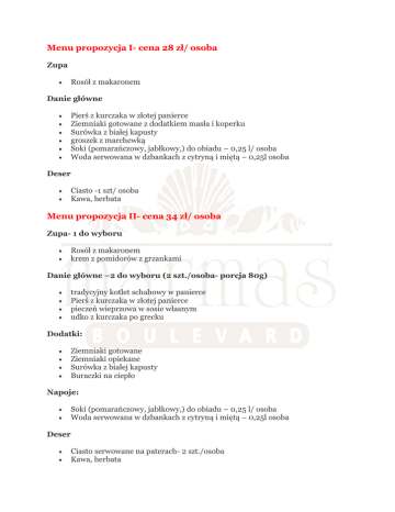 Menu propozycja I- cena 28 zł/ osoba Menu propozycja II