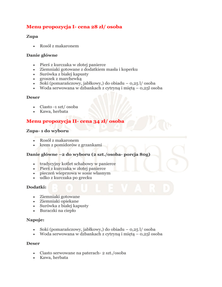 Menu propozycja I- cena 28 zł/ osoba Zupa Rosół z makaronem Danie główne Pierś z kurczaka w złotej panierce Ziemniaki gotowane z dodatkiem masła i koperku Surówka z białej kapusty groszek z marchewką Soki (pomarańczowy, jabłkowy,) do obiadu – 0,25 l/ osoba Woda serwowana w dzbankach z cytryną i miętą – 0,25l osoba Deser Ciasto -1 szt/ osoba Kawa, herbata Menu propozycja II- cena 34 zł/ osoba Zupa- 1 do wyboru Rosół z makaronem krem z pomidorów z grzankami Danie główne –2 do wyboru (2 szt./osoba- porcja 80g) tradycyjny kotlet schabowy w panierce Pierś z kurczaka w złotej panierce pieczeń wieprzowa w sosie własnym udko z kurczaka po grecku Dodatki: Ziemniaki gotowane Ziemniaki opiekane Surówka z białej kapusty Buraczki na ciepło Napoje: Soki (pomarańczowy, jabłkowy,) do obiadu – 0,25 l/ osoba Woda serwowana w dzbankach z cytryną i miętą – 0,25l osoba Deser Ciasto serwowane na paterach- 2 szt./osoba Kawa, herbata Menu propozycja III- cena 45 zł/ osoba Zupa- 1 do wyboru Rosół z makaronem krem z czerwonych warzyw z prażonymi pestkami dyni krem pieczarkowy z groszkiem ptysiowymi Danie główne: 3 do wyboru (3 szt./osoba- porcja 80g) Kotlet de Volaille Kotlet schabowy w panierce Zrazy wieprzowe w sosie Kotlet z piersi kurczaka Pieczeń wieprzowa w sosie Dodatki: Ziemniaki gotowane Ziemniaki opiekane Surówka z kapusty pekińskiej Surówka z selera z rodzynkami Warzywa gotowane na parze Napoje: Soki (pomarańczowy, jabłkowy,) do obiadu – 0,25 l/ osoba Woda serwowana w dzbankach z cytryną i miętą – 0,25l osoba Deser: Ciasto serwowane na paterach 3 szt/ osoba Kawa, Herbata Menu propozycja IV- cena 55 zł/ osoba Zupa- 1 do wyboru Rosół z makaronem krem z czerwonych warzyw z prażonymi pestkami dyni krem z brokułów z serem Danie główne: 3 do wyboru (3 szt./osoba- porcja 80g) Kotlet de Volaille Kotlet schabowy w panierce Zrazy wieprzowe w sosie Kotlet z piersi kurczaka Pieczeń wieprzowa w sosie Dodatki: Ziemniaki gotowane Ziemniaki opiekane Surówka z kapusty pekińskiej Surówka z selera z rodzynkami Warzywa gotowane na parze Napoje: Soki (pomarańczowy, jabłkowy,) do obiadu – 0,25 l/ osoba Woda serwowana w dzbankach z cytryną i miętą – 0,25l osoba Deser: Ciasto serwowane na paterach 3 szt/ osoba Kawa, Herbata