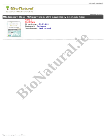 Informacje o produkcie Utworzono 02-03-2017 Młodzieńczy Blask Matujący krem ultra nawilżający dzień/noc 50ml Cena : 8.45 Euro B io N at ur al .ie Nr katalogowy : BL-01-001 Dostępność : Dostępny Średnia ocena : brak recenzji Wygenerowano w programie www.oscGold.com Bielenda Bio Technologia Ciekłokrystaliczna 7D - Młodzieńczy Blask MATUJĄCY KREM ULTRA NAWILŻAJĄCY DZIEŃ/NOC 50ML Spektakularne efekty nawilżające i matujące zapewniają innowacyjne składniki o udowodnionej skuteczności, dobrane indywidualnie do potrzeb skóry mieszanej i wrażliwej: Bio kwas hialuronowy, hydromanil, Complex Anti-sebum, naturalny filtr UV. Krem jest bezpieczny dla skóry wrażliwej. - 0% parabenów - 0% sztucznych barwników - 0% oleju parafinowego - 0% PEG Pojemność: 50 ml DZIAŁANIE: POTWIERDZONA SKUTECZNOŚĆ KREMU* al 1. Wyjątkowa poprawa nawilżenia 96% 2. Widoczna redukcja przetłuszczania i błyszczenia skóry 86% 3. Wyraźnie zmniejszona widoczność porów 79% 4. Zdrowa, świeża i gładka cera 96% 5. Złagodzenie podrażnień i zmian trądzikowych 82% 6. Przebarwienia widocznie rozjaśnione 78% 7. Mniejsza wrażliwość skóry na czynniki zewnętrzne 93% .ie EFEKT 7D spektakularne rezultaty działania kremu aż na 7 płaszczyznach: * Test In Vivo przeprowadzony pod nadzorem dermatologów na grupie 25 kobiet przez okres 4 tygodni. ur STOSOWANIE: Wmasuj krem w oczyszczoną skórę twarzy, szyi i dekoltu. Jest idealny jako baza pod makijaż. Lekka formuła zapewnia szybkie i łatwe wchłanianie kremu. N at Naturalne składniki aktywne: B io Bio kwas hialuronowy - Najsilniejsza substancja nawilżająca. Skutecznie redukuje zmarszczki, wypełniając ją od wewnątrz. Zwiększa produkcję kolagenu, zatrzymuje wodę w naskórku, chroni go przed wysuszeniem, poprawia gęstość skóry. Przywraca skórze jędrność i sprężystość. Hydromanil - długotrwale nawilżający kompleks roślinny zbudowany z trójwymiarowej koloidalnej matrycy polisacharydowej otrzymywanej z peruwiańskiego drzewa Tara. Tworzy na powierzchni skóry film, z którego stopniowo uwalniają się substancje aktywne, zapewniając w ten sposób długotrwałe nawilżenie. Wynikiem tego jest wzrost elastyczności oraz wyraźna poprawa stanu i wyglądu skóry. Complex Anti-Sebum - zwalcza problemy skórne takie jak trądzik, zaczerwienienia i szorstkość. Redukuje nadmierne wydzielanie sebum. Wykazuje właściwości matujące, hamuje utratę wody przez naskórek. Wzmacnia skórę, zwiększa jej odporność na uszkodzenia. Rozjaśnia przebarwienia, łagodzi podrażnienia. Naturalny filtr UV - zapobiega powstawaniu zmarszczek dzięki ochronie przed szkodliwym promieniowaniem słonecznym. BIOTECHNOLOGIA CIEKŁOKRYSTALICZNA 7D to profesjonalna, niezwykle skuteczna linia kosmetyków nawilżających nowej generacji, która rewelacyjnie chroni oraz wydobywa naturalne piękno młodej cery. Linia powstała w oparciu o najnowsze osiągnięcie współczesnej technologii bazę ciekłokrystaliczną zbudowaną na wzór i podobieństwo skóry. Inteligentne formuły rewelacyjnie walczą o zdrowy, świeży wygląd cery aż na 7 płaszczyznach i gwarantują skórze ekstremalne nawilżenie oraz spektakularne efekty w opóźnianiu powstawania zmarszczek. Kosmetyki zostały wzbogacone o składniki, które zapobiegają tworzeniu się zmarszczek na długi czas. Kremy na bazie ciekłokrystalicznej to kremy idealne, zainspirowane naturalną budową skóry. W odróżnieniu od zwykłych kremów ich struktura jest fizjologicznie zgodna ze strukturą skóry, dzięki czemu składniki aktywne mają ułatwioną penetrację w jej głąb i są natychmiast przez nią absorbowane. Struktura kremu na bazie ciekłokrystalicznej zawiera idealnie kompatybilne ze skórą lipidy membranowe, które wspierają jej naturalną barierę lipidową, zapewniają znaczny i długotrwały wzrost nawilżenia skóry oraz kontrolowane, stopniowe uwalnianie substancji aktywnych, dzięki czemu mogą one działać o wiele skuteczniej niż w zwykłych kremach. Pochodzenie: Polska Informacje o produkcie B io N at ur al .ie Najlepsze przed: 31/10/2016 Wygenerowano w programie www.oscGold.com