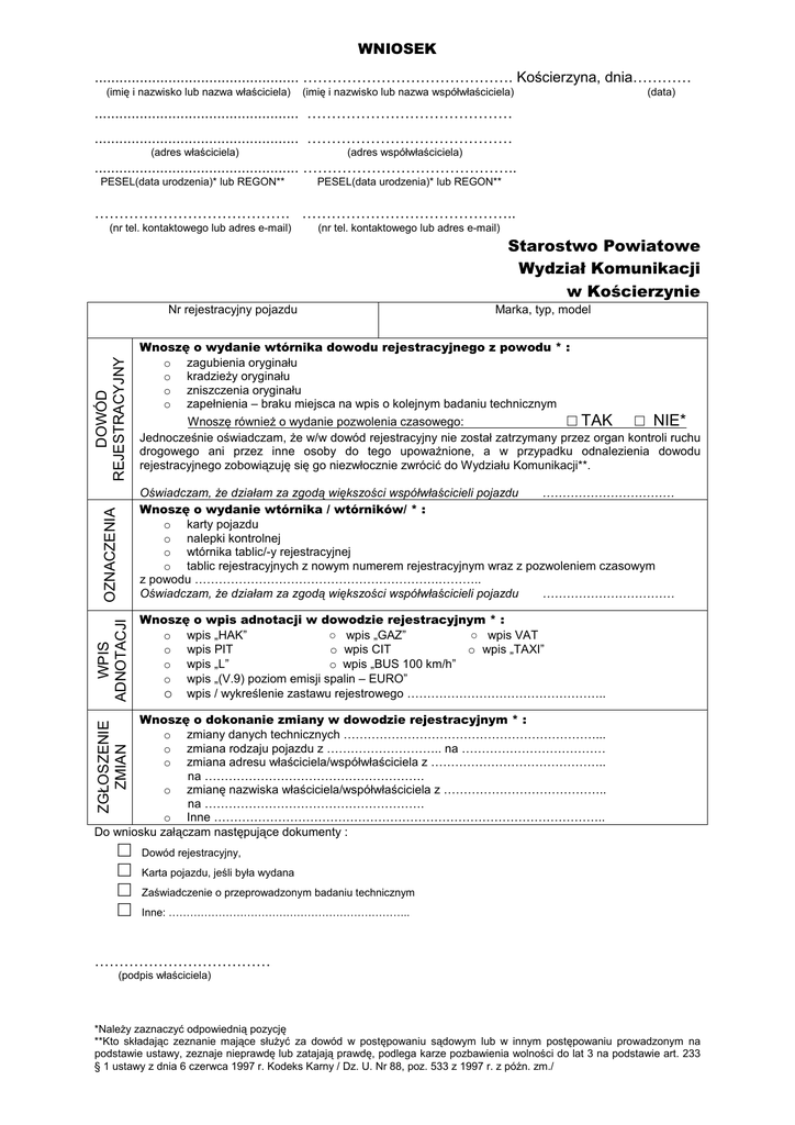 WNIOSEK .................................................. ……………………………………. Kościerzyna, dnia………… (imię i nazwisko lub nazwa właściciela) (imię i nazwisko lub nazwa współwłaściciela) (data) .................................................. …………………………………… .................................................. …………………………………… (adres właściciela) (adres współwłaściciela) .................................................. …………………………………….. PESEL(data urodzenia)* lub REGON** PESEL(data urodzenia)* lub REGON** …………………………………. …………………………………….. (nr tel. kontaktowego lub adres e-mail) (nr tel. kontaktowego lub adres e-mail) Starostwo Powiatowe Wydział Komunikacji w Kościerzynie DOWÓD REJESTRACYJNY Nr rejestracyjny pojazdu Marka, typ, model Wnoszę o wydanie wtórnika dowodu rejestracyjnego z powodu * : o zagubienia oryginału o kradzieŜy oryginału o zniszczenia oryginału o zapełnienia – braku miejsca na wpis o kolejnym badaniu technicznym Wnoszę równieŜ o wydanie pozwolenia czasowego: □ TAK □ NIE* Jednocześnie oświadczam, Ŝe w/w dowód rejestracyjny nie został zatrzymany przez organ kontroli ruchu drogowego ani przez inne osoby do tego upowaŜnione, a w przypadku odnalezienia dowodu rejestracyjnego zobowiązuję się go niezwłocznie zwrócić do Wydziału Komunikacji**. WPIS ADNOTACJI OZNACZENIA Oświadczam, Ŝe działam za zgodą większości współwłaścicieli pojazdu …………………………… Wnoszę o wydanie wtórnika / wtórników/ * : o karty pojazdu o nalepki kontrolnej o wtórnika tablic/-y rejestracyjnej o tablic rejestracyjnych z nowym numerem rejestracyjnym wraz z pozwoleniem czasowym z powodu …………………………………………………….……….. Oświadczam, Ŝe działam za zgodą większości współwłaścicieli pojazdu …………………………… Wnoszę o wpis adnotacji w dowodzie rejestracyjnym * : o wpis „HAK” ○ wpis „GAZ” ○ wpis VAT o wpis PIT o wpis CIT o wpis „TAXI” o wpis „L” o wpis „BUS 100 km/h” o wpis „(V.9) poziom emisji spalin – EURO” o wpis / wykreślenie zastawu rejestrowego ………………………………………….. ZGŁOSZENIE ZMIAN Wnoszę o dokonanie zmiany w dowodzie rejestracyjnym * : o zmiany danych technicznych ………………………………………………………... o zmiana rodzaju pojazdu z ……………………….. na ……………………………… o zmiana adresu właściciela/współwłaściciela z …………………………………….. na ………………………………………………. o zmianę nazwiska właściciela/współwłaściciela z ………………………………….. na ………………………………………………. o Inne …………………………………………………………………………………….. Do wniosku załączam następujące dokumenty : □ □ □ □ Dowód rejestracyjny, Karta pojazdu, jeśli była wydana Zaświadczenie o przeprowadzonym badaniu technicznym Inne: ………………………………………………………….. ……………………………… (podpis właściciela) *NaleŜy zaznaczyć odpowiednią pozycję **Kto składając zeznanie mające słuŜyć za dowód w postępowaniu sądowym lub w innym postępowaniu prowadzonym na podstawie ustawy, zeznaje nieprawdę lub zatajają prawdę, podlega karze pozbawienia wolności do lat 3 na podstawie art. 233 § 1 ustawy z dnia 6 czerwca 1997 r. Kodeks Karny / Dz. U. Nr 88, poz. 533 z 1997 r. z późn. zm./