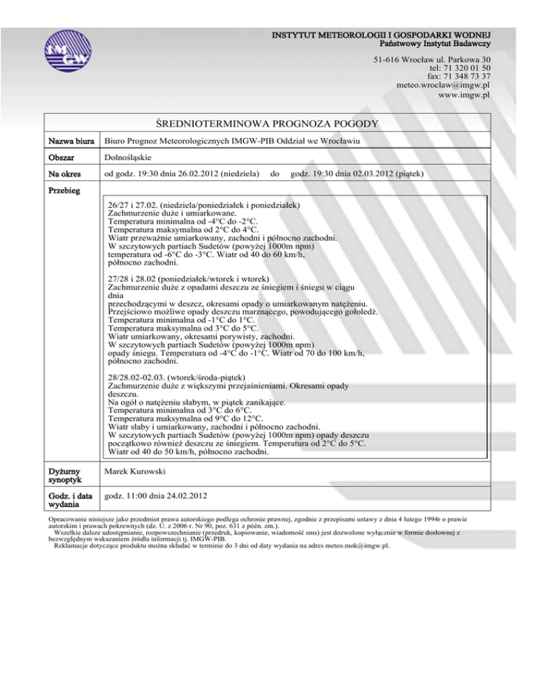 INSTYTUT METEOROLOGII I GOSPODARKI WODNEJ Państwowy Instytut Badawczy 51-616 Wrocław ul. Parkowa 30 tel: 71 320 01 50 fax: 71 348 73 37 [email protected] www.imgw.pl ŚREDNIOTERMINOWA PROGNOZA POGODY Nazwa biura Biuro Prognoz Meteorologicznych IMGW-PIB Oddział we Wrocławiu Obszar Dolnośląskie Na okres od godz. 19:30 dnia 26.02.2012 (niedziela) do godz. 19:30 dnia 02.03.2012 (piątek) Przebieg 26/27 i 27.02. (niedziela/poniedziałek i poniedziałek) Zachmurzenie duże i umiarkowane. Temperatura minimalna od -4°C do -2°C. Temperatura maksymalna od 2°C do 4°C. Wiatr przeważnie umiarkowany, zachodni i północno zachodni. W szczytowych partiach Sudetów (powyżej 1000m npm) temperatura od -6°C do -3°C. Wiatr od 40 do 60 km/h, północno zachodni. 27/28 i 28.02 (poniedziałek/wtorek i wtorek) Zachmurzenie duże z opadami deszczu ze śniegiem i śniegu w ciągu dnia przechodzącymi w deszcz, okresami opady o umiarkowanym natężeniu. Przejściowo możliwe opady deszczu marznącego, powodującego gołoledź. Temperatura minimalna od -1°C do 1°C. Temperatura maksymalna od 3°C do 5°C. Wiatr umiarkowany, okresami porywisty, zachodni. W szczytowych partiach Sudetów (powyżej 1000m npm) opady śniegu. Temperatura od -4°C do -1°C. Wiatr od 70 do 100 km/h, północno zachodni. 28/28.02-02.03. (wtorek/środa-piątek) Zachmurzenie duże z większymi przejaśnieniami. Okresami opady deszczu. Na ogół o natężeniu słabym, w piątek zanikające. Temperatura minimalna od 3°C do 6°C. Temperatura maksymalna od 9°C do 12°C. Wiatr słaby i umiarkowany, zachodni i północno zachodni. W szczytowych partiach Sudetów (powyżej 1000m npm) opady deszczu początkowo również deszczu ze śniegiem. Temperatura od 2°C do 5°C. Wiatr od 40 do 50 km/h, północno zachodni. Dyżurny synoptyk Marek Kurowski Godz. i data wydania godz. 11:00 dnia 24.02.2012 Opracowanie niniejsze jako przedmiot prawa autorskiego podlega ochronie prawnej, zgodnie z przepisami ustawy z dnia 4 lutego 1994r o prawie autorskim i prawach pokrewnych (dz. U. z 2006 r. Nr 90, poz. 631 z późn. zm.). Wszelkie dalsze udostępnianie, rozpowszechnianie (przedruk, kopiowanie, wiadomość sms) jest dozwolone wyłącznie w formie dosłownej z bezwzględnym wskazaniem źródła informacji tj. IMGW-PIB. Reklamacje dotyczące produktu można składać w terminie do 3 dni od daty wydania na adres [email protected].