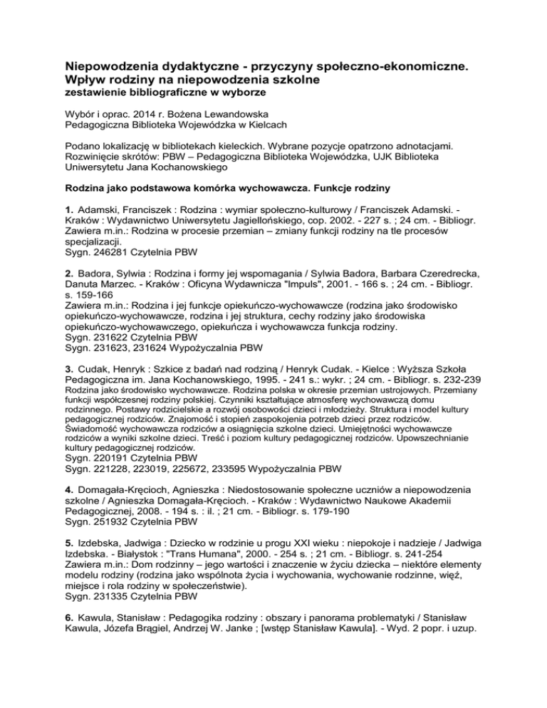 Niepowodzenia dydaktyczne - przyczyny społeczno-ekonomiczne. Wpływ rodziny na niepowodzenia szkolne zestawienie bibliograficzne w wyborze Wybór i oprac. 2014 r. Bożena Lewandowska Pedagogiczna Biblioteka Wojewódzka w Kielcach Podano lokalizację w bibliotekach kieleckich. Wybrane pozycje opatrzono adnotacjami. Rozwinięcie skrótów: PBW – Pedagogiczna Biblioteka Wojewódzka, UJK Biblioteka Uniwersytetu Jana Kochanowskiego Rodzina jako podstawowa komórka wychowawcza. Funkcje rodziny 1. Adamski, Franciszek : Rodzina : wymiar społeczno-kulturowy / Franciszek Adamski. Kraków : Wydawnictwo Uniwersytetu Jagiellońskiego, cop. 2002. - 227 s. ; 24 cm. - Bibliogr. Zawiera m.in.: Rodzina w procesie przemian – zmiany funkcji rodziny na tle procesów specjalizacji. Sygn. 246281 Czytelnia PBW 2. Badora, Sylwia : Rodzina i formy jej wspomagania / Sylwia Badora, Barbara Czeredrecka, Danuta Marzec. - Kraków : Oficyna Wydawnicza "Impuls", 2001. - 166 s. ; 24 cm. - Bibliogr. s. 159-166 Zawiera m.in.: Rodzina i jej funkcje opiekuńczo-wychowawcze (rodzina jako środowisko opiekuńczo-wychowawcze, rodzina i jej struktura, cechy rodziny jako środowiska opiekuńczo-wychowawczego, opiekuńcza i wychowawcza funkcja rodziny. Sygn. 231622 Czytelnia PBW Sygn. 231623, 231624 Wypożyczalnia PBW 3. Cudak, Henryk : Szkice z badań nad rodziną / Henryk Cudak. - Kielce : Wyższa Szkoła Pedagogiczna im. Jana Kochanowskiego, 1995. - 241 s.: wykr. ; 24 cm. - Bibliogr. s. 232-239 Rodzina jako środowisko wychowawcze. Rodzina polska w okresie przemian ustrojowych. Przemiany funkcji współczesnej rodziny polskiej. Czynniki kształtujące atmosferę wychowawczą domu rodzinnego. Postawy rodzicielskie a rozwój osobowości dzieci i młodzieży. Struktura i model kultury pedagogicznej rodziców. Znajomość i stopień zaspokojenia potrzeb dzieci przez rodziców. Świadomość wychowawcza rodziców a osiągnięcia szkolne dzieci. Umiejętności wychowawcze rodziców a wyniki szkolne dzieci. Treść i poziom kultury pedagogicznej rodziców. Upowszechnianie kultury pedagogicznej rodziców. Sygn. 220191 Czytelnia PBW Sygn. 221228, 223019, 225672, 233595 Wypożyczalnia PBW 4. Domagała-Kręcioch, Agnieszka : Niedostosowanie społeczne uczniów a niepowodzenia szkolne / Agnieszka Domagała-Kręcioch. - Kraków : Wydawnictwo Naukowe Akademii Pedagogicznej, 2008. - 194 s. : il. ; 21 cm. - Bibliogr. s. 179-190 Sygn. 251932 Czytelnia PBW 5. Izdebska, Jadwiga : Dziecko w rodzinie u progu XXI wieku : niepokoje i nadzieje / Jadwiga Izdebska. - Białystok : "Trans Humana", 2000. - 254 s. ; 21 cm. - Bibliogr. s. 241-254 Zawiera m.in.: Dom rodzinny – jego wartości i znaczenie w życiu dziecka – niektóre elementy modelu rodziny (rodzina jako wspólnota życia i wychowania, wychowanie rodzinne, więź, miejsce i rola rodziny w społeczeństwie). Sygn. 231335 Czytelnia PBW 6. Kawula, Stanisław : Pedagogika rodziny : obszary i panorama problematyki / Stanisław Kawula, Józefa Brągiel, Andrzej W. Janke ; [wstęp Stanisław Kawula]. - Wyd. 2 popr. i uzup. 7. - Toruń : Wydawnictwo Adam Marszałek, cop. 2007. - 466 s. : il. ; 24 cm. - Bibliogr. s. 435-459 i przy rozdz. Zawiera m.in.: Rodzina jako grupa i instytucja opiekuńczo-wychowawcza. Rodzina a start społeczny i edukacyjny młodych pokoleń. Rodzina a osiągnięcia szkolne dzieci i młodzieży. Funkcje rodziny a wychowanie. Sygn. 239573 Czytelnia PBW Sygn. 243081, 231017, 231018 Wypożyczalnia PBW 8. Podręczny leksykon pedagogiki rodziny / red. Elżbieta Lisowska, Zdzisław Stoliński ; Uniwersytet Humanistyczno-Przyrodniczy Jana Kochanowskiego. - Kielce ; [Piotrków Trybunalski : Sławomir Cudak], 2009. - 302 s. ; 24 cm. Zawiera m.in. S. 81-82: Funkcje rodziny / Henryk Cudak. Sygn. 250992 Czytelnia PBW 9. Rodzina i dziecko : praca zbiorowa / pod red.Marii Ziemskiej. - Wyd. 3. - Warszawa : Państ. Wydawnictwo Naukowe, 1986. - 479, [1] s.: rys., wykr. ; 24 cm. - Bibliogr. po rozdz. Sygn. 182927 Czytelnia PBW Sygn. 182928, 182929, 234325 Wypożyczalnia PBW 10. Winiarski, Mikołaj : Rodzina – podstawowe funkcje // W: Encyklopedia pedagogiczna XXI wieku. T. 5, R-St / [red. prowadzący Encyklopedii Ewa Różycka ; red. nauk. Grażyna Dryżałowska [et al.]. - Warszawa : Wydawnictwo Akademickie "Żak", 2006. – S. 321-326 Zawiera m.in.: Podstawowe funkcje rodziny i ich przemiany. Sygn. 242411 Czytelnia PBW Sygn. 242412 Bibliogr. PBW Rodzinne uwarunkowania niepowodzeń dydaktycznych uczniów 11. Bogaj, Andrzej : Stan i uwarunkowania osiągnięć szkolnych uczniów szkół ponadpodstawowych : diagnoza / Andrzej Bogaj. – Warszawa : Instytut Wydawniczy Związków Zawodowych, 1989. - 68, [4] s. ; 21 cm. - Bibliogr. s. 60-62 Sygn. 206277 Czytelnia PBW 12. Brągiel, Janina : Rodzinne i osobowościowe uwarunkowania sukcesu szkolnego dziecka z rodziny rozwiedzionej / Janina Brągiel. – Opole ; Uniwersytet Opolski, 1994. - 105 s. : il. ; 24 cm. Czytelnia Pedagogiczna UJK 13. Cęcelek, Grażyna : Sytuacja rodzinna jako wyznacznik osiągnięć szkolnych dziecka / Grażyna Cęcelek // „Problemy Opiekuńczo-Wychowawcze”. - 2005, nr 8, s. 44-46 Zależności pomiędzy elementami sytuacji rodzinnej dziecka a jego powodzeniem szkolnym. Na podstawie badań. Czytelnia PBW 14. Cęcelek, Grażyna : Umiejętności wychowawcze rodziców a osiągnięcia szkolne ich dzieci / Grażyna Cęcelek // „Edukacja Dorosłych”. - 2005, nr 2/3, s. [119]-127 Rodzina to podstawowe środowisko opiekuńczo-wychowawcze, które kształtuje i rozwija sfery emocjonalne, postawy i zachowania dziecka oraz ma istotne znaczenie w stymulowaniu jego procesu edukacyjnego. Czytelnia PBW 15. Cudak, Henryk : Środowisko rodzinne a rezultaty pracy szkoły / Henryk Cudak. – Kielce : Wyższa Szkoła Pedagogiczna, 1991 Sygn. 210022 Czytelnia PBW Sygn. 211460, 210024, 210743 Wypożyczalnia PBW 16. Dąbrowska, Zofia : Przegląd polskich badań familiologicznych z lat dziewięćdziesiątych (część II) / Zofia Dąbr