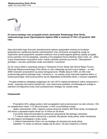 Międzynarodowy Dzień Wody piątek, 20 marca 2009 14:09 22 marca każdego roku przypada termin obchodów Światowego Dnia Wody, ustanowionego przez Zgromadzenie Ogólne ONZ w rezolucji 47/193 z 22 grudnia 1992 roku. Ideą obchodów tego dnia jest uświadomienie wpływu gospodarki wodnej na kondycje gospodarczą i społeczną państw członkowskich oraz zwrócenie szczególnej uwagi na racjonalne wykorzystywanie zasobów wodnych oraz przestrzeganie głównej zasady przyjętej przez państwa Unii Europejskiej, zawartej w Europejskiej Karcie Wodnej, która mówi, że: „Wod a jest dziedzictwem wszystkich ludzi i każdy człowiek powinien ją chronić. Obowiązkiem każdego z nas jest użytkować wodę oszczędnie i rozważnie " Do 22 marca 2009 w Istambule potrwa V Światowe Forum Wody (5th World Water Forum). Obchody Międzynarodowego Dnia Wody co roku odbywają się pod innym hasłem – w roku 2009 motywem przewodnim są wody transgraniczne. Wedle danych ONZ, aż 263 rzeki przekraczają granice jednego kraju. Oznacza to , że zasoby wody stanowią wspólne dobro, a zanieczyszczając rzeki przyczyniamy się do degradacji środowiska także u naszych sąsiadów. Przyjęta działania zakładają osiągnięcie do roku 2015 międzynarodowych celów związanych z wodą i poprawą warunków sanitarnych, oraz stworzenie podstaw umożliwiających postęp w zakresie zmniejszenia liczby ludzi pozbawionych dostępu do czystej wody. Ciekawostki - Przeciętnie 33% całego poboru wód europejskich jest przeznaczane na cele rolnicze, 16% na zaopatrzenie miast, 11% dla przemysłu, a 40% na produkcję energii. - Jeden mieszkaniec USA i Japonii zużywa dziennie średnio 350 litrów wody, Europejczyk200 litrów a obywatel krajów Afryki od 10 litrów do 20 litrów. - 3 tyś litrów dziennie potrzeba by wytworzyć pożywienie dla jednego człowieka - 1,7 miliona osób umiera rokrocznie z powodu złej jakości wody pitnej, braku kanalizacji lub złej higieny wynikającej z braku wody - 1 miliard mieszkańców Ziemi nie ma dostępu do bezpiecznej wody pitnej - Zaledwie 1% wody na świecie nadaje się do picia i nie jest uwięziony w lodzie 1/2 Międzynarodowy Dzień Wody piątek, 20 marca 2009 14:09 - 1 litr zużytego oleju silnikowego wylany do rzeki lub kanalizacji jest w stanie zanieczyścić 1 milion litrów wody. 2/2