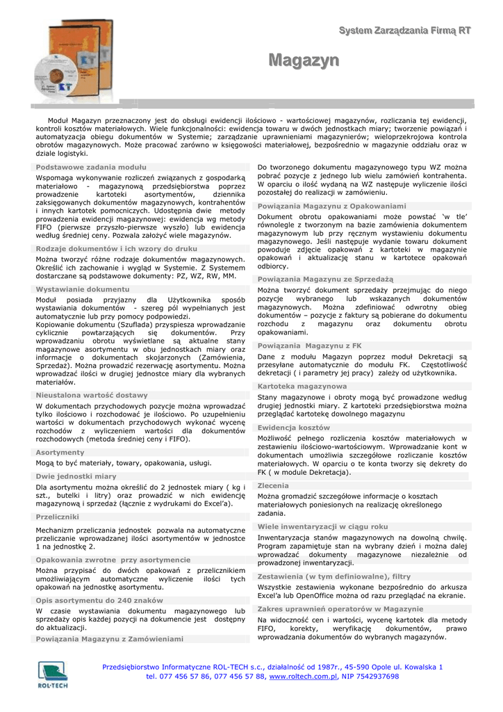 SSyysstteem m ZZaarrzząąddzzaanniiaa FFiirrm mąą R RTT Magazyn Moduł Magazyn przeznaczony jest do obsługi ewidencji ilościowo - wartościowej magazynów, rozliczania tej ewidencji, kontroli kosztów materiałowych. Wiele funkcjonalności: ewidencja towaru w dwóch jednostkach miary; tworzenie powiązań i automatyzacja obiegu dokumentów w Systemie; zarządzanie uprawnieniami magazynierów; wieloprzekrojowa kontrola obrotów magazynowych. Może pracować zarówno w księgowości materiałowej, bezpośrednio w magazynie oddziału oraz w dziale logistyki. Podstawowe zadania modułu Wspomaga wykonywanie rozliczeń związanych z gospodarką materiałowo - magazynową przedsiębiorstwa poprzez prowadzenie kartoteki asortymentów, dziennika zaksięgowanych dokumentów magazynowych, kontrahentów i innych kartotek pomocniczych. Udostępnia dwie metody prowadzenia ewidencji magazynowej: ewidencja wg metody FIFO (pierwsze przyszło-pierwsze wyszło) lub ewidencja według średniej ceny. Pozwala założyć wiele magazynów. Rodzaje dokumentów i ich wzory do druku Można tworzyć różne rodzaje dokumentów magazynowych. Określić ich zachowanie i wygląd w Systemie. Z Systemem dostarczane są podstawowe dokumenty: PZ, WZ, RW, MM. Wystawianie dokumentu Moduł posiada przyjazny dla Użytkownika sposób wystawiania dokumentów - szereg pól wypełnianych jest automatycznie lub przy pomocy podpowiedzi. Kopiowanie dokumentu (Szuflada) przyspiesza wprowadzanie cyklicznie powtarzających się dokumentów. Przy wprowadzaniu obrotu wyświetlane są aktualne stany magazynowe asortymentu w obu jednostkach miary oraz informacje o dokumentach skojarzonych (Zamówienia, Sprzedaż). Można prowadzić rezerwację asortymentu. Można wprowadzać ilości w drugiej jednostce miary dla wybranych materiałów. Nieustalona wartość dostawy W dokumentach przychodowych pozycje można wprowadzać tylko ilościowo i rozchodować je ilościowo. Po uzupełnieniu wartości w dokumentach przychodowych wykonać wycenę rozchodów z wyliczeniem wartości dla dokumentów rozchodowych (metoda średniej ceny i FIFO). Asortymenty Mogą to być materiały, towary, opakowania, usługi. Dwie jednostki miary Dla asortymentu można określić do 2 jednostek miary ( kg i szt., butelki i litry) oraz prowadzić w nich ewidencję magazynową i sprzedaż (łącznie z wydrukami do Excel’a). Przeliczniki Mechanizm przeliczania jednostek pozwala na automatyczne przeliczanie wprowadzanej ilości asortymentów w jednostce 1 na jednostkę 2. Opakowania zwrotne przy asortymencie Można przypisać do dwóch opakowań z przelicznikiem umożliwiającym automatyczne wyliczenie ilości tych opakowań na jednostkę asortymentu. Opis asortymentu do 240 znaków W czasie wystawiania dokumentu magazynowego lub sprzedaży opis każdej pozycji na dokumencie jest dostępny do aktualizacji. Powiązania Magazynu z Zamówieniami Do tworzonego dokumentu magazynowego typu WZ można pobrać pozycje z jednego lub wielu zamówień kontrahenta. W oparciu o ilość wydaną na WZ następuje wyliczenie ilości pozostałej do realizacji w zamówieniu. Powiązania Magazynu z Opakowaniami Dokument obrotu opakowaniami może powstać ‘w tle’ równolegle z tworzonym na bazie zamówienia dokumentem magazynowym lub przy ręcznym wystawieniu dokumentu magazynowego. Jeśli następuje wydanie towaru dokument powoduje zdjęcie opakowań z kartoteki w magazynie opakowań i aktualizację stanu w kartotece opakowań odbiorcy. Powiązania Magazynu ze Sprzedażą Można tworzyć dokument sprzedaży przejmując do niego pozycje wybranego lub wskazanych dokumentów magazynowych. Można zdefiniować odwrotny obieg dokumentów – pozycje z faktury są pobierane do dokumentu rozchodu z magazynu oraz dokumentu obrotu opakowaniami. Powiązania Magazynu z FK Dane z modułu Magazyn poprzez moduł Dekretacji są przesyłane automatycznie do modułu FK. Częstotliwość dekretacji ( i parametry jej pracy) zależy od użytkownika. Kartoteka magazynowa Stany magazynowe i obroty mogą być prowadzone według drugiej jednostki miary. Z kartoteki przedsiębiorstwa można przeglądać kartotekę dowolnego magazynu Ewidencja kosztów Możliwość pełnego rozliczenia kosztów materiałowych w zestawieniu ilościowo-wartościowym. Wprowadzanie kont w dokumentach umożliwia szczegółowe rozliczanie kosztów materiałowych. W oparciu o te konta tworzy się dekrety do FK ( w module Dekretacja). Zlecenia Można gromadzić szczegółowe informacje o kosztach materiałowych poniesionych na realizację określonego zadania. Wiele inwentaryzacji w ciągu roku Inwentaryzacja stanów magazynowych na dowolną chwilę. Program zapamiętuje stan na wybrany dzień i można dalej wprowadzać dokumenty magazynowe niezależnie od prowadzonej inwentaryzacji. Zestawienia (w tym definiowalne), filtry Wszystkie zestawienia wykonane bezpośrednio do arkusza Excel’a lub OpenOffice można od razu przeglądać na ekranie. Zakres uprawnień operatorów w Magazynie Na widoczność cen i wartości, wycenę kartotek dla metody FIFO, korekty, weryfikację dokumentów, prawo wprowadzania dokumentów do wybranych magazynów. Przedsiębiorstwo Informatyczne ROL-TECH s.c., działalność od 1987r., 45-590 Opole ul. Kowalska 1 tel. 077 456 57 86, 077 456 57 88, www.roltech.com.pl, NIP 7542937698