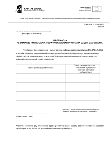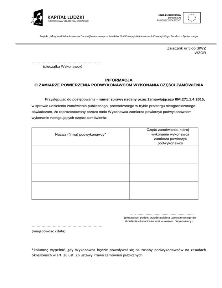 Projekt „Mały oddział w kosmosie” współfinansowany ze środków Unii Europejskiej w ramach Europejskiego Funduszu Społecznego Załącznik nr 5 do SIWZ WZÓR ……………………………………………….. (pieczątka Wykonawcy) INFORMACJA O ZAMIARZE POWIERZENIA PODWYKONAWCOM WYKONANIA CZĘŚCI ZAMÓWIENIA Przystępując do postępowania - numer sprawy nadany przez Zamawiającego RM.271.1.4.2015, w sprawie udzielenia zamówienia publicznego, prowadzonego w trybie przetargu nieograniczonego oświadczam, że reprezentowany przeze mnie Wykonawca zamierza powierzyć podwykonawcom wykonanie następujących części zamówienia: Nazwa (firma) podwykonawcy* Część zamówienia, której wykonanie wykonawca zamierza powierzyć podwykonawcy …….................................................. (pieczątka i podpis przedstawiciela upoważnionego do składania oświadczeń woli w imieniu Wykonawcy) ………………………………………………… (miejscowość i data) *kolumnę wypełnić, gdy Wykonawca będzie powoływał się na zasoby podwykonawców na zasadach określonych w art. 26 ust. 2b ustawy Prawo zamówień publicznych