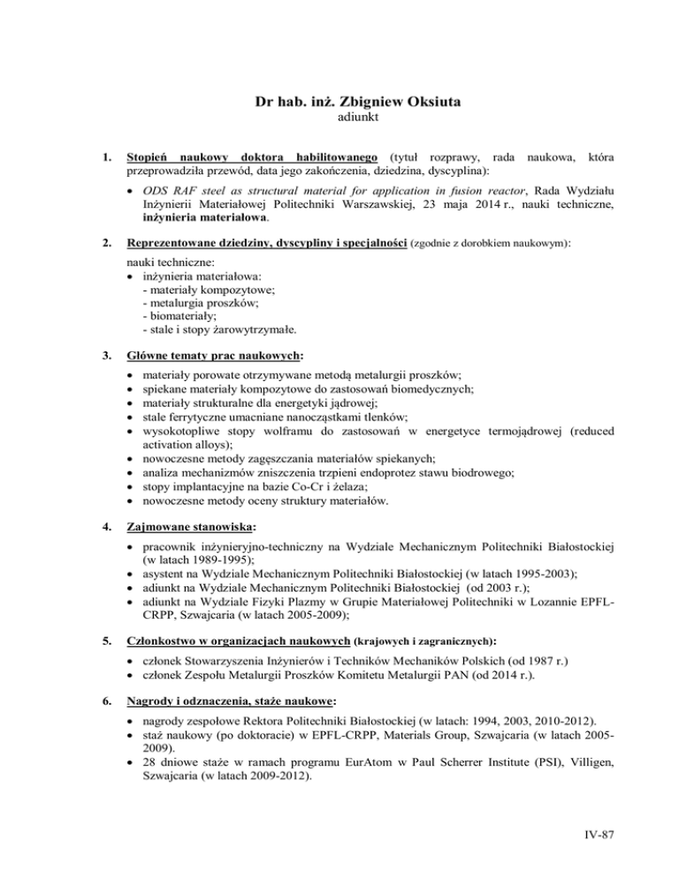 Dr hab. inż. Zbigniew Oksiuta adiunkt 1. Stopień naukowy doktora habilitowanego (tytuł rozprawy, rada przeprowadziła przewód, data jego zakończenia, dziedzina, dyscyplina): naukowa, która ODS RAF steel as structural material for application in fusion reactor, Rada Wydziału Inżynierii Materiałowej Politechniki Warszawskiej, 23 maja 2014 r., nauki techniczne, inżynieria materiałowa. 2. Reprezentowane dziedziny, dyscypliny i specjalności (zgodnie z dorobkiem naukowym): nauki techniczne: inżynieria materiałowa: - materiały kompozytowe; - metalurgia proszków; - biomateriały; - stale i stopy żarowytrzymałe. 3. Główne tematy prac naukowych: 4. materiały porowate otrzymywane metodą metalurgii proszków; spiekane materiały kompozytowe do zastosowań biomedycznych; materiały strukturalne dla energetyki jądrowej; stale ferrytyczne umacniane nanocząstkami tlenków; wysokotopliwe stopy wolframu do zastosowań w energetyce termojądrowej (reduced activation alloys); nowoczesne metody zagęszczania materiałów spiekanych; analiza mechanizmów zniszczenia trzpieni endoprotez stawu biodrowego; stopy implantacyjne na bazie Co-Cr i żelaza; nowoczesne metody oceny struktury materiałów. Zajmowane stanowiska: pracownik inżynieryjno-techniczny na Wydziale Mechanicznym Politechniki Białostockiej (w latach 1989-1995); asystent na Wydziale Mechanicznym Politechniki Białostockiej (w latach 1995-2003); adiunkt na Wydziale Mechanicznym Politechniki Białostockiej (od 2003 r.); adiunkt na Wydziale Fizyki Plazmy w Grupie Materiałowej Politechniki w Lozannie EPFLCRPP, Szwajcaria (w latach 2005-2009); 5. Członkostwo w organizacjach naukowych (krajowych i zagranicznych): członek Stowarzyszenia Inżynierów i Techników Mechaników Polskich (od 1987 r.) członek Zespołu Metalurgii Proszków Komitetu Metalurgii PAN (od 2014 r.). 6. Nagrody i odznaczenia, staże naukowe: nagrody zespołowe Rektora Politechniki Białostockiej (w latach: 1994, 2003, 2010-2012). staż naukowy (po doktoracie) w EPFL-CRPP, Materials Group, Szwajcaria (w latach 20052009). 28 dniowe staże w ramach programu EurAtom w Paul Scherrer Institute (PSI), Villigen, Szwajcaria (w latach 2009-2012). IV-87 7. Osiągnięcia w kształceniu kadry naukowej: pomocniczy opiekun naukowy 1 doktorantki na stażu zagranicznym w EPFL-CRPP (Szwajcaria). 8. Organizacja konferencji, redakcja czasopism, recenzje: członek Komitetu Organizacyjnego Sympozjum Inżynieria Ortopedyczna i Protetyczna w latach 1998-2001 i 2012; recenzent prac w czasopismach naukowych: Journal of Nuclear Materials, Fusion Engineering and Design, Physical Review B, Archives of Material Science and Engineering. 9. Projekty badawcze: główny wykonawca 2 projektów badawczych Komitetu Badań Naukowych realizowanych w Politechnice Białostockiej: - Otrzymywanie biomateriałów na implanty biomechaniczne metodą metalurgii proszków, projekt KBN Nr 7 TO8D 025 15, termin realizacji 1998-2000; - Kompozytowe wszczepy dokostne na bazie stopu Co-Cr-Mo, projekt KBN nr 7 TO8D 030 21, termin realizacji 2001-2004; główny wykonawca 3 projektów o zasięgu międzynarodowym: - Structural Materials: High performance steels, program EFDA (European Fusion Development Agreement), termin realizacji 2005-2009, EPFL-CRPP (Szwajcaria); - Nanostructured Metallic Materials, program ExtreMat (New Materials for Extreme Environment), nr. NMP3-CT-2004-500253, termin realizacji 2004-2008, EPFL-CRPP (Szwajcaria), Paul Scherrer Institute, Villigen; - Badania materiałowe i obliczenia numeryczne służące budowie przyszłego reaktora syntezy termojądrowej, program Euratom, nr. FU07-CT-2007-00061, Politechnika Warszawska, termin realizacji 2013 r.. 10. Publikacje (w sumie 60): monografia habilitacyjna opublikowana przez ośrodek uczelniany – 1; artykuły w czasopismach z listy filadelfijskiej – 27 (J. Nuclear Materials, Nuclear Fusion, Journal of Materials Processing Technology, Powder Metallurgy, Journal of Materials Science, Fusion Engineering and Design); artykuły w innych czasopismach z listy ministerialnej – 20; publikowane referaty na międzynarodowych konferencjach – 4; publikowane referaty na konferencjach krajowych – 9; patent – 1 (w trakcie wdrażania); cytowania wg Web of Science (bez autocytowań) – 130; indeks Hirscha wg Web of Science – H=9. 11. Ważniejsze prace (maks. 10 pozycji): 1. Oksiuta Z., Baluc N., Effect of mechanical alloying atmosphere on the microstructure and Charpy impact properties of an ODS ferritic steel, J. Nucl. Mater. 386–388 (2009) 426–429. 2. Oksiuta Z., Baluc N., Optimization of the chemical composition and manufacturing route for ODS RAF steels for fusion reactor application, Nuclear Fusion 49 (2009) 1–9. 3. Oksiuta Z., Olier P., de Carlan Y., Baluc N., Development and characterization of a new ODS ferritic steel for fusion reactor application, J. Nucl. Mater. 393 (2009) 114–119. 4. Oksiuta Z., Dąbrowski J.R., Olszyna A., Co–Cr–Mo-based composite reinforced with bioactive glass, Journal of Materials Processing Technology, 209 (2009) 978–985. 5. Oksiuta Z., Lewandowska M., Kurzydłowski K. J., Baluc N., Reduced activation ODS ferritic steel – recent development in high speed hot extrusion processing, Phys. Status Solidi A, 207(5), (2010) 1128–1131. IV-88 6. Oksiuta Z., Lewandowska M., Kurzydłowski K. J., Baluc N., Influence of hot rolling and high speed hydrostatic extrusion on the microstructure and mechanical properties of an ODS RAF steel, J. Nucl. Mater. 409 (2011) 86–93. 7. Oksiuta Z., Mueller P., Spätig P., Baluc N., Effect of thermo-mechanical treatments on the microstructure and mechanical properties of an ODS ferritic steel, J. Nucl. Mater. 412 (2011) 221–226. 8. Oksiuta Z., High temperature oxidation resistance of ultrafine-grained 14%Cr ODS ferritic steel Journal of Materials Science, (2013) 48, 4801–4805. 9. Oksiuta Z., Kozikowski P., Lewandowska M., Ohnuma M., Koppoju S., Kurzydłowski K. J., Micr