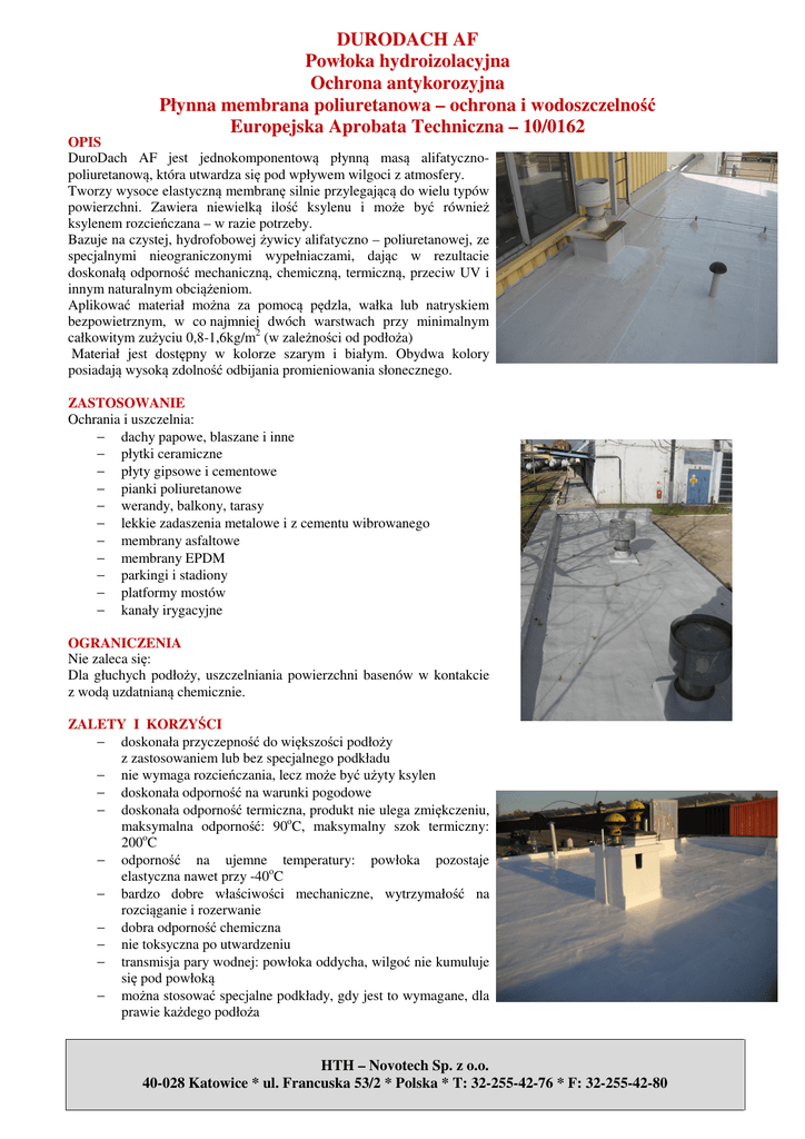 DURODACH AF Powłoka hydroizolacyjna Ochrona antykorozyjna Płynna membrana poliuretanowa – ochrona i wodoszczelność Europejska Aprobata Techniczna – 10/0162 OPIS DuroDach AF jest jednokomponentową płynną masą alifatycznopoliuretanową, która utwardza się pod wpływem wilgoci z atmosfery. Tworzy wysoce elastyczną membranę silnie przylegającą do wielu typów powierzchni. Zawiera niewielką ilość ksylenu i może być również ksylenem rozcieńczana – w razie potrzeby. Bazuje na czystej, hydrofobowej żywicy alifatyczno – poliuretanowej, ze specjalnymi nieograniczonymi wypełniaczami, dając w rezultacie doskonałą odporność mechaniczną, chemiczną, termiczną, przeciw UV i innym naturalnym obciążeniom. Aplikować materiał można za pomocą pędzla, wałka lub natryskiem bezpowietrznym, w co najmniej dwóch warstwach przy minimalnym całkowitym zużyciu 0,8-1,6kg/m2 (w zależności od podłoża) Materiał jest dostępny w kolorze szarym i białym. Obydwa kolory posiadają wysoką zdolność odbijania promieniowania słonecznego. ZASTOSOWANIE Ochrania i uszczelnia: − dachy papowe, blaszane i inne − płytki ceramiczne − płyty gipsowe i cementowe − pianki poliuretanowe − werandy, balkony, tarasy − lekkie zadaszenia metalowe i z cementu wibrowanego − membrany asfaltowe − membrany EPDM − parkingi i stadiony − platformy mostów − kanały irygacyjne OGRANICZENIA Nie zaleca się: Dla głuchych podłoży, uszczelniania powierzchni basenów w kontakcie z wodą uzdatnianą chemicznie. ZALETY I KORZYŚCI − doskonała przyczepność do większości podłoży z zastosowaniem lub bez specjalnego podkładu − nie wymaga rozcieńczania, lecz może być użyty ksylen − doskonała odporność na warunki pogodowe − doskonała odporność termiczna, produkt nie ulega zmiękczeniu, maksymalna odporność: 90oC, maksymalny szok termiczny: 200oC − odporność na ujemne temperatury: powłoka pozostaje elastyczna nawet przy -40oC − bardzo dobre właściwości mechaniczne, wytrzymałość na rozciąganie i rozerwanie − dobra odporność chemiczna − nie toksyczna po utwardzeniu − transmisja pary wodnej: powłoka oddycha, wilgoć nie kumuluje się pod powłoką − można stosować specjalne podkłady, gdy jest to wymagane, dla prawie każdego podłoża HTH – Novotech Sp. z o.o. 40-028 Katowice * ul. Francuska 53/2 * Polska * T: 32-255-42-76 * F: 32-255-42-80 DURODACH AF Powłoka hydroizolacyjna Ochrona antykorozyjna Płynna membrana poliuretanowa – ochrona i wodoszczelność Europejska Aprobata Techniczna – 10/0162 DANE TECHNICZNE: wytrzymałość na zrywanie w temp. 23oC wydłużenie w temp. 23oC Wydłużenie w temp. -25oC Odporność na masy wiatru > 55kg/cm2 > 600% > 450% >50KPa twardość (skala Shore’a) 70 współ. odporności na dyfuzję pary wodnej temperatura użytkowania maksymalny szok temperaturowy u = 1105 -40oC do +90oC 200oC lepkość (skala Brookfielda) ciężar właściwy punkt zapłonu 2000 – 8000 PCF 1,3 – 1,4 gr/cm3 42oC HTH – Novotech Sp. z o.o. 40-028 Katowice * ul. Francuska 53/2 * Polska * T: 32-255-42-76 * F: 32-255-42-80