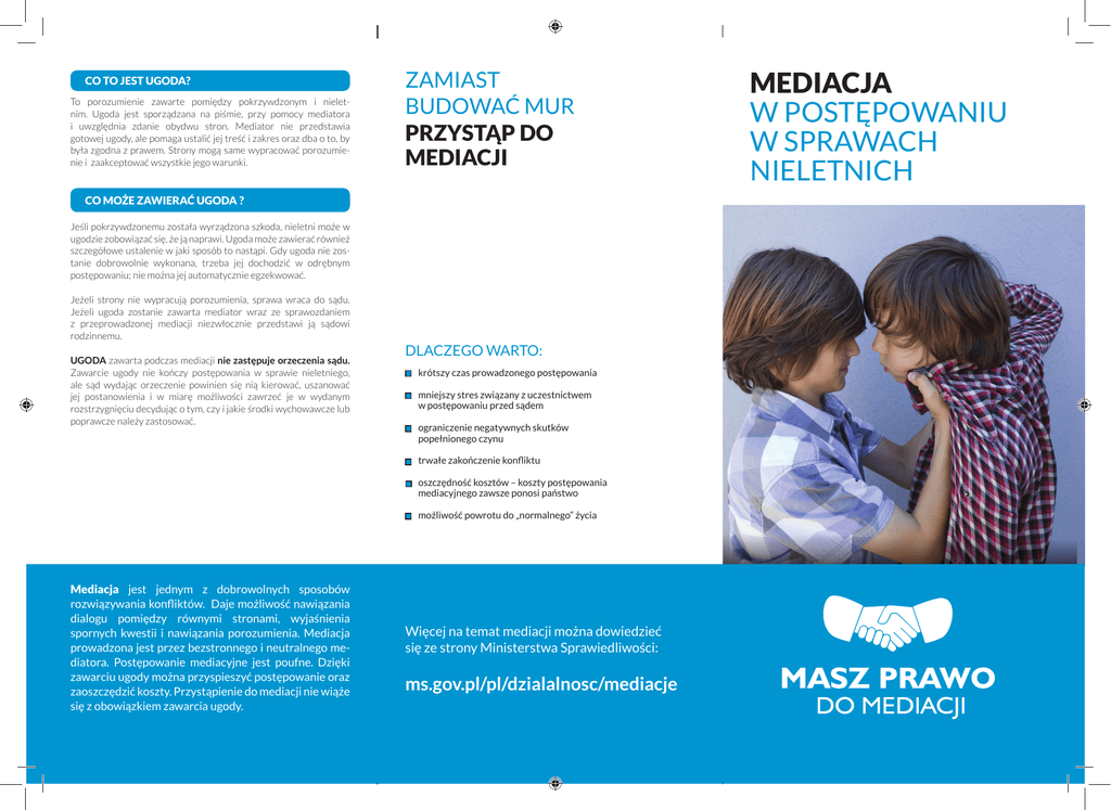 CO TO JEST UGODA? To porozumienie zawarte pomiędzy pokrzywdzonym i nieletnim. Ugoda jest sporządzana na piśmie, przy pomocy mediatora i uwzględnia zdanie obydwu stron. Mediator nie przedstawia gotowej ugody, ale pomaga ustalić jej treść i zakres oraz dba o to, by była zgodna z prawem. Strony mogą same wypracować porozumienie i zaakceptować wszystkie jego warunki. ZAMIAST BUDOWAĆ MUR PRZYSTĄP DO MEDIACJI CO MOŻE ZAWIERAĆ UGODA ? Jeśli pokrzywdzonemu została wyrządzona szkoda, nieletni może w ugodzie zobowiązać się, że ją naprawi. Ugoda może zawierać również szczegółowe ustalenie w jaki sposób to nastąpi. Gdy ugoda nie zostanie dobrowolnie wykonana, trzeba jej dochodzić w odrębnym postępowaniu; nie można jej automatycznie egzekwować. Jeżeli strony nie wypracują porozumienia, sprawa wraca do sądu. Jeżeli ugoda zostanie zawarta mediator wraz ze sprawozdaniem z przeprowadzonej mediacji niezwłocznie przedstawi ją sądowi rodzinnemu. UGODA zawarta podczas mediacji nie zastępuje orzeczenia sądu. Zawarcie ugody nie kończy postępowania w sprawie nieletniego, ale sąd wydając orzeczenie powinien się nią kierować, uszanować jej postanowienia i w miarę możliwości zawrzeć je w wydanym rozstrzygnięciu decydując o tym, czy i jakie środki wychowawcze lub poprawcze należy zastosować. DLACZEGO WARTO: krótszy czas prowadzonego postępowania mniejszy stres związany z uczestnictwem w postępowaniu przed sądem ograniczenie negatywnych skutków popełnionego czynu trwałe zakończenie konfliktu oszczędność kosztów – koszty postępowania mediacyjnego zawsze ponosi państwo możliwość powrotu do „normalnego” życia Mediacja jest jednym z dobrowolnych sposobów rozwiązywania konfliktów. Daje możliwość nawiązania dialogu pomiędzy równymi stronami, wyjaśnienia spornych kwestii i nawiązania porozumienia. Mediacja prowadzona jest przez bezstronnego i neutralnego mediatora. Postępowanie mediacyjne jest poufne. Dzięki zawarciu ugody można przyspieszyć postępowanie oraz zaoszczędzić koszty. Przystąpienie do mediacji nie wiąże się z obowiązkiem zawarcia ugody. Więcej na temat mediacji można dowiedzieć się ze strony Ministerstwa Sprawiedliwości: ms.gov.pl/pl/dzialalnosc/mediacje MEDIACJA W POSTĘPOWANIU W SPRAWACH NIELETNICH CZYM JEST MEDIACJA? MEDIACJA jest sposobem na dobrowolne rozwiązanie konfliktu karnego, który powstał pomiędzy nieletnim a pokrzywdzonym. Mediacja opiera się na idei sprawiedliwości naprawczej, która daje pokrzywdzonemu możliwość aktywnego udziału w prowadzonym postępowaniu i wyrażenia swojego zdania. Mediacja umożliwia spotkanie stron po to, aby nawiązać dialog, porozumienie oraz zawrzeć ugodę. Dla pokrzywdzonego MEDIACJA jest szansą na: czynne dochodzenie swoich praw szybkie uzgodnienie satysfakcjonującego go sposobu naprawienia szkody materialnej wyrażenie swoich problemów i uczuć, odreagowania emocji wyzbycie się lęku powstałego na skutek popełnienia przez nieletniego czynu przywrócenie poczucia bezpieczeństwa i zaufania do społeczeństwa poznanie i zrozumienie motywów działania sprawcy Nieletniemu MEDIACJA daje możliwość: przyjęcia na siebie odpowiedzialności za popełniony czyn przeproszenia i wyrażenia skruchy zrozumienia, że wyrządził krzywdę konkretnej osobie wytłumaczenia swojego postępowania zmiany zachowania a przez to nieraz pojednania się z pokrzywdzonym MEDIACJA prowadzona jest w ramach postępowania w sprawach nieletnich, choć toczy się poza sądem rodzinnym, który kieruje do niej sprawy. Powinna oddziaływać wychowawczo na nieletniego, nauczyć go ponosić konsekwencje swoich zachowań, ale też umożliwić mu uniknięcie naznaczenia. MEDIACJA ma pomóc porozumieć się nieletniemu i pokrzywdzonemu, dlatego jej przeprowadzenie nie jest możliwe bez ich udziału. Oprócz nich uczestnikami mediacji są rodzice lub opiekun nieletniego, a jeżeli również pokrzywdzony jest nieletni – także jego rodzice lub opiekunowie. Do przeprowadzenia mediacji konieczna jest zgoda wszystkich tych osób. MEDIACJA jest zatem dobrowolna – uczestnicy mogą się na nią nie zgodzić, a także mogą w dowolnym momencie i bez podania przyczyny z niej zrezygnować bez żadnych negatywnych skutków. ZAMIAST BUDOWAĆ MUR PRZYSTĄP DO MEDIACJI Do mediacji nie powinny być kierowane sprawy, w których nieletni ze względu na wiek i stopień rozwoju nie potrafi zrozumieć znaczenia mediacji, czy też w których ze względu na stan psychiczny, uzależnienie od alkoholu lub środków odurzających strona nie może wyrazić świadomie zgody na mediację. Inicjatywa przeprowadzenia mediacji może wyjść od: sądu rodzinnego MEDIACJA może odbyć się: bezpośrednio, czyli podczas spotkania stron „twarzą w twarz” w obecności mediatora a gdy spotkanie takie nie jest możliwe, mediator może działać jak pośrednik, o ile względy wychowawcze nieletniego nie stoją temu na przeszkodzie. W takim wypadku mediator spotyka się z każdą ze stron na osobności przekazując wzajemne propozycje i oczekiwania co do możliwej ugody (mediacja pośrednia) pokrzywdzonego nieletniego, a także jego rodziców Sąd może skierować sprawę do mediacji zwłaszcza wtedy, gdy okoliczności nie budzą wątpliwości, sprawa nie jest skomplikowana pod względem dowodowym, a nieletni nie zaprzecza, że popełnił zarzucany mu czyn. O przeprowadzenie mediacji najlepiej jest wyraźnie wnioskować. Jeżeli wszyscy uczestnicy się na nią zgodzą sąd rodzinny wyda postanowienie, w którym określi osobę mediatora oraz termin, w którym mediacja powinna się zakończyć. Termin ten nie powinien przekraczać 6 tygodni, a w wyjątkowo uzasadnionych przypadkach może być przedłużony na czas określony, do 14 dni. Spotkanie mediacyjne przebiega w nieformalnej atmosferze. Strony są jego gospodarzami i mogą podczas niego swobodnie się wypowiadać – jednak w myśl zaakceptowanych pr