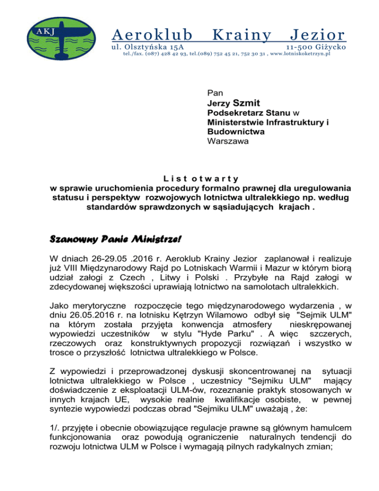 Aeroklub ul. Olsztyńska 15A Krainy Jezior 11-500 Giżycko tel./fax. (087) 428 42 93, tel.(089) 752 45 21, 752 30 31 , www.lotniskoketrzyn.pl Pan Jerzy Szmit Podsekretarz Stanu w Ministerstwie Infrastruktury i Budownictwa Warszawa List otwarty w sprawie uruchomienia procedury formalno prawnej dla uregulowania statusu i perspektyw rozwojowych lotnictwa ultralekkiego np. według standardów sprawdzonych w sąsiadujących krajach . Szanowny Panie Ministrze! W dniach 26-29.05 .2016 r. Aeroklub Krainy Jezior zaplanował i realizuje już VIII Międzynarodowy Rajd po Lotniskach Warmii i Mazur w którym biorą udział załogi z Czech , Litwy i Polski . Przybyłe na Rajd załogi w zdecydowanej większości uprawiają lotnictwo na samolotach ultralekkich. Jako merytoryczne rozpoczęcie tego międzynarodowego wydarzenia , w dniu 26.05.2016 r. na lotnisku Kętrzyn Wilamowo odbył się "Sejmik ULM" na którym została przyjęta konwencja atmosfery nieskrępowanej wypowiedzi uczestników w stylu "Hyde Parku" . A więc szczerych, rzeczowych oraz konstruktywnych propozycji rozwiązań i wszystko w trosce o przyszłość lotnictwa ultralekkiego w Polsce. Z wypowiedzi i przeprowadzonej dyskusji skoncentrowanej na sytuacji lotnictwa ultralekkiego w Polsce , uczestnicy "Sejmiku ULM" mający doświadczenie z eksploatacji ULM-ów, rozeznanie praktyk stosowanych w innych krajach UE, wysokie realnie kwalifikacje osobiste, w pewnej syntezie wypowiedzi podczas obrad "Sejmiku ULM" uważają , że: 1/. przyjęte i obecnie obowiązujące regulacje prawne są głównym hamulcem funkcjonowania oraz powodują ograniczenie naturalnych tendencji do rozwoju lotnictwa ULM w Polsce i wymagają pilnych radykalnych zmian; 2/. formuła nadzoru lotnictwa ultralekkiego przez inspektorów ULC wdrożonych do nadzorowania wysoce skomplikowanych i restrykcyjnych wymagań na podstawie przepisów PART wprowadzonych przez UE nie sprawdziła się. Zdaniem zebranej na Sejmiku społeczności lotniczej dzieje się tak dlatego, że procedury oparte na przepisach krajowych dotyczące szczególnie obszaru techniki i operacji lotniczych w zakresie statków powietrznych ultralekkich są (prawdopodobnie mimo woli urzędników) „dopasowywane” do procedur wynikających z wyżej wspomnianych przepisów UE dla lotnictwa, co powoduje ich nadmierną restrykcyjność i hamowanie w Polsce rozwoju lotnictwa ultralekkiego. Ta sytuacja jest głównym powodem poszukiwania przez inicjatorów rozwoju lotnictwa ULM innych rozwiązań prawno-organizacyjnego w Polsce; 3/. Ogólnie rzecz biorąc, przesadne i nie uzasadnione wymagania prawne oraz stosowane procedury wobec lotnictwa ultralekkiego w Polsce są głównym powodem, że większość (ponad 90%) samolotów ULM , których właścicielami są Polacy , zostały zarejestrowane w Czechach , Słowacji, na Litwie i we Francji. Także i tam są ubezpieczane ze względu na dostępność, klarowność formy, koszty i jasność warunków podpisywanych umów ubezpieczeniowych. Mając zaufanie do Pana Ministra gotowości udzielenia wsparcia dla zmiany sytuacji lotnictwa ultralekkiego w Polsce (zapalenia dla tego lotnictwa „zielonego światła”), wnioskujemy o spowodowanie powołania Resortowego zespołu z osób znających specyfikę lotnictwa ultralekkiego, którego pilnym celem powinno być: 1. Przygotowanie noweli Prawa Lotniczego umożliwiającej wyłączenie lotnictwa ultralekkiego z jurysdykcji prawnej Prezesa Urzędu Lotnictwa Cywilnego i wniesienie do uchwalenia przez Sejmu RP. 2. Określenie nowych zasad formalno-prawnych lotnictwa ultralekkiego (samolotów do 600 kg i wodnosamolotów do 650 kg) przez wydanie Rozporządzenia Ministra Infrastruktury i Budownictwa - z wykorzystaniem doświadczeń oraz sprawdzonych regulacji prawnych stosowanych w innych krajach UE np. w Czechach. 3. Wybór i powierzenie spraw ULM w zakresie szkolenia i wydawania licencji (świadectw kwalifikacji) oraz rejestracji, budowy i nadzorów technicznych nad samolotami ULM podmiotowi prawnemu o statusie Stowarzyszenia , Fundacji lub Spółki Prawa Handlowego - spełniający kryteria określone w odpowiednich regulacjach prawnych. 4. Wybranemu przez Ministerstwo Infrastruktury i Budownictwa podmiotowi prawnemu , mającemu stosowne ubezpieczenie OC umożliwienie przy wsparciu Departamentu Prawno-legislacyjnego podlegającego Panu Ministrowi opracowania wymagań organizacyjnych, szkoleniowych i technicznych dla lotnictwa ultralekkiego oraz określenia własnej struktury funkcjonowania jak i kompetencji osób zaangażowanych w realizację zadań na rzecz ULM. 5. Środowisko lotnicze obecne na "Sejmiku" proponuje aby działalność operacyjna podmiotu któremu zostanie powierzona organizacja i nadzór nad lotnictwem ultralekkim, powinna się bilansować finansowo, bez angażowania środków budżetowych . 6. Godnym rozwagi jest/będzie problem określenia sposobu finansowania prac rozwojowo - badawczych stymulujących rozwój oraz innowacyjność w dziedzinie lotnictwa ultralekkiego. Spowodowanie przez Ministerstwo Infrastruktury i Budownictwa wnioskowanych zmian formalno-prawnych, będzie maiło znacznie dla większego zainteresowania społeczeństwa polskiego tą dziedziną lotnictwa , przyczyni się do dynamicznego rozwoju lotnictwa ultralekkiego, przyrostu nowych miejsc pracy w projektowaniu i budownictwie samolotów ULM oraz ich eksploatacji i serwisowaniu. Najistotniejszym powodem dla którego należy pilnie dokonać wymienionych wyżej zmian, to spowodowanie takich regulacji które spowodują adekwatność wymagań formalnych do realnie niezbędnych potrzeb branży. Należy także, jako cel nadrzędny, mieć na względzie wychowanie polskiej młodzieży poprzez łatwiejszy (relatywnie tańszy niż dotychczas) dostęp do sportu i turystyki lotniczej , poprzez organizowanie i atrakcyjne w formie rozbudzanie zainteresowania młodzieży lotnictwem z wykorzystanie doświadczonej kadry pedagogów-instruktorów w duchu własnych doko