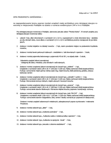 Załącznik nr 7 do SIWZ OPIS PRZEDMIOTU ZAMÓWIENIA – na zagospodarowanie terenu poprzez montaż urządzeń małej architektury przy istniejącej stacyjce rowerowej w miejscowości Poddąbie na działce o numerze ewidencyjnym 244 w m-ci Poddąbie Przy istniejącej stacyjce rowerowej w Poddąbiu planowany jest plac zabaw ”Morska Kraina” . W ramach projektu przy istniejącej stacyjce rowerowej należy: 1. ustawić 3 kpl., altan drewnianych o wymiarach 2,5 x 2,0 m, wyposażonych w dwie drewniane ławy - siedziska po obu stronach stołu, nowe altany o wymiarach 2,5 m x 2,0 m architekturą powinny nawiązywać do już istniejących, 2. dostawa i montaż stojaków na dziesięć rowerów - 3 kpl., razem powstanie miejsce na postawienie trzydziestu rowerów, 3. dostawa i montaż ławek parkowych stalowych z siedziskiem z bali drewnianych i oparciem - 3 stuki, 4. dostawa i montaż pojemnika betonowego o pojemności 45 do 50 l., na odpady stałe – 3 sztuki, Ustawienie urządzeń siłowni zewnętrznej: - dostępnej dla dzieci, młodzieży ,oraz dorosłych i osób starszych, 5. dostawa i montaż urządzenia (siłowni zewnętrznej) do ćwiczeń typu „orbitrek” - 1 kpl., Urządzenie o wymiarach około 2,90 m dł. X 0,56 szer. X 2,00 wys. Należy zachować strefę bezpieczeństwa. Funkcja: wzmocnienie mięśni górnej i dolnej części nóg, mięśni brzucha, klatki piersiowej, grzbietu, obręczy barkowej i ramion 6. dostawa i montaż urządzenia (siłowni zewnętrznej) do ćwiczeń typu „wahadło” ( surfem ) - 1 kpl., Urządzenie o wymiarach około 2,90 m dł. X 0,56 szer. X 2,00 wys. Należy zachować strefę bezpieczeństwa. Funkcja: Wzmocnienie kończyn dolnych, mięśni udowych i bocznych brzucha. 7. dostawa i montaż urządzenia (siłowni zewnętrznej) do ćwiczeń typu „poręcze” - 1 kpl., Urządzenie o wymiarach około 1,50 m dł. X 0,80 szer. X 2,00 wys. Należy zachować strefę bezpieczeństwa. Funkcja: wzmocnienie stawów biodrowych. Wzmacnia mięśnie brzucha, poprawia koordynację ruchową. 8. dostawa i montaż urządzenia (siłowni zewnętrznej) do ćwiczeń typu „koło TAI-CHI” - 1 kpl., Urządzenie o wymiarach około 1,38 m dł. X 1,03 szer. X 2,00 wys. Należy zachować strefę bezpieczeństwa. Funkcja: wzmocnienie stawów nadgarstków, łokci, ramion i bioder, wzmacnia je i poprawia ich elastyczność . Dostawa i montaż urządzeń zabawowych metalowych, zabezpieczonych poprze ocynkowanie i malowanie Proszkowe. 9. dostawa i montaż zabawki typu „slider” - 1 kpl., 10. dostawa i montaż zabawki typu „huśtawka podwójna” - 1 kpl., 11. dostawa i montaż zabawki typu „ huśtawka ważka z metalową belką i oparciem” - 1 kpl., 12. dostawa i montaż zabawki typu „huśtawka na sprężynie - kiwak” - 2 kpl., 13. dostawa i montaż zabawki typu „karuzela z czterema siedziskami” - 1 kpl., 14. dostawa i montaż zestawu zabawowego z elementami tematyki nadmorskiej – forma statku lub połączonych dwóch statków o łącznej długości około 12 m oraz szerokości około 12 m . W zestawie powinny być zamontowane: wieża obserwacyjna, bulaje, wejścia linowe, zjeżdżalnie, drabinki oraz inne elementy pasujące do zestawu o tematyce nadmorskiej. - burty statku oraz elementy ozdobne wykonać z kolorowego tworzywa , - elementy metalowe ocynkowane malowane proszkowo, - liny z rdzeniem stalowym powlekane, - urządzenie stabilnie zamontowane na płycie betonowej. 15. rozścielenie ziemi urodzajnej 15,00 m³, 16. ręczne wykonanie trawników dywanowych - 300,00 m² 2. Wykonawca zobowiązany jest do wykonania dostawy i montażu urządzeń zabawowych wyżej wymienionych wyłącznie z materiałów i urządzeń fabrycznie nowych, dopuszczonych do obrotu i powszechnego stosowania, objętych certyfikatem w zakresie tzw. znaku bezpieczeństwa, wskazującego na zgodność z Polską Normą, 3. Wykonawca zobowiązany jest dostarczyć karty techniczne do każdego urządzenia wraz z certyfikatami. 4. W przypadku, gdy w opisie zamówienia zostało wskazane pochodzenie (marka, znak towarowy, producent, dostawca) Zamawiający dopuszcza jednocześnie produkty równoważne o parametrach jakościowych i cechach użytkowych, co najmniej na poziomie parametrów wskazanego produktu , uznając tym samym każdy produkt o wskazanych parametrach lub lepszych. W takiej sytuacji Zamawiający wymaga złożenia stosownych dokumentów, uwiarygodniających te materiały lub urządzenia.