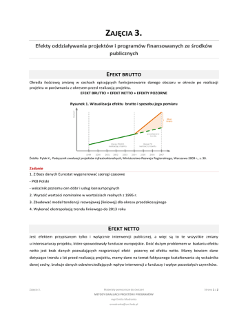 ZAJĘCIA 3. Efekty oddziaływania projektów i programów finansowanych ze środków publicznych EFEKT BRUTTO Określa ilościową zmianę w cechach opisujących funkcjonowanie danego obszaru w okresie po realizacji projektu w porównaniu z okresem przed realizacją projektu. EFEKT BRUTTO = EFEKT NETTO + EFEKTY POZORNE Rysunek 1. Wizualizacja efektu brutto i sposobu jego pomiaru Źródło: Pylak K., Podręcznik ewaluacji projektów infrastrukturalnych, Ministerstwo Rozwoju Regionalnego, Warszawa 2009 r., s. 30. Zadanie 1. Z Bazy danych Eurostat wygenerowad szeregi czasowe - PKB Polski - wskaźnik poziomu cen dóbr i usług konsumpcyjnych 2. Wyrazid wartości nominalne w wartościach realnych z 1995 r. 3. Zbudowad model tendencji rozwojowej (liniowej) dla okresu przedakcesyjnego 4. Wykonad ekstrapolację trendu liniowego do 2013 roku EFEKT NETTO Jest efektem przypisanym tylko i wyłącznie interwencji publicznej, a więc są to te wszystkie zmiany u interesariuszy projektu, które spowodowały fundusze europejskie. Dośd dużym problemem w badaniu efektu netto jest brak danych pozwalających rozgraniczyd efekt pozorny od efektu netto. Mamy bowiem dane dotyczące trendu z lat przed realizacją projektu, mamy dane na temat faktycznego kształtowania się wskaźnika danej cechy, brakuje danych odzwierciedlających wpływ interwencji z funduszy i wpływ pozostałych czynników. Zajęcia 3. Materiały pomocnicze do dwiczeo METODY EWALUACJI PROJETÓW I PROGRAMÓW mgr Emilia Modranka [email protected] Strona 1 z 2 Rysunek 2. Wizualizacja efektów netto i pozornych Źródło: Pylak K., Podręcznik ewaluacji projektów infrastrukturalnych, Ministerstwo Rozwoju Regionalnego, Warszawa 2009 r., s. 32. EFEKTY CZĄSTKOWE (POZYTYWNE I NEGATYWNE) REALIZACJI PROJEKTÓW Efekty pozytywne Efekty negatywne Dodatkowości Zdarzenia niezależnego - Deadweight Przemieszczenia: przesiąkania Przemieszczania: wyciekania Przemieszczenia: przyciągania Przemieszczania: przyciągania Mnożnikowy: dochodowy Substytucyjny Mnożnikowy: dostaw SPOSOBY OBLICZANIA EFEKTU NETTO Odgórny Obliczenie efektu brutto Oszacowanie w jakim stopniu został on wywołany w skutek oddziaływania pomocy publicznej. Oddolny Zsumowanie wszystkich efektów cząstkowych pozytywnych negatywnych. Odliczenie efektu zdarzenia niezależnego (deadweight) Jest bardziej dokładny i precyzyjny od sposobu odgórnego, ale przez to – bardziej czaso- i kosztochłonny. Zajęcia 3. Materiały pomocnicze do dwiczeo METODY EWALUACJI PROJETÓW I PROGRAMÓW mgr Emilia Modranka [email protected] Strona 2 z 2