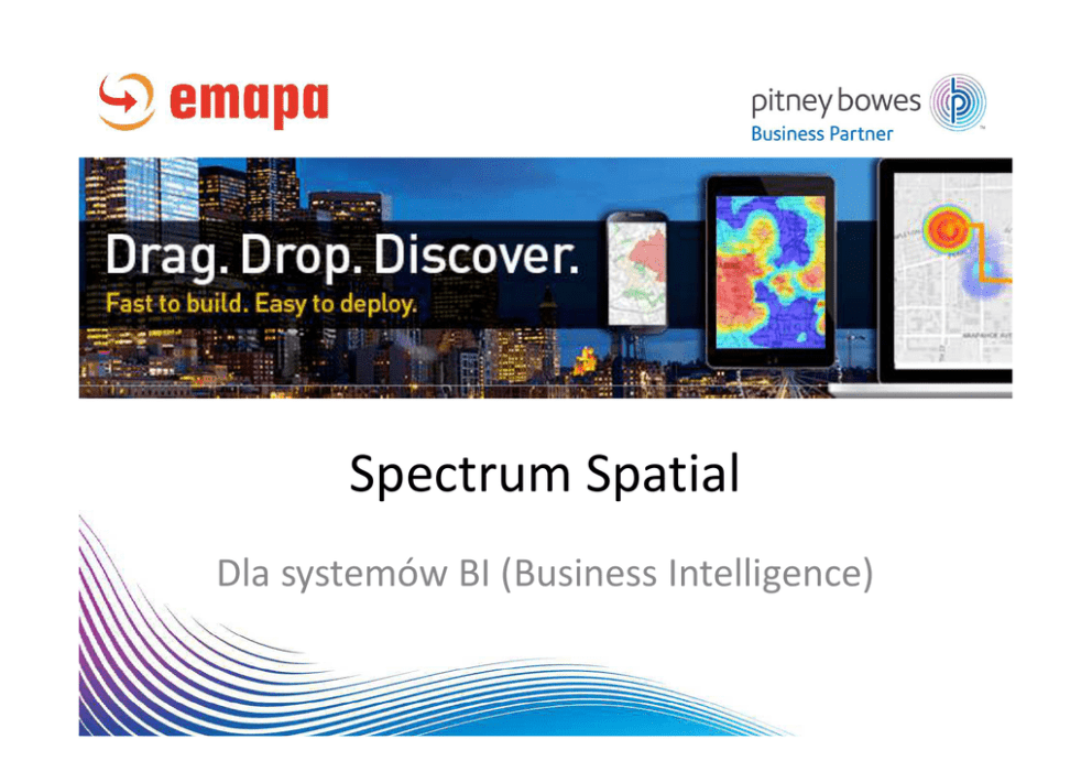 Spectrum Spatial Dla systemów BI (Business Intelligence) Czym jest Spectrum Spatial? • Spectrum Spatial jest platformą programistyczną, która umożliwia lokalizację danych w przestrzeni w celu szybkiego i trafnego podejmowania decyzji biznesowych. • Spectrum Spatial pozwala zawsze, wszędzie i każdemu, uzyskać wgląd do danych przestrzennych dostępnych wcześniej tylko dla wąskiej grupy odbiorców. Dzięki podziałowi na moduły Spectrum Spatial umożliwia rozwiązania w pełni dostosowanego do potrzeb Klienta. Czynnik geograficzny Prawie każda firma musi stale: • Monitorować wyniki (sprzedaż, koszt, ludzie). Analizować rynek i kierunki rozwoju w oparciu o czynnik geograficzny. • Znajdować rynki zbytu biorąc pod uwagę czynnik geograficzny. Definiować strukturę rynku, segmentację Klienta, planować merchandising. • Planować w oparciu o lokalizację. Rozbudowywać sieć, przeprowadzać analizy położenia punktu sprzedaży, przeprowadzać penetrację rynku. • Lokować kapitał uwzględniając lokalizację – zasoby techniczne, serwis, etc. • Śledzić zasoby uwzględniając czynnik lokalizacyjny – analizować rozmieszczenie Klientów, w prosty sposób dokonać rejonizacji sprzedaży, zarządzać aktywami i ich eksploatacją. • Zarządzać sektorem usług w oparciu o czynnik geograficzny – obsługa Klienta, obsługa finansowa, naprawy itd. Systemy BI (Business Intelligence) Współczesne systemy BI umożliwiają zadawanie skomplikowanych zapytań, tworzenie zaawansowanych analiz i uzyskiwanie kompletnych raportów. Dają one jednak ograniczoną możliwość porównywania, wyszukiwania i wizualizacji danych opartych o czynnik lokalizacyjny, dotyczących np. infrastruktury, demografii, sądownictwa czy sieci dystrybucyjnych. Czego zatem brakuje? Mapy Mapa Mapa pozwala Użytkownikowi w wymiarze przestrzennym dostrzec trendy czy wskaźniki wydajności, które byłyby niewidoczne przy śledzeniu jedynie tabel , raportów czy wykresów. Systemy BI + mapa Spectrum Spatial dla systemów BI pozwala na znacznie głębsze analizy biznesowe, umożliwiając płynną transmisję danych z raportu do mapy, a z mapy z powrotem do raportu. Przestrzenny filtr danych Filtrowanie danych oparte o czynnik geograficzny umożliwia Użytkownikom wdrożenie wymiaru przestrzennego do analiz biznesowych i raportów. Współpraca z narzędziami BI Spectrum Spatial dla systemów BI współpracuje z całym wachlarzem narzędzi BI, m.in.: Actuate®, BIRT™, SAP Business Objects, IBM Cognos, Oracle (OBIEE i Hyperion) — w połączeniu z QlikView®, MicroStrategy, Microsoft Reporting Services oraz Excel. Szybkość Niekwestionowaną zaletą oprogramowania Spectrum Spatial dla systemów BI jest brak konieczności przechowywania mapy i danych na tym samym serwerze, co zdecydowanie przyspiesza ich przetwarzanie. Integracja Spectrum Spatial dla systemów BI jest potężnym, gotowym rozwiązaniem umożliwiającym dwukierunkową integrację pomiędzy systemem BI a zaawansowanymi możliwościami analizy przestrzennej. Daje to analitykom marketingowym, biznesowym i innym pracownikom umysłowym znacznie lepsze rozumienie aspektu przestrzennego danych, z którymi pracują w ramach swojego systemu BI. Spectrum Spatial dla systemów BI korzyści Spectrum Spatial dla systemów BI oferuje szereg wymiernych korzyści biznesowych, m.in.: zwiększa moc systemów BI dostarczając kompletną platformę do przeprowadzania analiz biznesowych dostarcza wiedzę w sposób bezpieczny, uwzględniając istniejące zabezpieczenia danych firmowych natychmiast zwraca informację przestrzenną (nie wymaga eksperckiej wiedzy w dziedzinie GIS ani pisania dodatkowych kodów) pozwala trafnie podejmować decyzje biznesowe w oparciu o czynnik lokalizacyjny, z wykorzystaniem znanych i sprawdzonych narzędzi BI Zapraszam do kontaktu Emapa S.A. ul. Górczewska 216, 01-460 Warszawa tel. (22) 638 46 81 wew. 500 Oddział w Łodzi: ul. Łąkowa 11, 90-562 Łódź tel. (42) 633 92 79 e-mail: [email protected]