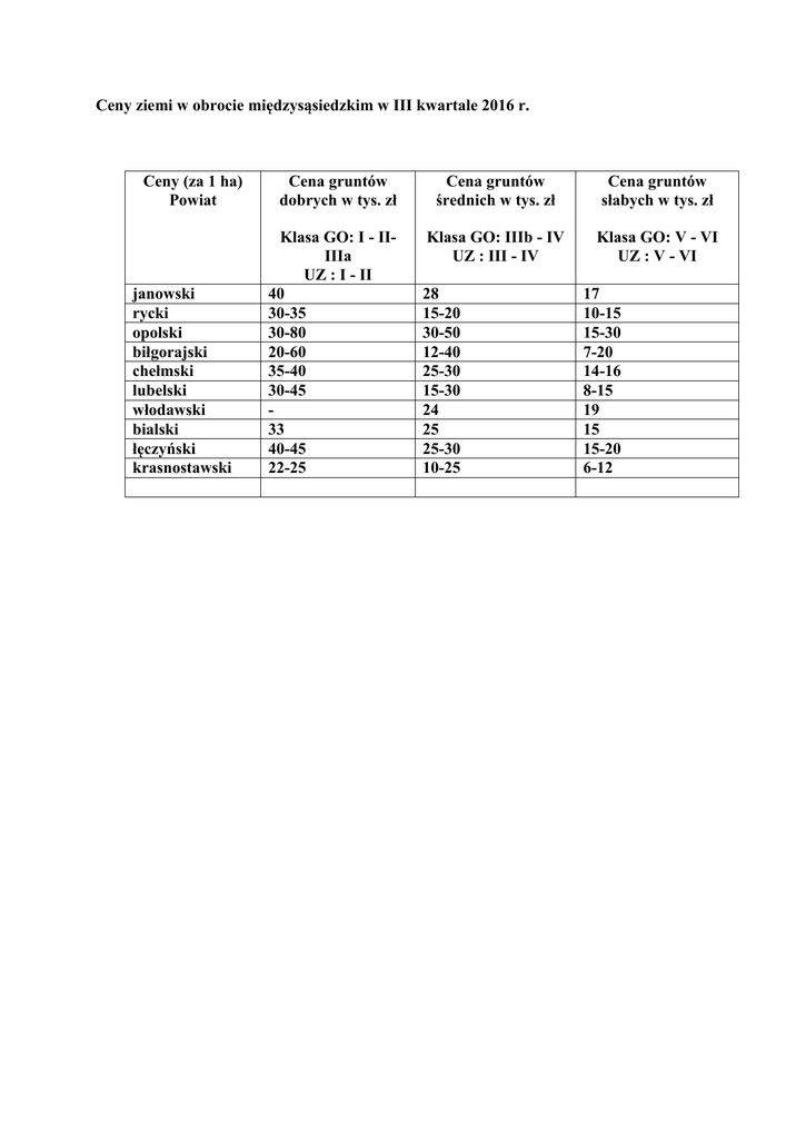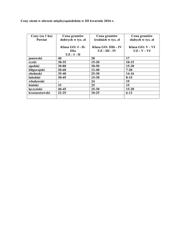 Ceny ziemi w obrocie międzysąsiedzkim w III kwartale 2016 r. Ceny (za 1 ha) Powiat janowski rycki opolski biłgorajski chełmski lubelski włodawski bialski łęczyński krasnostawski Cena gruntów dobrych w tys. zł Klasa GO: I - IIIIIa UZ : I - II 40 30-35 30-80 20-60 35-40 30-45 33 40-45 22-25 Cena gruntów średnich w tys. zł Cena gruntów słabych w tys. zł Klasa GO: IIIb - IV UZ : III - IV Klasa GO: V - VI UZ : V - VI 28 15-20 30-50 12-40 25-30 15-30 24 25 25-30 10-25 17 10-15 15-30 7-20 14-16 8-15 19 15 15-20 6-12