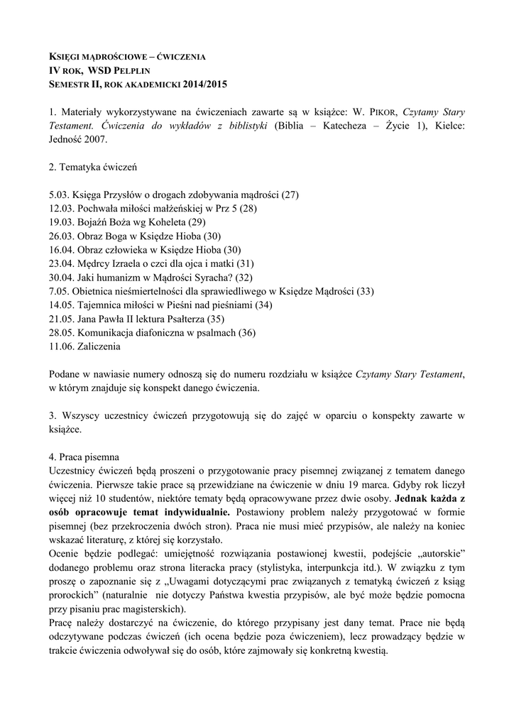 KSIĘGI MĄDROŚCIOWE – ĆWICZENIA IV ROK, WSD PELPLIN SEMESTR II, ROK AKADEMICKI 2014/2015 1. Materiały wykorzystywane na ćwiczeniach zawarte są w książce: W. PIKOR, Czytamy Stary Testament. Ćwiczenia do wykładów z biblistyki (Biblia – Katecheza – Życie 1), Kielce: Jedność 2007. 2. Tematyka ćwiczeń 5.03. Księga Przysłów o drogach zdobywania mądrości (27) 12.03. Pochwała miłości małżeńskiej w Prz 5 (28) 19.03. Bojaźń Boża wg Koheleta (29) 26.03. Obraz Boga w Księdze Hioba (30) 16.04. Obraz człowieka w Księdze Hioba (30) 23.04. Mędrcy Izraela o czci dla ojca i matki (31) 30.04. Jaki humanizm w Mądrości Syracha? (32) 7.05. Obietnica nieśmiertelności dla sprawiedliwego w Księdze Mądrości (33) 14.05. Tajemnica miłości w Pieśni nad pieśniami (34) 21.05. Jana Pawła II lektura Psałterza (35) 28.05. Komunikacja diafoniczna w psalmach (36) 11.06. Zaliczenia Podane w nawiasie numery odnoszą się do numeru rozdziału w książce Czytamy Stary Testament, w którym znajduje się konspekt danego ćwiczenia. 3. Wszyscy uczestnicy ćwiczeń przygotowują się do zajęć w oparciu o konspekty zawarte w książce. 4. Praca pisemna Uczestnicy ćwiczeń będą proszeni o przygotowanie pracy pisemnej związanej z tematem danego ćwiczenia. Pierwsze takie prace są przewidziane na ćwiczenie w dniu 19 marca. Gdyby rok liczył więcej niż 10 studentów, niektóre tematy będą opracowywane przez dwie osoby. Jednak każda z osób opracowuje temat indywidualnie. Postawiony problem należy przygotować w formie pisemnej (bez przekroczenia dwóch stron). Praca nie musi mieć przypisów, ale należy na koniec wskazać literaturę, z której się korzystało. Ocenie będzie podlegać: umiejętność rozwiązania postawionej kwestii, podejście „autorskie” dodanego problemu oraz strona literacka pracy (stylistyka, interpunkcja itd.). W związku z tym proszę o zapoznanie się z „Uwagami dotyczącymi prac związanych z tematyką ćwiczeń z ksiąg prorockich” (naturalnie nie dotyczy Państwa kwestia przypisów, ale być może będzie pomocna przy pisaniu prac magisterskich). Pracę należy dostarczyć na ćwiczenie, do którego przypisany jest dany temat. Prace nie będą odczytywane podczas ćwiczeń (ich ocena będzie poza ćwiczeniem), lecz prowadzący będzie w trakcie ćwiczenia odwoływał się do osób, które zajmowały się konkretną kwestią. 5. Problematyka prac pisemnych 19.03. W jakiego Boga wierzył Kohelet? 26.03. W jakim stopniu zasada odpłaty została poddana krytyce w Księdze Hioba? 16.04. Księga Hioba wobec pytania o przyczyny i sens ludzkiego cierpienia 23.04. Jaką postawę rodziców wobec dzieci postuluje się w Mądrości Syracha? 30.04. Jak przeżywać przyjaźń według Syracha? 7.05. O jakiej nieśmiertelności mówi się w Księdze Mądrości? 14.05. Co stanowi istotę miłości wg Pieśni nad pieśniami? 21.05. W jaki sposób Psalmy łączyły się z liturgią w biblijnym Izraelu? 28.05. W jakim sensie „imię” funkcjonuje w Psałterzu jako nazwa własna Boga? 6. Na ocenę końcową z ćwiczeń złożą się następujące elementy: a) ocena aktywności uczestników ćwiczeń (5 pkt); b) ocena umiejętności rozwiązania problemu postawionego w ramach danego ćwiczenia (5 pkt). Punktacja: 3 (5 pkt) 3+ (6 pkt) 4 (7 pkt) 4+ (8 pkt) 5 (9-10 pkt) 7. Bibliografia do ksiąg mądrościowych (wybór) LITERATURA MĄDROŚCIOWA Wstępy Duchowość Starego Testamentu, red. A. Fanuli i in., Historia duchowości 1, Kraków 2002, 463-560 Mądrość starotestamentowego Izraela, red. S. Potocki – J. Warzecha – T. Brzegowy – B. Poniży, Wprowadzenie w myśl i wezwanie ksiąg biblijnych 6, Warszawa 1999 POTOCKI, S., «Księgi mądrościowe Starego Testamentu», w: Wstęp do Starego Testamentu, red. L. Stachowiak, Poznań 1990, 384-489 POTOCKI, S., Rady mądrości. Przewodnik po mądrościowej literaturze Starego Testamentu, Jak rozumieć Pismo święte 5, Lublin 1993 SALAS, A., Mądrość Izraela. Sumienie i Prawo – rozważania, Biblia i życie 5,Częstochowa 1999 SYNOWIEC, J.S., Mędrcy Izraela, ich pisma i nauka, Kraków 1990 ZAWISZEWSKI, E., Księgi dydaktyczne Starego Testamentu, Pelplin 1997, 13-98 Księga Hioba CHIRPAZ, F., Księga Hioba. Poemat o nadziei, Poznań 1999 JAKUBIEC, C., Księga Hioba. Wstęp – przekład z oryginału – komentarz – ekskursy, PŚST 7.1, Poznań – Warszawa 1974 TRONINA, A., Księga Hioba. Wstęp – przekład z oryginału – komentarz, NKB.ST 15, Częstochowa 2013. Księga Koheleta BONORA, A., Księga Koheleta, Rozumieć Stary Testament, Kraków 1997 FILIPIAK, M., Księga Koheleta. Wstęp – przekład z oryginału – komentarz, PŚST 8.2, Poznań – Warszawa 1980 RAVASI, G., Kohelet, Zgłębiać Biblię, Kraków 2003 Księga Mądrości PONIŻY, B., Księga Mądrości. Od egzegezy do teologii, Biblioteka pomocy naukowych wydziału teologicznego w UAM w Poznaniu 17, Poznań 2000 PONIŻY, B., Księga Mądrości. Wstęp – przekład z oryginału – komentarz, NKB.ST 20, Częstochowa 2012. ROMANIUK, K., Księga Mądrości. Wstęp – przekład z oryginału – komentarz, PŚST 8.3, Poznań – Warszawa 1969 KSIĘGI POETYCKIE Wstępy BRZEGOWY, T., Psałterz dawidowy. Wprowadzenie i egzegeza wybranych psalmów, Pomoce naukowe Instytutu Teologicznego w Tarnowie 10, Tarnów 1994 PETER, M., Wykład Pisma świętego Starego Testamentu, Poznań 1959, 375-612 Pieśni Izraela, red. A. Strus – J. Warzecha – J. Frankowski, Wprowadzenie w myśl i wezwanie ksiąg biblijnych 7, Warszawa 1988 STACHOWIAK, L., «Księga Psalmów», w: Wstęp do Starego Testamentu, red. L. Stachowiak, Poznań 1990, 348-383 SYNOWIEC, J.S., Wprowadzenie do Księgi psalmów, Kraków 1996 TRONINA, A., Teologia psalmów, Jak rozumieć Pismo święte 8, Lublin 1995 ZAWISZEWSKI, E., Księgi dydaktyczne Starego Testamentu, Pelplin 1997, 99-203 Księga Psalmów BOROWSKI, W., Psalmy. Komentarz biblijno-ascetyczny, Kraków 1983 BRZEGOWY,