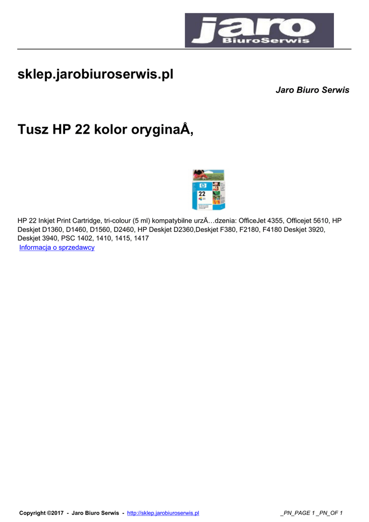 sklep.jarobiuroserwis.pl Jaro Biuro Serwis Tusz HP 22 kolor oryginaÅ‚ HP 22 Inkjet Print Cartridge, tri-colour (5 ml) kompatybilne urzÄ…dzenia: OfficeJet 4355, Officejet 5610, HP Deskjet D1360, D1460, D1560, D2460, HP Deskjet D2360,Deskjet F380, F2180, F4180 Deskjet 3920, Deskjet 3940, PSC 1402, 1410, 1415, 1417 Informacja o sprzedawcy Copyright ©2017 - Jaro Biuro Serwis - http://sklep.jarobiuroserwis.pl _PN_PAGE 1 _PN_OF 1