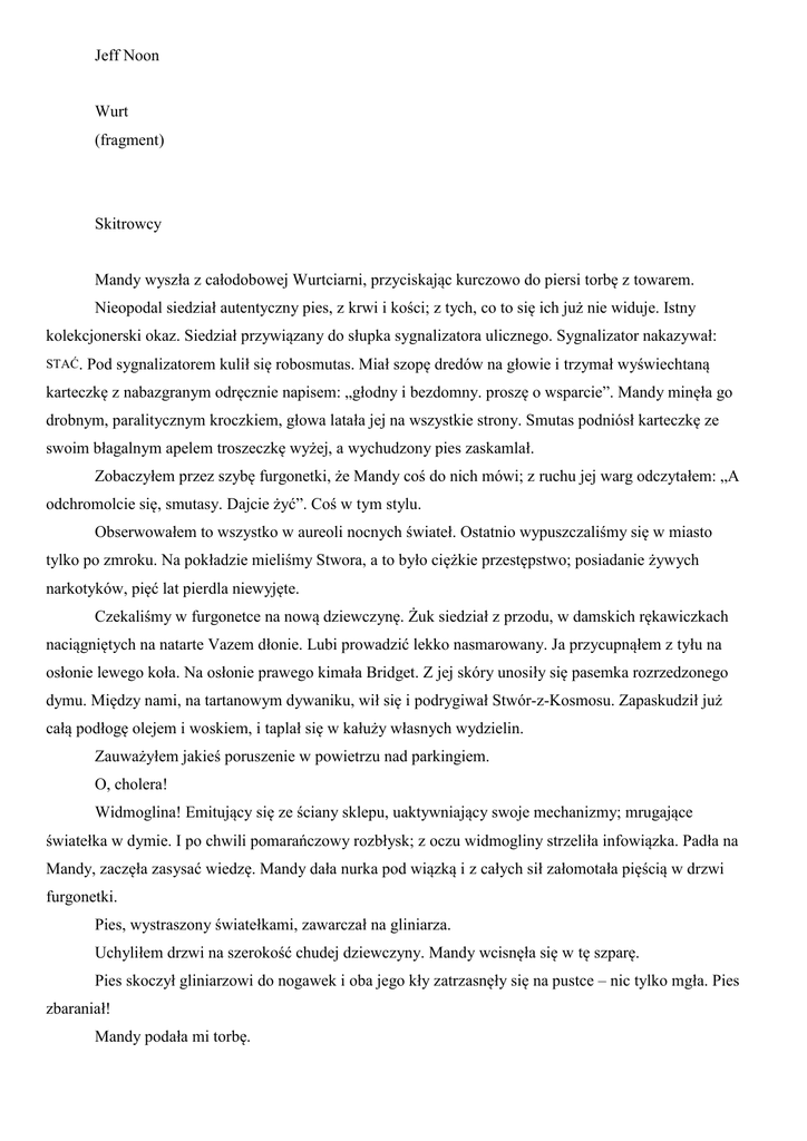 Jeff Noon Wurt (fragment) Skitrowcy Mandy wyszła z całodobowej Wurtciarni, przyciskając kurczowo do piersi torbę z towarem. Nieopodal siedział autentyczny pies, z krwi i kości; z tych, co to się ich już nie widuje. Istny kolekcjonerski okaz. Siedział przywiązany do słupka sygnalizatora ulicznego. Sygnalizator nakazywał: STAĆ. Pod sygnalizatorem kulił się robosmutas. Miał szopę dredów na głowie i trzymał wyświechtaną karteczkę z nabazgranym odręcznie napisem: „głodny i bezdomny. proszę o wsparcie”. Mandy minęła go drobnym, paralitycznym kroczkiem, głowa latała jej na wszystkie strony. Smutas podniósł karteczkę ze swoim błagalnym apelem troszeczkę wyżej, a wychudzony pies zaskamlał. Zobaczyłem przez szybę furgonetki, że Mandy coś do nich mówi; z ruchu jej warg odczytałem: „A odchromolcie się, smutasy. Dajcie żyć”. Coś w tym stylu. Obserwowałem to wszystko w aureoli nocnych świateł. Ostatnio wypuszczaliśmy się w miasto tylko po zmroku. Na pokładzie mieliśmy Stwora, a to było ciężkie przestępstwo; posiadanie żywych narkotyków, pięć lat pierdla niewyjęte. Czekaliśmy w furgonetce na nową dziewczynę. Żuk siedział z przodu, w damskich rękawiczkach naciągniętych na natarte Vazem dłonie. Lubi prowadzić lekko nasmarowany. Ja przycupnąłem z tyłu na osłonie lewego koła. Na osłonie prawego kimała Bridget. Z jej skóry unosiły się pasemka rozrzedzonego dymu. Między nami, na tartanowym dywaniku, wił się i podrygiwał Stwór-z-Kosmosu. Zapaskudził już całą podłogę olejem i woskiem, i taplał się w kałuży własnych wydzielin. Zauważyłem jakieś poruszenie w powietrzu nad parkingiem. O, cholera! Widmoglina! Emitujący się ze ściany sklepu, uaktywniający swoje mechanizmy; mrugające światełka w dymie. I po chwili pomarańczowy rozbłysk; z oczu widmogliny strzeliła infowiązka. Padła na Mandy, zaczęła zasysać wiedzę. Mandy dała nurka pod wiązką i z całych sił załomotała pięścią w drzwi furgonetki. Pies, wystraszony światełkami, zawarczał na gliniarza. Uchyliłem drzwi na szerokość chudej dziewczyny. Mandy wcisnęła się w tę szparę. Pies skoczył gliniarzowi do nogawek i oba jego kły zatrzasnęły się na pustce – nic tylko mgła. Pies zbaraniał! Mandy podała mi torbę. – Masz? – spytałem, wciągając ją do środka. Mandarynkowy rozbłysk na zewnątrz, powódź światła. – Mam trochę Ślicznotek – odburknęła, przekraczając rozwalonego na podłodze Stwora. – A to masz? Mandy nic nie odpowiedziała; tylko na mnie patrzyła. Na zewnątrz coś przeraźliwie zawyło. Zerknąłem przez ramię; biedny pies hajcował się jak pochodnia, widmoglina szedł na nas, przeładowując broń. Skupioną infowiązkę kierował na naszą tablicę rejestracyjną. Numer stanowił zbitkę przypadkowych cyfr. Nie znajdziesz go w swoich bankach. Drzwi Wurtciarni otworzyły się nagle z hukiem i wypadł z nich młody, spietrany mężczyzna. – To Seb – szepnęła Mandy. Za nim ze sklepu wyskoczyli dwaj gliniarze. Wersje z krwi i kości. Ciałogliny. Osaczali Seba, zaganiając go na płot z drucianej siatki, który ciągnął się wzdłuż jednego boku parkingu. Odwróciłem się do Żuka. – To kocioł! – krzyknąłem. – Ruszaj, Żuczek! Wyrywamy stąd! I wyrwaliśmy. Najpierw na wstecznym, od pachołków. – Uważaj! – wydarła się Mandy, wkurzona jak diabli, bo w momencie, kiedy furgonetka ruszała z kopyta w tył, ścięło ją z nóg i wylądowała na Stworze-z-Kosmosu. Ja trzymałem się parcianych uchwytów. Brid, wyrwana brutalnie z drzemki, wytrzeszczała półprzytomne oczy. Stwór oplótł sześcioma mackami Mandy. Dziewczyna wrzeszczała. Furgonetka podskoczyła na krawężniku i wpadła tyłem na trotuar. Przemknęło mi przez myśl, że Żuk chce umknąć wiązkom, i może tak w istocie było, ale my wyczuliśmy tylko przyprawiający o mdłości głuchy chrzęst i rozdzierający skowyt kolekcjonerskiego okazu, któremu tylne lewe koło skracało cierpienia. Ruszyliśmy z piskiem opon do przodu, zostawiając za sobą smutasa zawodzącego nad swoim psem i przeszywającego pięściami cień widmogliny. Zarzuciło nami i zanim Żuk zdołał zapanować nad kierownicą, jeszcze raz przesunęła mi się przed oczyma cała scenka – widmoglina, smutas, rozjechany pies. Mandy szamotała się ze Stworem-z-Kosmosu, klnąc go na czym świat stoi. Widziałem ponad ramieniem Żuka wybiegający nam na spotkanie płot z drucianej siatki. Seb zeskakiwał właśnie na szyny tramwajowe po jego drugiej stronie. Dwaj ciałogliniarze wdrapywali się na płot. Żuk zapalił reflektory, przyszpilając ich snopami długich świateł do drucianej siatki. Z okrzykiem: „Juhuuu!!! Śmierć glinom! Śmierć glinom!” wdepnął gaz do dechy i Skitrowóz pomknął prosto na nich. Gliniarze odpadli od siatki. Aż miło było patrzeć na ich gęby skąpane w blasku reflektorów; ciałogliny srające ze strachu w portki. Teraz oni rzucili się do ucieczki przed szarżującą furgonetką, ale Żuk im odpuścił; w ostatniej chwili, jak stary rajdowiec, skręcił kierownicą. Skitrowóz zawrócił z poślizgiem i pomknął w kierunku bramy. Z klekotem i łomotem przewalających się po podłodze śmieci z tysiąca eskapad weszliśmy w ciasny nawrót, wpadliśmy w Albany, potem wiraż w lewo, i już byliśmy na Wilbraham Road. Mignęła mi jeszcze ściana Wurtciarni, a na jej tle widmoglina nadający w eter komunikaty. Z robosmutasa pozostała dymiąca kupka stopionego plastiku i ciała. W ciemnościach wyła gliniarska syrena. – Siedzą nam na ogonie, Żuczek! – krzyknąłem. – Daj po garach! Żuk nie kazał sobie tego dwa razy powtarzać. Kurczę, wprost frunęliśmy! Skitrowcy! Zjeżdżający z piórkami na chatę! Przyśpieszenie wepchnęło Mandy jeszcze głębiej w lepkie objęcia Stwora. – Odpierdol się ode mnie! – wrzasnęła na niego. Czepiając się kurczowo parcianeg