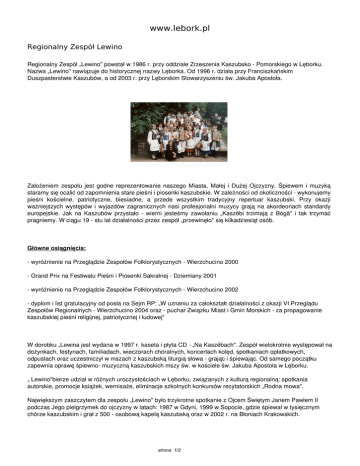 www.lebork.pl Regionalny Zespół Lewino Regionalny Zespół „Lewino" powstał w 1986 r. przy oddziale Zrzeszenia Kaszubsko - Pomorskiego w Lęborku. Nazwa „Lewino" nawiązuje do historycznej nazwy Lęborka. Od 1996 r. działa przy Franciszkańskim Duszpasterstwie Kaszubów, a od 2003 r. przy Lęborskim Stowarzyszeniu św. Jakuba Apostoła. Założeniem zespołu jest godne reprezentowanie naszego Miasta, Małej i Dużej Ojczyzny. Śpiewem i muzyką staramy się ocalić od zapomnienia stare pieśni i piosenki kaszubskie. W zależności od okoliczności - wykonujemy pieśni kościelne, patriotyczne, biesiadne, a przede wszystkim tradycyjny repertuar kaszubski. Przy okazji ważniejszych występów i wyjazdów zagranicznych nasi profesjonalni muzycy grają na akordeonach standardy europejskie. Jak na Kaszubów przystało - wierni jesteśmy zawołaniu „Kaszëbi trzimają z Bògã" i tak trzymać pragniemy. W ciągu 19 - stu lat działalności przez zespół „przewinęło" się kilkadziesiąt osób. Główne osiągnięcia: - wyróżnienie na Przeglądzie Zespołów Folklorystycznych - Wierzchucino 2000 - Grand Prix na Festiwalu Pieśni i Piosenki Sakralnej - Dziemiany 2001 - wyróżnienie na Przeglądzie Zespołów Folklorystycznych - Wierzchucino 2002 - dyplom i list gratulacyjny od posła na Sejm RP: „W uznaniu za całokształt działalności z okazji VI Przeglądu Zespołów Regionalnych - Wierzchucino 2004 oraz - puchar Związku Miast i Gmin Morskich - za propagowanie kaszubskiej pieśni religijnej, patriotycznej i ludowej" W dorobku „Lewina jest wydana w 1997 r. kaseta i płyta CD - „Na Kaszëbach". Zespół wielokrotnie występował na dożynkach, festynach, familiadach, wieczorach chóralnych, koncertach kolęd, spotkaniach opłatkowych, odpustach oraz uczestniczył w mszach z kaszubską liturgią słowa - grając i śpiewając. Od samego początku zapewnia oprawę śpiewno- muzyczną kaszubskich mszy św. w kościele św. Jakuba Apostoła w Lęborku. „ Lewino"bierze udział w różnych uroczystościach w Lęborku, związanych z kulturą regionalną: spotkania autorskie, promocje książek, wernisaże, eliminacje szkolnych konkursów recytatorskich „Rodna mowa". Największym zaszczytem dla zespołu „Lewino" było trzykrotne spotkanie z Ojcem Świętym Janem Pawłem II podczas Jego pielgrzymek do ojczyzny w latach: 1987 w Gdyni, 1999 w Sopocie, gdzie śpiewał w tysięcznym chórze kaszubskim i grał z 500 - osobową kapelą kaszubską oraz w 2002 r. na Błoniach Krakowskich. strona 1/2 Zespół gościł również w Telewizji Gdańsk w programie „Rodnô Zemia". Występował również podczas Finału Ogólnopolskiego Konkursu Literackiego im. M. Stryjewskiego w Lęborku, a także na otwarciu Międzynarodowej Enklawy Malarzy w Łebie i w Warszawie w 2000 roku. W lipcu 2003 r. Zespół występował w Stein i na Festiwalu Zespołów Folkowych w Bawarskiej Rozgłośni Radia i Telewizji w Norymberdze. W sierpniu 2003 r. gościliśmy w partnerskim dla Lęborka w niemieckim Lauenburgu nad Elbą, promując śpiewem i muzyką kulturę polską, kaszubską, a nade wszystko nasze miasto Lębork. W lipcu 2003 r. zespół wystąpił w Słupsku na V Zjeździe Kaszubów oraz 10 lipca 2004 r. na VI Zjeździe Kaszubów w Kościerzynie. 9 lipca 2005 r. podczas VII Zjazdu Kaszubów w Łebie - „Lewino" wystąpiło w gronie 10 zespołów kaszubskich, zakwalifikowanych przez TVP do godzinnego programu transmitowanego na żywo przez II program TVP. W lutym 2005 r. wystąpiliśmy w Comines z okazji Dni Kultury Polskiej w Belgii. W dniach 1 i 2 lipca 2005 r. Regionalny Zespół „Lewino" wraz z zespołem „LUZ" z MDK, Bractwem Rycerskim, Radnymi Rady Miejskiej w Lęborku uczestniczył w 25 Międzynarodowych Dniach Hanzeatyckich w 130 tysięcznym Tartu w Estonii. Dla zespołu to zaszczyt i honor móc promować nasze miasto Lębork, Region Kaszuby i Polskę w tak znaczącym spotkaniu wielu kultur i narodów. Obecnie zespół liczy 14 osób. Założycielem, aranżerem i kierownikiem zespołu jest Jan Formela. Tel. kontaktowy: (0-59) 8627-710 strona 2/2 Powered by TCPDF (www.tcpdf.org)