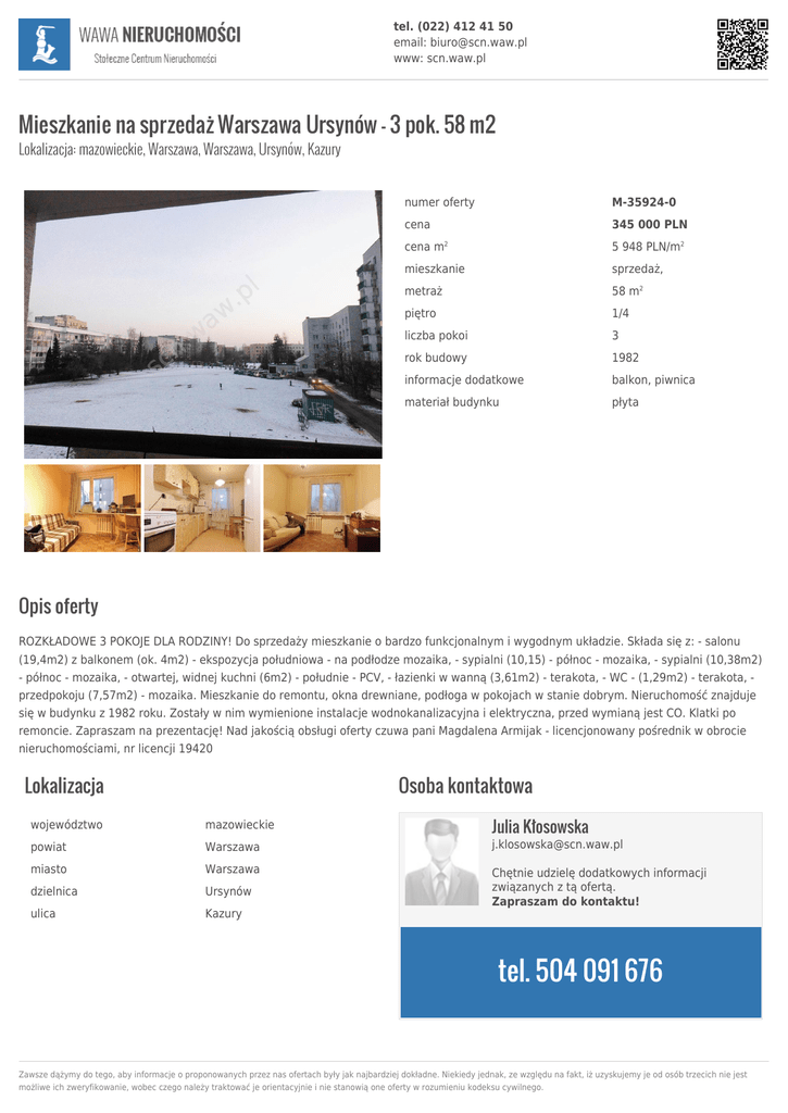tel. (022) 412 41 50 email: [email protected] www: scn.waw.pl Mieszkanie na sprzedaż Warszawa Ursynów - 3 pok. 58 m2 Lokalizacja: mazowieckie, Warszawa, Warszawa, Ursynów, Kazury numer oferty M-35924-0 cena 345 000 PLN cena m 5 948 PLN/m2 mieszkanie sprzedaż, metraż 58 m2 piętro 1/4 liczba pokoi 3 rok budowy 1982 informacje dodatkowe balkon, piwnica materiał budynku płyta 2 Opis oferty ROZKŁADOWE 3 POKOJE DLA RODZINY! Do sprzedaży mieszkanie o bardzo funkcjonalnym i wygodnym układzie. Składa się z: - salonu (19,4m2) z balkonem (ok. 4m2) - ekspozycja południowa - na podłodze mozaika, - sypialni (10,15) - północ - mozaika, - sypialni (10,38m2) - północ - mozaika, - otwartej, widnej kuchni (6m2) - południe - PCV, - łazienki w wanną (3,61m2) - terakota, - WC - (1,29m2) - terakota, przedpokoju (7,57m2) - mozaika. Mieszkanie do remontu, okna drewniane, podłoga w pokojach w stanie dobrym. Nieruchomość znajduje się w budynku z 1982 roku. Zostały w nim wymienione instalacje wodnokanalizacyjna i elektryczna, przed wymianą jest CO. Klatki po remoncie. Zapraszam na prezentację! Nad jakością obsługi oferty czuwa pani Magdalena Armijak - licencjonowany pośrednik w obrocie nieruchomościami, nr licencji 19420 Lokalizacja Osoba kontaktowa Julia Kłosowska województwo mazowieckie powiat Warszawa [email protected] miasto Warszawa dzielnica Ursynów ulica Kazury Chętnie udzielę dodatkowych informacji związanych z tą ofertą. Zapraszam do kontaktu! tel. 504 091 676 Zawsze dążymy do tego, aby informacje o proponowanych przez nas ofertach były jak najbardziej dokładne. Niekiedy jednak, ze względu na fakt, iż uzyskujemy je od osób trzecich nie jest możliwe ich zweryfikowanie, wobec czego należy traktować je orientacyjnie i nie stanowią one oferty w rozumieniu kodeksu cywilnego.