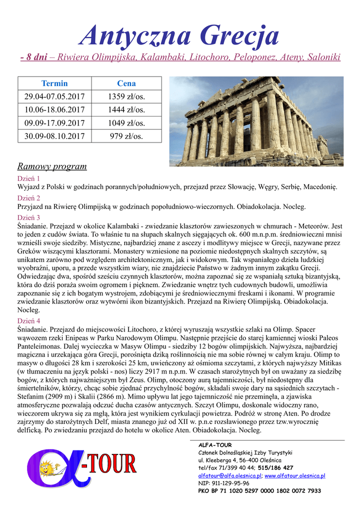 Antyczna Grecja - 8 dni – Riwiera Olimpijska, Kalambaki, Litochoro, Peloponez, Ateny, Saloniki Termin Cena 29.04-07.05.2017 1359 zł/os. 10.06-18.06.2017 1444 zł/os. 09.09-17.09.2017 1049 zł/os. 30.09-08.10.2017 979 zł/os. Ramowy program Dzień 1 Wyjazd z Polski w godzinach porannych/południowych, przejazd przez Słowację, Węgry, Serbię, Macedonię. Dzień 2 Przyjazd na Riwierę Olimpijską w godzinach popołudniowo-wieczornych. Obiadokolacja. Nocleg. Dzień 3 Śniadanie. Przejazd w okolice Kalambaki - zwiedzanie klasztorów zawieszonych w chmurach - Meteorów. Jest to jeden z cudów świata. To właśnie tu na słupach skalnych sięgających ok. 600 m.n.p.m. średniowieczni mnisi wznieśli swoje siedziby. Mistyczne, najbardziej znane z ascezy i modlitywy miejsce w Grecji, nazywane przez Greków wiszącymi klasztorami. Monastery wzniesione na poziomie niedostępnych skalnych szczytów, są unikatem zarówno pod względem architektonicznym, jak i widokowym. Tak wspaniałego dzieła ludzkiej wyobraźni, uporu, a przede wszystkim wiary, nie znajdziecie Państwo w żadnym innym zakątku Grecji. Odwiedzając dwa, spośród sześciu czynnych klasztorów, można zapoznać się ze wspaniałą sztuką bizantyjską, która do dziś poraża swoim ogromem i pięknem. Zwiedzanie wnętrz tych cudownych budowli, umożliwia zapoznanie się z ich bogatym wystrojem, zdobiącymi je średniowiecznymi freskami i ikonami. W programie zwiedzanie klasztorów oraz wytwórni ikon bizantyjskich. Przejazd na Riwierę Olimpijską. Obiadokolacja. Nocleg. Dzień 4 Śniadanie. Przejazd do miejscowości Litochoro, z której wyruszają wszystkie szlaki na Olimp. Spacer wąwozem rzeki Enipeas w Parku Narodowym Olimpu. Następnie przejście do starej kamiennej wioski Paleos Panteleimonas. Dalej wycieczka w Masyw Olimpu - siedziby 12 bogów olimpijskich. Najwyższa, najbardziej magiczna i urzekająca góra Grecji, porośnięta dziką roślinnością nie ma sobie równej w całym kraju. Olimp to masyw o długości 28 km i szerokości 25 km, uwieńczony aż ośmioma szczytami, z których najwyższy Mitikas (w tłumaczeniu na język polski - nos) liczy 2917 m n.p.m. W czasach starożytnych był on uważany za siedzibę bogów, z których najważniejszym był Zeus. Olimp, otoczony aurą tajemniczości, był niedostępny dla śmiertelników, którzy, chcąc sobie zjednać przychylność bogów, składali swoje dary na sąsiednich szczytach Stefanim (2909 m) i Skalii (2866 m). Mimo upływu lat jego tajemniczość nie przeminęła, a zjawiska atmosferyczne pozwalają odczuć ducha czasów antycznych. Szczyt Olimpu, doskonale widoczny rano, wieczorem ukrywa się za mgłą, która jest wynikiem cyrkulacji powietrza. Podróż w stronę Aten. Po drodze zajrzymy do starożytnych Delf, miasta znanego już od XII w. p.n.e rozsławionego przez tzw.wyrocznię delficką. Po zwiedzaniu przejazd do hotelu w okolice Aten. Obiadokolacja. Nocleg. ALFA-TOUR Członek Dolnośląskiej Izby Turystyki ul. Kleeberga 4, 56-400 Oleśnica tel/fax 71/399 40 44; 515/186 427 [email protected]; www.alfatour.olesnica.pl NIP: 911-129-95-96 PKO BP 71 1020 5297 0000 1802 0072 7933 Dzień 5 Po śniadaniu przejazd na Peloponez - półwysep, na którym można znaleźć ślady ludzkiej aktywności pochodzące ze Starej i Nowej Epoki Kamiennej. To właśnie tu znajduje się słynny Kanał Koryncki, starożytny Korynt - gdzie m.in. Paweł z Tarsu wygłaszał swoje listy do Koryntian, jak również jedne z najcenniejszych wykopalisk archeologicznych - Brama Lwów, groby w Mykenach, świątynia Asklepiosa oraz imponujący amfiteatr Epidauros. Powrót do hotelu. Obiadokolacja. Nocleg. Dzień 6 Śniadanie. Przejazd do Aten. W programie zwiedzanie marmurowego Stadionu Kalimarmaro, na którym odbyło się otwarcie I Igrzysk Olimpijskich ery nowożytnej i na nim również odbyła się ceremonia zakończenia maratonu w 2004 roku, wzgórza Akropolu, na którym góruje świątynia poświęcona bogini Atenie - Partenon. Następnie zwiedzanie Starożytnej Agory, Rzymskiego Forum, dwóch najstarszych dzielnic miasta - Plaki i Monastiraki, hellenistycznego zegara wodnego, czyli Wieży Wiatrów, największego greckiego portu Pireus oraz wielu innych zabytków. W miarę możliwości na Placu Syntagmy, pod pomnikiem Nieznanego Żołnierza będzie okazja zobaczyć zmianę warty żołnierzy Evzoni. W godzinach wieczornych przyjazd do Paralii. Obiadokolacja. Nocleg. Dzień 7 Śniadanie. Pobyt na Riwierze Olimpijskiej - czas wolny na indywidualne zwiedzanie oraz kąpiele morskie i słoneczne. W godzinach wieczornych obiadokolacja połączona z wieczorem greckim - czyli spotkanie z folklorem - wspólna kolacja oraz zabawa w rytmie tradycyjnej greckiej muzyki. Nocleg. Dzień 8 Śniadanie. Przejazd do Salonik - drugiego co do wielkości miasta Grecji. Zwiedzanie Białej Wieży pozostałości po 8 km długości murach miejskich, wzniesionych przez Wenecjan w 1430 r., kościoła Agia Sofia, Agios Dimitrios - największy kościoł Recji, którego najstarsza zachowana krypta pochodzi z III w., Łuku Triumfalnego Galeriusza oraz Rotonde. Następnie wyjazd w drogę powrotną do Polski. Przejazd przez Macedonię/Bułgarię, Serbię, Węgry. Dzień 9 Przejazd przez Słowację. Przyjazd do Polski w godzinach popołudniowych/wieczornych. Cena zawiera przejazd autokarem klasy LUX (klimatyzacja, cafe - bar, DVD, WC) zakwaterowanie- 6 noclegów na terenie Grecji wyżywienie HB 6 śniadań i 6 obiadokolacji opiekę pilota, rezydenta ubezpieczenie SIGNAL IDUNA (KL 10000 €, NNW 10000 zł, BP 500 zł) Dopłaty wymagane na miejscu koszty programowe ok. 120 € - płatne u pilota w autokarze, koszty nie podlegają rozliczeniu ALFA-TOUR Członek Dolnośląskiej Izby Turystyki ul. Kleeberga 4, 56-400 Oleśnica tel/fax 71/399 40 44; 515/186 427 [email protected]; www.alfatour.olesnica.pl NIP: 911-129-95-96 PKO BP 71 1020 5297 0000 1802 0072 7933 Dostępne opcje Zakwaterowania Riwiera Olimpijska - Studia