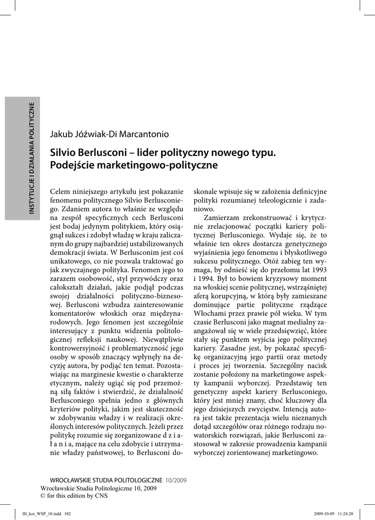 INSTYTUCJE I DZIAŁANIA POLITYCZNE Jakub Jóźwiak-Di Marcantonio Silvio Berlusconi – lider polityczny nowego typu. Podejście marketingowo-polityczne Celem niniejszego artykułu jest pokazanie fenomenu politycznego Silvio Berlusconiego. Zdaniem autora to właśnie ze względu na zespół specyficznych cech Berlusconi jest bodaj jedynym politykiem, który osiągnął sukces i zdobył władzę w kraju zaliczanym do grupy najbardziej ustabilizowanych demokracji świata. W Berlusconim jest coś unikatowego, co nie pozwala traktować go jak zwyczajnego polityka. Fenomen jego to zarazem osobowość, styl przywódczy oraz całokształt działań, jakie podjął podczas swojej działalności polityczno-biznesowej. Berlusconi wzbudza zainteresowanie komentatorów włoskich oraz międzynarodowych. Jego fenomen jest szczególnie interesujący z punktu widzenia politologicznej refleksji naukowej. Niewątpliwie kontrowersyjność i problematyczność jego osoby w sposób znaczący wpłynęły na decyzję autora, by podjąć ten temat. Pozostawiając na marginesie kwestie o charakterze etycznym, należy ugiąć się pod przemożną siłą faktów i stwierdzić, że działalność Berlusconiego spełnia jedno z głównych kryteriów polityki, jakim jest skuteczność w zdobywaniu władzy i w realizacji określonych interesów politycznych. Jeżeli przez politykę rozumie się zorganizowane d z i ał a n i a, mające na celu zdobycie i utrzymanie władzy państwowej, to Berlusconi do- skonale wpisuje się w założenia definicyjne polityki rozumianej teleologicznie i zadaniowo. Zamierzam zrekonstruować i krytycznie zrelacjonować początki kariery politycznej Berlusconiego. Wydaje się, że to właśnie ten okres dostarcza genetycznego wyjaśnienia jego fenomenu i błyskotliwego sukcesu politycznego. Otóż zabieg ten wymaga, by odnieść się do przełomu lat 1993 i 1994. Był to bowiem kryzysowy moment na włoskiej scenie politycznej, wstrząśniętej aferą korupcyjną, w którą były zamieszane dominujące partie polityczne rządzące Włochami przez prawie pół wieku. W tym czasie Berlusconi jako magnat medialny zaangażował się w wiele przedsięwzięć, które stały się punktem wyjścia jego politycznej kariery. Zasadne jest, by pokazać specyfikę organizacyjną jego partii oraz metody i proces jej tworzenia. Szczególny nacisk zostanie położony na marketingowe aspekty kampanii wyborczej. Przedstawię ten genetyczny aspekt kariery Berlusconiego, który jest mniej znany, choć kluczowy dla jego dzisiejszych zwycięstw. Intencją autora jest także prezentacja wielu nieznanych dotąd szczegółów oraz różnego rodzaju nowatorskich rozwiązań, jakie Berlusconi zastosował w zakresie prowadzenia kampanii wyborczej zorientowanej marketingowo. WROCŁAWSKIE STUDIA POLITOLOGICZNE 10/2009 Wrocławskie Studia Politologiczne 10, 2009 © for this edition by CNS III_kor_WSP_10.indd 102 2009-10-09 11:24:20 103 1. Fenomen Berlusconiego jako przedmiot badań marketingu politycznego INSTYTUCJE I DZIAŁANIA POLITYCZNE Berlusconi zalicza się do specyficznej kategorii tzw. polityków przedsiębiorców, wykorzystał bowiem własne zasoby organizacyjno-finansowe w celu utworzenia partii politycznej, która stała się efektywnym narzędziem realizacji jego partykularnych interesów polityczno-biznesowych. Sednem politycznego zaangażowania Berlusconiego jest Forza Italia, partia przedsiębiorstwo, która wyłoniła się z Fininvestu, czyli z imperium biznesowego Berlusconiego. Przedsiębiorstwo gospodarcze samo z siebie zrodziło organizację polityczną, której zadaniem stała się obrona interesów owego przedsiębiorstwa i jego właściciela. W ten sposób powstała Forza Italia mająca na celu wynieść Berlusconiego do władzy. W istocie Berlusconi stał się podwójnym właścicielem zarówno przedsiębiorstwa, jak i partii. Forza Italia genetycznie powstała jako osobista partia Berlusconiego, jako organizacja stworzona przez niego i dla niego. W związku z tym ujmowana jest w teorii partii politycznych jako business firm model party albo partito azienda, co oznacza partię kierującą się logiką typową dla funkcjonowania prywatnego przedsiębiorstwa gospodarczego1. Berlusconi jest fenomenem, ale zarazem pokazuje coraz powszechniejszą tendencję w dzisiejszej polityce, która stała się obszarem rewolucji marketingowej i medialnej, ponadto jest przykładem personalizacji polityki. Kariera Berlusconiego składa się z etapu biznesowego i politycznego, które nie są oddzielone od siebie, lecz nawzajem się przenikają. Otóż należy wziąć pod uwagę fakt, że przez większą część życia Berlusconi był przedsiębiorcą budującym imperium medialno-usługowe, jest to istotny element dla zrozumienia jego fenomenu. Dopiero w wieku 57 lat zdecydował się zaangażować w działalność polityczną. Należy podkreślić, że Berlusconi jest magnatem medialnym, działającym w branży takich usług, jak finanse, ubezpieczenia, reklama i rozrywka. Jest to jego wielki atut, dysponuje bowiem praktycznie wszystkimi zasobami niezbędnymi, by odnieść zwycięstwo w dobie polityki zorientowanej marketingowo. Berlusconi określany potocznie mianem Cavaliere jest najbogatszym Włochem znajdującym się w pierwszej trzydziestce najbogatszych ludzi na świecie. Cavaliere reprezentuje awangardę nowoczesnego sposobu uprawiania polityki, reprezentuje świat marketingu politycznego i telewizji. Jego sukces jest potwierdzeniem coraz silniejszego związku między bogactwem, mediami i polityką. Berlusconi rozwinął i udoskonalił nową formułę władzy, według której bogactwo, media, rozgłos i sława są głównymi składnikami umożliwiającymi zdobycie władzy w państwie demokratycznym. Autor jest świadom, że marketingowe i urynkowione traktowanie polityki jest jej dzisiejszym wyróżnikiem. Narzędzia z zestawu marketing-mix i promotion-mix2 stały się kwintesencją dzisiejszych kampanii wybo