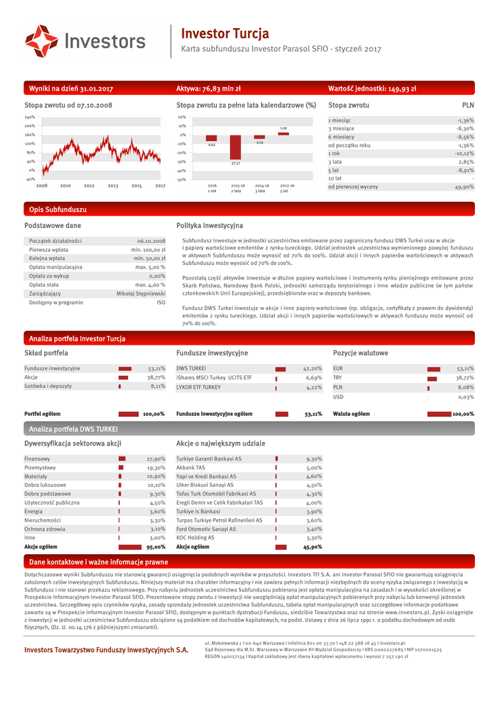 Investor Turcja Karta subfunduszu Investor Parasol SFIO - styczeń 2017 Wyniki na dzień 31.01.2017 Stopa zwrotu od 07.10.2008 Aktywa: 76,83 mln zł Wartość jednostki: 149,93 zł Stopa zwrotu za pełne lata kalendarzowe (%) Stopa zwrotu 1 miesiąc 3 miesiące 6 miesięcy od początku roku 1 rok 3 lata 5 lat 10 lat od pierwszej wyceny PLN -1,36% -8,30% -8,56% -1,36% -10,12% 2,85% -8,91% 49,90% Opis Subfunduszu Podstawowe dane Polityka inwestycyjna Początek działalności 06.10.2008 Pierwsza wpłata min. 100,00 zł Kolejna wpłata min. 50,00 zł Opłata manipulacyjna max. 5,00 % Opłata za wykup 0,00% Opłata stała Zarządzający max. 4,00 % Mikołaj Stępniewski Dostępny w programie ISO Subfundusz inwestuje w jednostki uczestnictwa emitowane przez zagraniczny fundusz DWS Turkei oraz w akcje i papiery wartościowe emitentów z rynku tureckiego. Udział jednostek uczestnictwa wymienionego powyżej funduszu w aktywach Subfunduszu może wynosić od 70% do 100%. Udział akcji i innych papierów wartościowych w aktywach Subfunduszu może wynosić od 70% do 100%. Pozostałą część aktywów inwestuje w dłużne papiery wartościowe i instrumenty rynku pieniężnego emitowane przez Skarb Państwa, Narodowy Bank Polski, jednostki samorządu terytorialnego i inne władze publiczne (w tym państw członkowskich Unii Europejskiej), przedsiębiorstw oraz w depozyty bankowe. Fundusz DWS Turkei inwestuje w akcje i inne papiery wartościowe (np. obligacje, certyfikaty z prawem do dywidendy) emitentów z rynku tureckiego. Udział akcji i innych papierów wartościowych w aktywach funduszu może wynosić od 70% do 100%. Analiza portfela Investor Turcja Skład portfela Fundusze inwestycyjne Pozycje walutowe Fundusze inwestycyjne 53,11% DWS TURKEI 42,20% EUR 53,11% Akcje 38,77% iShares MSCI Turkey UCITS ETF 6,69% TRY 38,77% LYXOR ETF TURKEY 4,22% PLN 8,08% USD 0,03% Gotówka i depozyty Portfel ogółem 8,11% 100,00% Fundusze inwestycyjne ogółem 53,11% Waluta ogółem 100,00% Analiza portfela DWS TURKEI Dywersyfikacja sektorowa akcji Akcje o największym udziale Finansowy 27,90% Turkiye Garanti Bankasi AS Przemysłowy 19,30% Akbank TAS 9,30% 5,00% Materiały 10,90% Yapi ve Kredi Bankasi AS 4,60% Dobra luksusowe 10,10% Ulker Biskuvi Sanayi AS 4,50% 9,30% Tofas Turk Otomobil Fabrikasi AS 4,30% Użyteczność publiczna 4,50% Eregli Demir ve Celik Fabrikalari TAS 4,00% Energia 3,60% Turkiye Is Bankasi 3,90% Nieruchomości 3,30% Turpas Turkiye Petrol Rafinerileri AS 3,60% Ochrona zdrowia 3,10% Ford Otomotiv Sanayi AS 3,40% Inne 3,00% KOC Holding AS Dobra podstawowe Akcje ogółem 95,00% Akcje ogółem 3,30% 45,90% Dane kontaktowe i ważne informacje prawne Dotychczasowe wyniki Subfunduszu nie stanowią gwarancji osiągnięcia podobnych wyników w przyszłości. Investors TFI S.A. ani Investor Parasol SFIO nie gwarantują osiągnięcia założonych celów inwestycyjnych Subfunduszu. Niniejszy materiał ma charakter informacyjny i nie zawiera pełnych informacji niezbędnych do oceny ryzyka związanego z inwestycją w Subfundusz i nie stanowi przekazu reklamowego. Przy nabyciu jednostek uczestnictwa Subfunduszu pobierana jest opłata manipulacyjna na zasadach i w wysokości określonej w Prospekcie Informacyjnym Investor Parasol SFIO. Prezentowane stopy zwrotu z inwestycji nie uwzględniają opłat manipulacyjnych pobieranych przy nabyciu lub konwersji jednostek uczestnictwa. Szczegółowy opis czynników ryzyka, zasady sprzedaży jednostek uczestnictwa Subfunduszu, tabela opłat manipulacyjnych oraz szczegółowe informacje podatkowe zawarte są w Prospekcie Informacyjnym Investor Parasol SFIO, dostępnym w punktach dystrybucji Funduszu, siedzibie Towarzystwa oraz na stronie www.investors.pl. Zyski osiągnięte z inwestycji w jednostki uczestnictwa Subfunduszu obciążone są podatkiem od dochodów kapitałowych, na podst. Ustawy z dnia 26 lipca 1991 r. o podatku dochodowym od osób fizycznych, (Dz. U. 00.14.176 z późniejszymi zmianami). Investors Towarzystwo Funduszy Inwestycyjnych S.A. ul. Mokotowska 1 I 00-640 Warszawa I Infolinia 801 00 33 70 I +48 22 588 18 45 I investors.pl Sąd Rejonowy dla M.St. Warszawy w Warszawie XII Wydział Gospodarczy I KRS 0000227685 I NIP 1070001525 REGON 140027134 I Kapitał zakładowy jest równy kapitałowi wpłaconemu i wynosi 7 257 190 zł