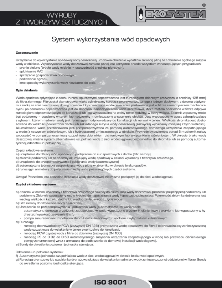 WYROBY Z TWORZYW SZTUCZNYCH System wykorzystania wód opadowych Zastosowanie Urządzenie do wykorzystania opadowej wody deszczowej umożliwia obniżenie wydatków za wodę pitną bez obniżenia ogólnego zużycia wody w obiekcie. Wykorzystanie wody deszczowej zamiast pitnej jest korzystne przede wszystkim w następujących przypadkach: - pranie bielizny (źródło wody miękkiej = oszczędność środków piorących), - spłukiwanie WC, - sprzątanie gospodarstwa domowego, - podlewanie ogrodu, - inne sposoby wykorzystania wody niezdatnej do picia. Opis działania Woda opadowa spływająca z dachu rurami spustowymi doprowadzana jest rurociągiem zbiorczym (zazwyczaj o średnicy 125 mm) do filtra ziemnego. Filtr został skonstruowany jako cylindryczny korpus z tworzywa sztucznego z jednym dopływem, z dwoma odpływami i siatką ze stali nierdzewnej do wyjmowania. Doprowadzona woda deszczowa pozbawiana jest w filtrze zanieczyszczeń mechanicznych i po odmuleniu doprowadzana jest do zbiornika. Zanieczyszczona woda szczątkowa, która została oddzielona w filtrze odpływa rurociągiem odprowadzającym do kanalizacji lub jest wypuszczana na wolny teren rodzimy, w który wsiąka. Zbiornik zapasowy może być podziemny – osadzony w teren, lub nadziemny – umieszczony w suterenie obiektu. Jest wyposażony w spust zabezpieczający z syfonem, którym nadmiar wody jest rurociągiem odprowadzany do kanalizacji lub na wolny teren.. Wielkość zbiornika jest dostosowana do wielkości powierzchni dachu lub zakładanego zużycia wody deszczowej (zazwyczaj wybieramy mniejszą z tych wielkości). Akumulowana woda przefiltrowana jest przepompowywana za pomocą automatycznego domowego urządzenia zaopatrującego w wodę (z naczyniem ciśnieniowym, lub z hydrostatem) umieszczonego w obiekcie. Przy różnicy poziomów ponad 8 m zbiornik należy wyposażyć w pompę zanurzeniową uzupełnioną zbiornikiem ciśnieniowym lub wyłącznikiem ciśnieniowym. W okresie braku wody deszczowej można system alternatywnie uzupełniać wodą z sieci wodociągowej bezpośrednio do zbiornika lub za pomocą automatycznej jednostki uzupełniającej. Części składowe systemu: a) urządzenie do filtracji wód opadowych podłączone do rur spustowych z dachu (filtr ziemny), b) zbiornik podziemny lub nadziemny akumulujący wodę opadową w całości wykonany z tworzywa sztucznego, c) urządzenie do przepompowywania i pobierania wody (automatyczne) d) automatyczna jednostka uzupełniająca wodą pitną w zbiorniku w okresie braku opadów, e) rurociągi i armatury do połączenia między sobą poszczególnych części systemu. Uwaga! Potrzebna jest oddzielna instalacja wody deszczowej, nie można podłączyć jej do sieci wodociągowej. Części składowe systemu a) Zbiornik w całości wykonany z tworzywa sztucznego służący do akumulacji wody deszczowej (materiał polipropylen) nadziemny lub podziemny. Zbiornik wyposażony jest w króciec do napuszczania wody i spust zabezpieczający. Pojemność zbiornika dobierana jest według wielkości i kształtu dachu lub według zakładanego zużycia wody. b) Filtr ziemny do filtrowania wody deszczowej c) Urządzenie do przepompowywania i pobierania wody (automatyczne) w wariantach: - automatyczne domowe urządzenie zaopatrujące w wodę wyposażone w zbiornik ciśnieniowy z workiem, lub wyposażony w hydrostat (wysokość zasysania 8 m), - pompa zanurzeniowa uzupełniona zbiornikiem ciśnieniowym z workiem i wyłącznikiem ciśnieniowym. d) Rurociągi: - rurociąg doprowadzający PCW (zazwyczaj DN 125) gromadzoną wodę deszczową do filtra i odprowadzający zanieczyszczoną wodę szczątkową do wsiąkania w teren ewentualnie do kanalizacji, - rurociąg PCW czystej wody z filtra do zbiornika (zazwyczaj DN 100), - rurociąg PE od D 32 do D 50 automatycznego zasysania urządzenia zaopatrującego w wodę lub przewodu ciśnieniowego pompy zanurzeniowej wraz z armaturą do podłączenia do domowej instalacji wodociągowej. e) Sondy do określania poziomu i jednostka sterująca. Odmienne uzupełnienia systemu: f) Automatyczna jednostka uzupełniająca wodę z sieci wodociągowej w okresie braku wód opadowych. g) Rurociąg drenażowy lub studzienka drenażowa służaca do wsiąkania nadmiaru wody zanieczyszczonej oddzielonej w filtrze. Sondy do określania poziomu i jednostka sterująca. ISO 9001 Schemat systemu Wymiarowanie urządzenia Roczna suma opadów Rzut poziomy dachu obiektu l/m2 m2 Współczynniki spływu Kształt dachu i rodzaj pokrycia Współczynnik spływu Dach płaski ze żwirową warstwą dociskową Dach płaski z płyt z tworzywa sztucznego Dach spadzisty z pokryciem ceramicznym lub betonowym Dach spadzisty z pokryciem z płyt z tworzywa sztucznego Przeliczenie występowania Roczna Rzut Współczynnik Występowanie wody Występowanie wody suma opadów poziomy spływu deszczowej/rok deszczowej/dzień 2 2 Przykład 800 l/m x 120 m x 0,75 = 72000 l/rok : 365 =’ 200 l/dzień 2 2 Twoje przeliczenie l/m x m x = l/rok : 365 =’ l/dzień Określenie zużycia Rodzaj zużycia średnia wartość m3/rok Twoje zużycie Toalety z/bez urządzenia 8/14 m3/rok m3/rok oszczędzającego (na osobę) Pralka (na osobę) 6 m3/rok m3/rok Sprzątanie(na osobę) 1 m3/rok m3/rok Zużycie na osobę / rok m3/rok Liczba osób w gospodarstwie domowym x zużycie na osobę/rok= osoby Zużycie w domu m3/rok 2 Podlewanie ogrodu (na 100 m ) m3/rok Zużycie w domu + podlewanie m3/rok ogrodu = ogólne zużycie / rok’ Ogólne zużycie : 365 = m3/dzień Zużycie dzienne Określenie pojemności zbiornika (optymalne zasoby na okres 2 –3 tygodni) Zużycie dzienne w m3 x 15 dni = Potrzebny zapas Przykład: 0,205 m3 x 15 dni = Potrzebny zapas m3 Pojemność określona przez ciebie: x dni = m3 Specyfikacja zbiorników - wymiary podstawowe ZBIORNIKI WÓD DESZCZOWYCH GRANIASTE ds-h CYLINDRYCZNE ds-v Typ Pojemność użytkowa [m3] Wymiary (l x š x h) [mm] DS-H1,5 DS-H2 DS-H3 1,5 2 3 1500 x 800 x 1500 2000 x 800