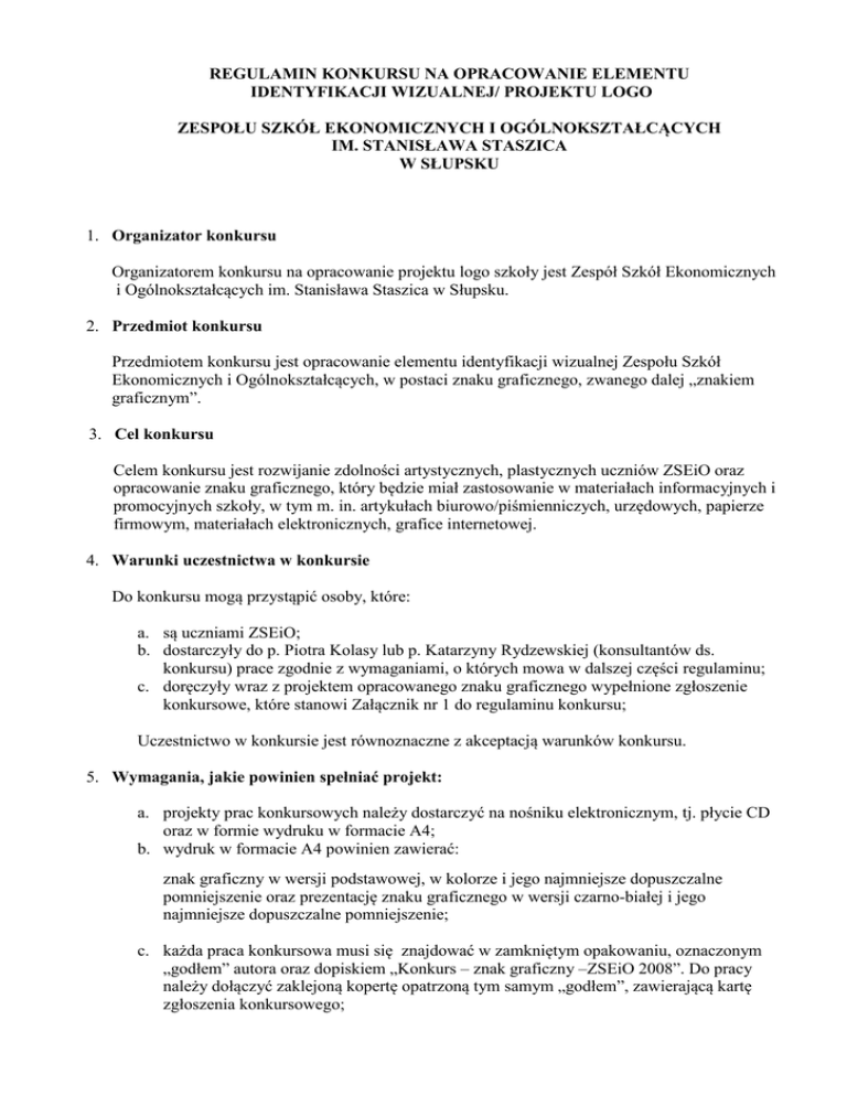REGULAMIN KONKURSU NA OPRACOWANIE ELEMENTU IDENTYFIKACJI WIZUALNEJ/ PROJEKTU LOGO ZESPOŁU SZKÓŁ EKONOMICZNYCH I OGÓLNOKSZTAŁCĄCYCH IM. STANISŁAWA STASZICA W SŁUPSKU 1. Organizator konkursu Organizatorem konkursu na opracowanie projektu logo szkoły jest Zespół Szkół Ekonomicznych i Ogólnokształcących im. Stanisława Staszica w Słupsku. 2. Przedmiot konkursu Przedmiotem konkursu jest opracowanie elementu identyfikacji wizualnej Zespołu Szkół Ekonomicznych i Ogólnokształcących, w postaci znaku graficznego, zwanego dalej „znakiem graficznym”. 3. Cel konkursu Celem konkursu jest rozwijanie zdolności artystycznych, plastycznych uczniów ZSEiO oraz opracowanie znaku graficznego, który będzie miał zastosowanie w materiałach informacyjnych i promocyjnych szkoły, w tym m. in. artykułach biurowo/piśmienniczych, urzędowych, papierze firmowym, materiałach elektronicznych, grafice internetowej. 4. Warunki uczestnictwa w konkursie Do konkursu mogą przystąpić osoby, które: a. są uczniami ZSEiO; b. dostarczyły do p. Piotra Kolasy lub p. Katarzyny Rydzewskiej (konsultantów ds. konkursu) prace zgodnie z wymaganiami, o których mowa w dalszej części regulaminu; c. doręczyły wraz z projektem opracowanego znaku graficznego wypełnione zgłoszenie konkursowe, które stanowi Załącznik nr 1 do regulaminu konkursu; Uczestnictwo w konkursie jest równoznaczne z akceptacją warunków konkursu. 5. Wymagania, jakie powinien spełniać projekt: a. projekty prac konkursowych należy dostarczyć na nośniku elektronicznym, tj. płycie CD oraz w formie wydruku w formacie A4; b. wydruk w formacie A4 powinien zawierać: znak graficzny w wersji podstawowej, w kolorze i jego najmniejsze dopuszczalne pomniejszenie oraz prezentację znaku graficznego w wersji czarno-białej i jego najmniejsze dopuszczalne pomniejszenie; c. każda praca konkursowa musi się znajdować w zamkniętym opakowaniu, oznaczonym „godłem” autora oraz dopiskiem „Konkurs – znak graficzny –ZSEiO 2008”. Do pracy należy dołączyć zaklejoną kopertę opatrzoną tym samym „godłem”, zawierającą kartę zgłoszenia konkursowego; d. projekt znaku graficznego może zawierać dowolną kombinację „rysunków“, symboli, w jednym lub więcej kolorach, a także słów. e. każda osoba w ramach konkursu możne opracować od 1 do 3 projektów; 6. Miejsce i termin składania prac konkursowych a. Prace konkursowe należy składać u p. Piotra Kolasa lub p. Katarzyny Rydzewskiej, do dnia 28 lutego 2008r. b. Złożone prace nie podlegają zwrotowi. c. Prace konkursowe, nie spełniające wymagań, o których mowa w Regulaminie konkursu lub złożone po upływie terminu, o którym mowa w pkt 5a, nie będą podlegały ocenie Jury. 7. Kryteria oceny prac konkursowych Prace zostaną poddane ocenie przez Komisję Konkursową, składającą się z 5 członków w składzie: o o o o o Przedstawiciel Dyrekcji szkoły; Katarzyna Rydzewska- konsultant ds. konkursu, Piotr Kolasa – konsultant ds. konkursu, Julita Błazucka- pedagog szkolny, Przedstawiciel Samorządu Szkolnego; Jury dokona oceny prac konkursowych zgodnie z następującymi kryteriami: o o o nawiązanie do typów szkół funkcjonujących w zespole; estetyka, oryginalność, innowacyjny charakter projektu, wywoływanie pozytywnych skojarzeń, łatwość rozpoznania i zapamiętania, funkcjonowanie w wersji czarno-białej i barwnej Z przebiegu konkursu Jury sporządzi protokół, zawierający w szczególności listę zwycięzców/ zwycięzcy oraz rodzaj nagrody przyznanej poszczególnym zwycięzcom. 8. Nagrody a. Jury przyzna trzy nagrody za zajęcie: I miejsca; II miejsca; III miejsca. b. Decyzja Jury w zakresie oceny prac konkursowych podlega akceptacji przez Dyrektora szkoły, a od oceny prac konkursowych dokonanej przez Jury uczestnikom nie przysługuje prawo odwołania. c. Organizator zastrzega sobie prawo do zakończenia konkursu bez przyznania nagrody. d. Autor pracy nagrodzonej zobowiązany jest do przeniesienia na ZSEiO majątkowych praw autorskich do opracowanego przez siebie znaku graficznego. 9. Rozstrzygnięcie konkursu Planowana data ogłoszenia wyników to 7 marzec 2008 r. Wyniki konkursu zostaną podane do wiadomości publicznej na stronie internetowej Zespołu Szkół Ekonomicznych i Ogólnokształcących: www.ekonomik.slupsk.pl Załącznik nr 1 do Regulaminu konkursu Karta zgłoszenia konkursowego Dane uczestnika konkursu: Imię i nazwisko ................................................................... Klasa .................................................................... Numer telefonu .................................................................... Godło pracy ..................................................................... OŚWIADCZENIE 1. Oświadczam, że jestem autorem nadesłanej pracy konkursowej na konkurs na opracowanie elementu identyfikacji wizualnej/logo Zespołu Szkół Ekonomicznych i Ogólnokształcących. 2. Oświadczam, że znam i akceptuję postanowienia Regulaminu konkursu. 3. Wyrażam zgodę na przeniesienie praw autorskich do pracy zgłoszonej na konkurs, na opracowanie elementu identyfikacji wizualnej/ logo ZSEiO, oznaczonej godłem ........................................... .............................................................. (data i podpis autora)