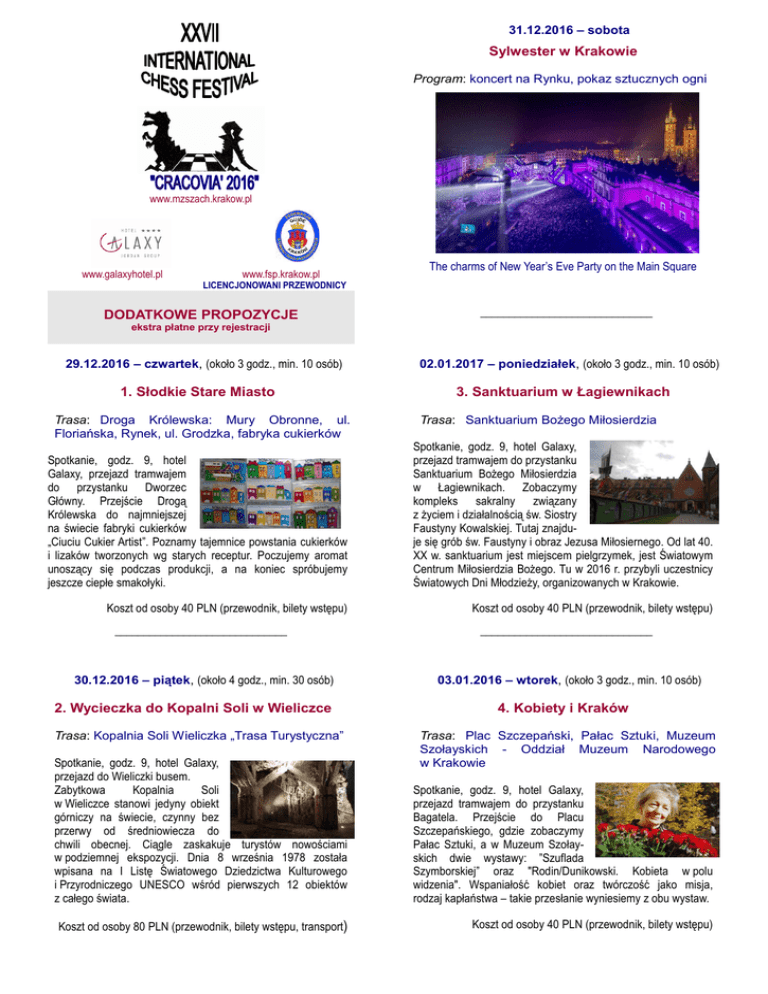 31.12.2016 – sobota Sylwester w Krakowie Program: koncert na Rynku, pokaz sztucznych ogni www.mzszach.krakow.pl www.galaxyhotel.pl www.fsp.krakow.pl The charms of New Year’s Eve Party on the Main Square LICENCJONOWANI PRZEWODNICY DODATKOWE PROPOZYCJE ______________________________ ekstra płatne przy rejestracji 29.12.2016 – czwartek, (około 3 godz., min. 10 osób) 1. Słodkie Stare Miasto Trasa: Droga Królewska: Mury Obronne, ul. Floriańska, Rynek, ul. Grodzka, fabryka cukierków 02.01.2017 – poniedziałek, (około 3 godz., min. 10 osób) 3. Sanktuarium w Łagiewnikach Trasa: Sanktuarium Bożego Miłosierdzia Spotkanie, godz. 9, hotel Galaxy, przejazd tramwajem do przystanku Dworzec Główny. Przejście Drogą Królewska do najmniejszej na świecie fabryki cukierków „Ciuciu Cukier Artist”. Poznamy tajemnice powstania cukierków i lizaków tworzonych wg starych receptur. Poczujemy aromat unoszący się podczas produkcji, a na koniec spróbujemy jeszcze ciepłe smakołyki. Spotkanie, godz. 9, hotel Galaxy, przejazd tramwajem do przystanku Sanktuarium Bożego Miłosierdzia w Łagiewnikach. Zobaczymy kompleks sakralny związany z życiem i działalnością św. Siostry Faustyny Kowalskiej. Tutaj znajduje się grób św. Faustyny i obraz Jezusa Miłosiernego. Od lat 40. XX w. sanktuarium jest miejscem pielgrzymek, jest Światowym Centrum Miłosierdzia Bożego. Tu w 2016 r. przybyli uczestnicy Światowych Dni Młodzieży, organizowanych w Krakowie. Koszt od osoby 40 PLN (przewodnik, bilety wstępu) Koszt od osoby 40 PLN (przewodnik, bilety wstępu) ______________________________ ______________________________ 30.12.2016 – piątek, (około 4 godz., min. 30 osób) 03.01.2016 – wtorek, (około 3 godz., min. 10 osób) 2. Wycieczka do Kopalni Soli w Wieliczce Trasa: Kopalnia Soli Wieliczka „Trasa Turystyczna” 4. Kobiety i Kraków Trasa: Plac Szczepański, Pałac Sztuki, Muzeum Szołayskich - Oddział Muzeum Narodowego w Krakowie Spotkanie, godz. 9, hotel Galaxy, przejazd do Wieliczki busem. Zabytkowa Kopalnia Soli w Wieliczce stanowi jedyny obiekt górniczy na świecie, czynny bez przerwy od średniowiecza do chwili obecnej. Ciągle zaskakuje turystów nowościami w podziemnej ekspozycji. Dnia 8 września 1978 została wpisana na I Listę Światowego Dziedzictwa Kulturowego i Przyrodniczego UNESCO wśród pierwszych 12 obiektów z całego świata. Spotkanie, godz. 9, hotel Galaxy, przejazd tramwajem do przystanku Bagatela. Przejście do Placu Szczepańskiego, gdzie zobaczymy Pałac Sztuki, a w Muzeum Szołayskich dwie wystawy: ”Szuflada Szymborskiej” oraz "Rodin/Dunikowski. Kobieta w polu widzenia". Wspaniałość kobiet oraz twórczość jako misja, rodzaj kapłaństwa – takie przesłanie wyniesiemy z obu wystaw. Koszt od osoby 80 PLN (przewodnik, bilety wstępu, transport) Koszt od osoby 40 PLN (przewodnik, bilety wstępu)