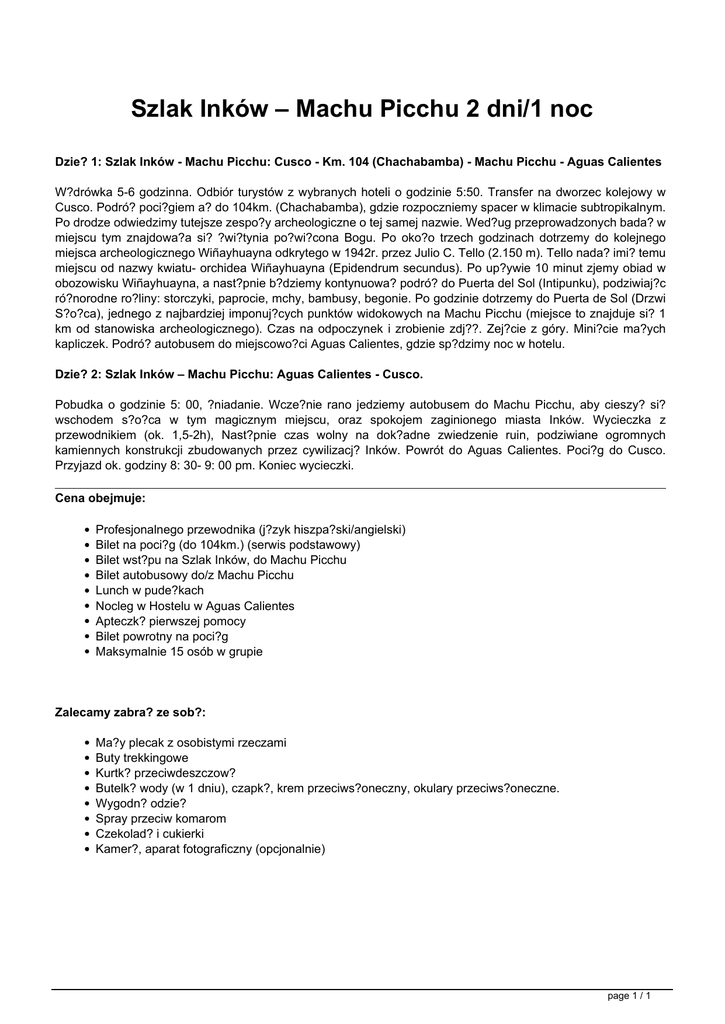Szlak Inków – Machu Picchu 2 dni/1 noc Dzie? 1: Szlak Inków - Machu Picchu: Cusco - Km. 104 (Chachabamba) - Machu Picchu - Aguas Calientes W?drówka 5-6 godzinna. Odbiór turystów z wybranych hoteli o godzinie 5:50. Transfer na dworzec kolejowy w Cusco. Podró? poci?giem a? do 104km. (Chachabamba), gdzie rozpoczniemy spacer w klimacie subtropikalnym. Po drodze odwiedzimy tutejsze zespo?y archeologiczne o tej samej nazwie. Wed?ug przeprowadzonych bada? w miejscu tym znajdowa?a si? ?wi?tynia po?wi?cona Bogu. Po oko?o trzech godzinach dotrzemy do kolejnego miejsca archeologicznego Wiñayhuayna odkrytego w 1942r. przez Julio C. Tello (2.150 m). Tello nada? imi? temu miejscu od nazwy kwiatu- orchidea Wiñayhuayna (Epidendrum secundus). Po up?ywie 10 minut zjemy obiad w obozowisku Wiñayhuayna, a nast?pnie b?dziemy kontynuowa? podró? do Puerta del Sol (Intipunku), podziwiaj?c ró?norodne ro?liny: storczyki, paprocie, mchy, bambusy, begonie. Po godzinie dotrzemy do Puerta de Sol (Drzwi S?o?ca), jednego z najbardziej imponuj?cych punktów widokowych na Machu Picchu (miejsce to znajduje si? 1 km od stanowiska archeologicznego). Czas na odpoczynek i zrobienie zdj??. Zej?cie z góry. Mini?cie ma?ych kapliczek. Podró? autobusem do miejscowo?ci Aguas Calientes, gdzie sp?dzimy noc w hotelu. Dzie? 2: Szlak Inków – Machu Picchu: Aguas Calientes - Cusco. Pobudka o godzinie 5: 00, ?niadanie. Wcze?nie rano jedziemy autobusem do Machu Picchu, aby cieszy? si? wschodem s?o?ca w tym magicznym miejscu, oraz spokojem zaginionego miasta Inków. Wycieczka z przewodnikiem (ok. 1,5-2h), Nast?pnie czas wolny na dok?adne zwiedzenie ruin, podziwiane ogromnych kamiennych konstrukcji zbudowanych przez cywilizacj? Inków. Powrót do Aguas Calientes. Poci?g do Cusco. Przyjazd ok. godziny 8: 30- 9: 00 pm. Koniec wycieczki. Cena obejmuje: Profesjonalnego przewodnika (j?zyk hiszpa?ski/angielski) Bilet na poci?g (do 104km.) (serwis podstawowy) Bilet wst?pu na Szlak Inków, do Machu Picchu Bilet autobusowy do/z Machu Picchu Lunch w pude?kach Nocleg w Hostelu w Aguas Calientes Apteczk? pierwszej pomocy Bilet powrotny na poci?g Maksymalnie 15 osób w grupie Zalecamy zabra? ze sob?: Ma?y plecak z osobistymi rzeczami Buty trekkingowe Kurtk? przeciwdeszczow? Butelk? wody (w 1 dniu), czapk?, krem przeciws?oneczny, okulary przeciws?oneczne. Wygodn? odzie? Spray przeciw komarom Czekolad? i cukierki Kamer?, aparat fotograficzny (opcjonalnie) page 1 / 1 Powered by TCPDF (www.tcpdf.org)
