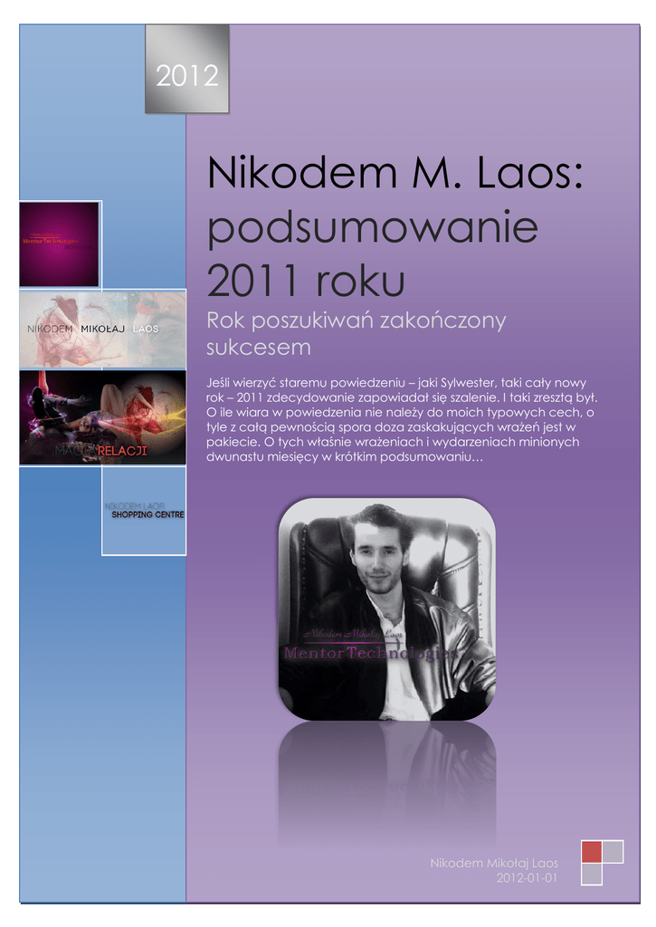 2012 Nikodem M. Laos: podsumowanie 2011 roku Rok poszukiwań zakończony sukcesem Jeśli wierzyć staremu powiedzeniu – jaki Sylwester, taki cały nowy rok – 2011 zdecydowanie zapowiadał się szalenie. I taki zresztą był. O ile wiara w powiedzenia nie należy do moich typowych cech, o tyle z całą pewnością spora doza zaskakujących wrażeń jest w pakiecie. O tych właśnie wrażeniach i wydarzeniach minionych dwunastu miesięcy w krótkim podsumowaniu… Nikodem Mikołaj Laos 2012-01-01 Nikodem M. Laos: podsumowanie 2011 roku 2 Dla tych, bez których ten rok nie byłby wart tak wielu wyjątkowych wspomnień… Nikodem Mikołaj Laos 01.01.2012 [email protected] www.facebook.com/nlaos Nikodem M. Laos: podsumowanie 2011 roku 3 Zawartość Szalony Sylwester 2010/11 ........................................................................................... 4 Wspólne mieszkanie z partnerką ................................................................................ 4 Próby rozkręcania projektów i zakończenie obserwacji PUAs .............................. 5 I Mentor Tour i Osobiste Przebudzenie ...................................................................... 6 Warszawa i Wzorzec Miłości ....................................................................................... 6 Pierwsze płatne szkolenia ............................................................................................ 7 MentorTechnologies .................................................................................................... 7 Nikodem Laos Shopping Centre ................................................................................ 8 Magia Relacji ................................................................................................................ 8 Firma, Współpracownicy oraz Klienci ....................................................................... 9 Plany na 2012 .............................................................................................................. 10 [email protected] www.facebook.com/nlaos Nikodem M. Laos: podsumowanie 2011 roku 4 Rok 2011 śmiało mogę określid rokiem poszukiwao samego siebie. Obecny stan: zmęczenie. Oczekiwania na przyszłośd: ostrożny optymizm. Cele: koncentracja na kluczowych zagadnieniach. Rok 2012 planuję uczynid rokiem odnalezienia i realizacji. Czas na realne efekty i podjęcie starych/nowych wyzwao… Podobnie, jak dwa lata temu – koocówka roku wiąże się przede wszystkim ze sporą dozą zmęczenia. Mimo, że na zewnątrz nie widad jeszcze tak znaczących efektów – wewnątrz zaszła ogromna zmiana i ewolucja. Mógłbym śmiało stwierdzid, że ten rok na dobrą sprawę kooczy moje życie, jako, że dzisiaj – mimo fizycznego wieku 25 lat (dokładnie będzie to 30 stycznia 2012) – wewnątrz czuję się dzisiaj bardzo dojrzałym, ale też starym już człowiekiem. Jednym z prostych przykładów mógłby byd tutaj mój profil na Goldenline, który uzupełniłem niedawno. Zawiera jakąś częśd tego, co w życiu robiłem – jednak śmiało mogę stwierdzid, że to nie jest doświadczenie zawodowe, które spotyka się u osób, które dopiero skooczyły studia. W zasadzie to można by nim obdzielid kilku statystycznych Kowalskich kooczących swoją przygodę na tej planecie. Mam nadzieję, że nie jestem tutaj jednym wariatem, który może coś takiego zaprezentowad. Ale to nie sprawy zawodowe uczyniły mnie, tym kim jestem. Kluczowy był zbiór doświadczeo, które sprawiły, że mój czas nabrał zupełnie innego biegu, a w swoich najintensywniejszych momentach w ostatnim czasie – w ciągu tygodnia, mijał dla mnie rok, czasem nawet trochę więcej. Ale po kolei… Szalony Sylwester 2010/11 To było szaleostwo. Sylwester z trzema przyjaciółkami w zaprzyjaźnionym klubie we Wrocławiu. Tak, śmiało mogę powiedzied, że to był najlepszy Sylwester w moim życiu. Ta impreza dała mi bardzo dużo energii i bardzo pozytywnie nakręciła mnie na nowy rok. Zaś jego pierwsze pół roku stało pod bardzo silnym znakiem trwającego właśnie doświadczenia… Wspólne mieszkanie z partnerką Na dobrą sprawę to był pierwszy raz w życiu, kiedy zamieszkałem z dziewczyną. W gruncie rzeczy zaczęło się od wspólnego mieszkania, ale z czasem… z czasem rozwinęło się to w bardzo osobliwy sposób. To była bardzo długa, ciekawa, ale i kręta droga. Szczegóły wolę pozostawid pomiędzy nami, jednak z całą pewnością mogę stwierdzid, że te 9 miesięcy zaowocowało w sposób, jakiego sam się nie spodziewałem. Śmiało mogę powiedzied, że to był najdłuższy, najintensywniejszy, najbardziej zaskakujący i najbardziej wymagający mentoring, jaki miał miejsce w moim życiu. Obok czysto ludzkiego wymiaru [email protected] www.facebook.com/nlaos Nikodem M. Laos: podsumowanie 2011 roku 5 opartego na bliskości, mnóstwie ciepła i pozytywnych emocji – nasza relacja w taki czy inny sposób naturalnie zawierała w sobie elementy uczenia się od siebie nawzajem. To był wyjątkowy czas. Ale też bardzo trudny. Ostatnie 2 miesiące zaś, były okresem, kiedy rola nauczyciela i uczennicy zaczęły się stopniowo odwracad. I w pewnym momencie sam poczułem się zagubiony w tym, co się działo. Nie spodziewałem się takiego obrotu zdarzeo. Jednak to właśnie ten czas – czas, kiedy siła jej woli okazała się tak potężna – był czasem, kiedy uczyłem się jednych z najważniejszych umiejętności, a także zdobywałem kluczową wiedzę, która zaprocentowała w kolejnych miesiącach. W kwestiach damsko-męskich, ta znajomośd dała mi przede wszystkim wiarę w to, że można zbudowad zdrową i szczęśliwą relację z drugą osobą, nawet jeżeli jest to relacja monogamiczna, oparta na wyłączności. Dała mi także świadomośd, że będąc tylko z jedną kobietą – potrafię odmówid innym, chodby nawet nadarzały się ku temu nieprawdopodobne okazje. Jednak w trakcie każd