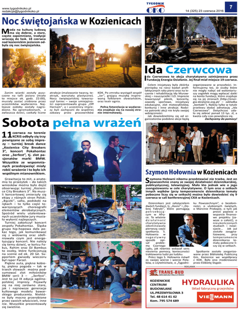 TYGODNIK www.tygodnikoko.pl [email protected] 14 (325) 23 czerwca 2016 7 Noc świętojańska w Kozienicach M oda na kulturę ludową ma się dobrze, a stare, często zapomniane, tradycje wracają do łask. 18 czerwca nad kozienickim jeziorem odbyła się noc świętojańska. Ida Czerwcowa I da Czerwcowa to akcja charytatywna zainicjowana przez Fundację Energia-Działanie. Jej finał miał miejsce 19 czerwca. Zanim wianki zostały puszczone na tafli jeziora (miało to miejsce ok. godz. 22:00), musiały zostać zrobione przez uczestników wydarzenia. Najlepsze ozdoby zostały nagrodzone. Na zgromadzonych, a zwłaszcza dzieci, czekały liczne atrakcje (malowanie twarzy, teatrzyk, warsztaty plastyczne). Nocy świętojańskiej towarzyszył taniec – swoje umiejętności zaprezentowała grupa „Off Harnam", a i uczestnicy imprezy byli zachęcani do wspólnej zabawy przez pracowników KDK. Po zmroku wystąpił zespół „Jar”, grający muzykę inspirowaną folklorem słowiańskim, oraz teatr ognia. Pełna fotorelacja w wydarzenia znajduje się na naszej stronie internetowej. Sobota pełna wrażeń Celem inicjatywy była zbiórka pieniędzy na rzecz badań profilaktycznych raka piersi oraz na leczenie i rehabilitację Idy Murawskiej – nauczycielki I LO. Imprezie towarzyszył piknik, koncerty, zawody sportowe, inicjatywy edukacyjne, zlot motocyklistów, konkursy i inne atrakcje. Rodzina patronki akcji nie kryła swojej wdzięczności. Jak dowiedzieliśmy się od organizatorów podobne akcje będą organizowane w przyszłości. Informujemy też, że osoby które nie mogły nabyć od wolontariuszy cegiełek mogą wpłacać datki na konto fundacji, które znajduje się na jej stronach (http://energia-dzialanie.org.pl/ – zakładka „kontakt”). Należy tylko w tytule przelewu dodać adnotację „Ida Czerwcowa”. Dotychczas udało się zebrać ponad 13 tys. zł, a kwota cały czas powiększa się. Zachęcamy do pomocy! 11 czerwca na terenie KCRiS odbyły się trzy powiązane ze sobą imprezy – turniej break dance „Kozienice City Breakers 3”, koncert Pokahontaz oraz „3erfest”, tj. zlot pasjonatów marki BMW. Wszystkie ze wspomnianych przedsięwzięć miały robić wrażenie i to było ich wspólnym mianownikiem. Grawitacja to mit, a anatomia to przeżytek – do takich wniosków można było dojść obserwując turniej „Kozienice City Breakers 3". Na muszli koncertowej zmierzyły się ekipy z różnych stron Polski. „Bączki", salta, podskoki na rękach – to tylko część towarzyszących choreografii elementów akrobatycznych. Spośród wielu utalentowanych uczestników jury musiało wyłonić najlepszych. Turniej zakończył koncert zespołu Pokahontaz. Śląska grupa hip-hopowa dała pokaz tego, jak komunikować się z widownią oraz zdefiniowała czym jest energetyzujący koncert. Nie należy się temu dziwić, w końcu Fokus, Rahim oraz DJ Bambus to osoby, które funkcjonują na scenie od ok. 20 lat. Supportem gwiazdy wieczoru był raper Parzel. Piękne auta, piękne kobiety, piękna pogoda – tak w trzech słowach można podsumować zlot miłośników BMW serii 3 – „3erfest". Jest to już IX edycja ogólnopolskiej imprezy. Pojawiły się na niej zarówno stare, jak i najnowsze generacje kultowego modelu bawarskiego producenta. Niektóre były mocno przerobione przez swoich właścicieli, inne nie. Wszystkie prezentowały się świetnie. Szymon Hołownia w Kozienicach S zymona Hołowni nikomu przedstawiać nie trzeba. Jest on powszechnie znany ze swojej działalności dziennikarskiej, publicystycznej, telewizyjnej. Mało kto jednak wie o jego zaangażowaniu w cele charytatywne. O tym oraz o setkach innych wątków (przy temperamencie dziennikarza tematy poboczne liczy się w setkach) można było dowiedzieć się 9 czerwca w sali konferencyjnej CKA w Kozienicach. Dziennikarz jest założycielem dwóch fundacji, tj. „Kasisi” i „Dobrej Fabryki”, które pomagają potrzebującym w Afryce. To właśnie działalność charytatywna zdominowała pierwszą część spotkania. S. Hołownia w sugestywny sposób opisał problemy Czarnego Lądu, jak również wskazał sens niesienia pomocy, konieczności traktowania ludzi po ludzku. Prócz tego S. Hołownia mówił os swojej wierze i wierze Polaków, o czytelnictwie, o „Tygodni- ku Powszechnym”, o bezdomności, o ulubionych świętych, o Marcinie Prokopie, o tym jak prosić papieża o wsparcie finansowe projektu (zawsze o całość), o nieukończonych studiach i nowicjacie... Jak już zostało zasygnalizowane, przy temperamencie dziennikarza tematy poboczne liczy się w setkach. Spotkanie zostało zorganizowane przez Bibliotekę Publiczną Gm. Kozienice we współpracy z KDK. Było ono moderowane przez Elżbietę Stąpór. REKLAMA