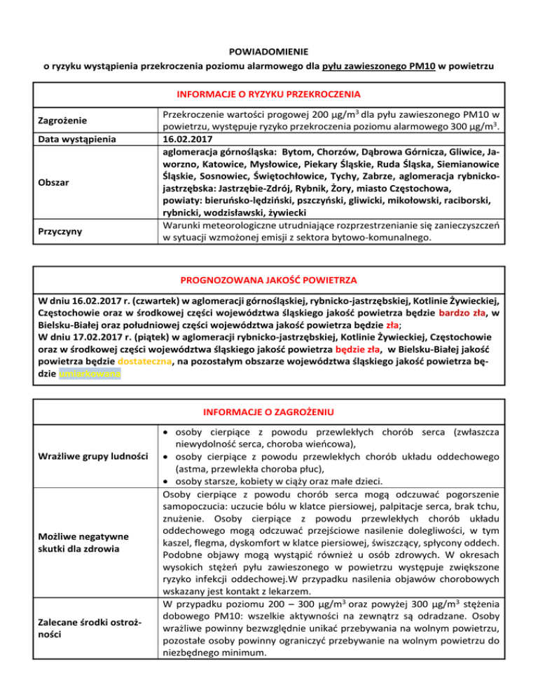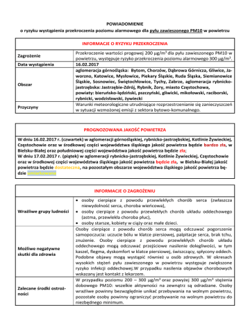 POWIADOMIENIE o ryzyku wystąpienia przekroczenia poziomu alarmowego dla pyłu zawieszonego PM10 w powietrzu INFORMACJE O RYZYKU PRZEKROCZENIA Zagrożenie Data wystąpienia Obszar Przyczyny Przekroczenie wartości progowej 200 µg/m3 dla pyłu zawieszonego PM10 w powietrzu, występuje ryzyko przekroczenia poziomu alarmowego 300 µg/m3. 16.02.2017 aglomeracja górnośląska: Bytom, Chorzów, Dąbrowa Górnicza, Gliwice, Jaworzno, Katowice, Mysłowice, Piekary Śląskie, Ruda Śląska, Siemianowice Śląskie, Sosnowiec, Świętochłowice, Tychy, Zabrze, aglomeracja rybnickojastrzębska: Jastrzębie-Zdrój, Rybnik, Żory, miasto Częstochowa, powiaty: bieruńsko-lędziński, pszczyński, gliwicki, mikołowski, raciborski, rybnicki, wodzisławski, żywiecki Warunki meteorologiczne utrudniające rozprzestrzenianie się zanieczyszczeń w sytuacji wzmożonej emisji z sektora bytowo-komunalnego. PROGNOZOWANA JAKOŚĆ POWIETRZA W dniu 16.02.2017 r. (czwartek) w aglomeracji górnośląskiej, rybnicko-jastrzębskiej, Kotlinie Żywieckiej, Częstochowie oraz w środkowej części województwa śląskiego jakość powietrza będzie bardzo zła, w Bielsku-Białej oraz południowej części województwa jakość powietrza będzie zła; W dniu 17.02.2017 r. (piątek) w aglomeracji rybnicko-jastrzębskiej, Kotlinie Żywieckiej, Częstochowie oraz w środkowej części województwa śląskiego jakość powietrza będzie zła, w Bielsku-Białej jakość powietrza będzie dostateczna, na pozostałym obszarze województwa śląskiego jakość powietrza będzie umiarkowana INFORMACJE O ZAGROŻENIU Wrażliwe grupy ludności Możliwe negatywne skutki dla zdrowia Zalecane środki ostrożności osoby cierpiące z powodu przewlekłych chorób serca (zwłaszcza niewydolność serca, choroba wieńcowa), osoby cierpiące z powodu przewlekłych chorób układu oddechowego (astma, przewlekła choroba płuc), osoby starsze, kobiety w ciąży oraz małe dzieci. Osoby cierpiące z powodu chorób serca mogą odczuwać pogorszenie samopoczucia: uczucie bólu w klatce piersiowej, palpitacje serca, brak tchu, znużenie. Osoby cierpiące z powodu przewlekłych chorób układu oddechowego mogą odczuwać przejściowe nasilenie dolegliwości, w tym kaszel, flegma, dyskomfort w klatce piersiowej, świszczący, spłycony oddech. Podobne objawy mogą wystąpić również u osób zdrowych. W okresach wysokich stężeń pyłu zawieszonego w powietrzu występuje zwiększone ryzyko infekcji oddechowej.W przypadku nasilenia objawów chorobowych wskazany jest kontakt z lekarzem. W przypadku poziomu 200 – 300 µg/m3 oraz powyżej 300 µg/m3 stężenia dobowego PM10: wszelkie aktywności na zewnątrz są odradzane. Osoby wrażliwe powinny bezwzględnie unikać przebywania na wolnym powietrzu, pozostałe osoby powinny ograniczyć przebywanie na wolnym powietrzu do niezbędnego minimum. DZIAŁANIA ZMIERZAJĄCE DO OGRANICZENIA PRZEKROCZEŃ Zakres działań krótkoterminowych Zgodnie z Programem Ochrony Powietrza, w szczególności: wzmożone kontrole indywidualnych kotłów i pieców, w tym nakładanie kar za naruszanie przepisów zakazujących spalania odpadów, nie palenie ognisk i pozostałości roślinnych na powierzchni ziemi, rezygnacja z palenia w kominkach, jeżeli nie stanowią one jedynego źródła ogrzewania. INFORMACJE ORGANIZACYJNE Data wydania Podstawa prawna Źródła danych Opracowanie Publikacja powiadomienia 16.02.2017 Ustawa z dnia 27 kwietnia 2001 r. Prawo ochrony środowiska Wojewódzki Inspektorat Ochrony Środowiska w Katowicach – dane z systemu monitoringu jakości powietrza Zakład Modelowania Zanieczyszczeń Powietrza IMGW–PIB w Warszawie z siedzibą w Katowicach - prognoza jakości powietrza na kolejną dobę Wojewódzki Inspektorat Ochrony Środowiska w Katowicach http://www.katowice.wios.gov.pl