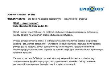 DOMINO MATEMATYCZNE PRZEZNACZENIE – dla dzieci na zajęcia pozalekcyjne – indywidualne i grupowe DOMI – „dwusylabowe” Ilość klocków 28; Ilość zadań 56 DOMI „wyrazy dwusylabowe”, to materiał edukacyjny służący poszerzeniu i utrwaleniu wiedzy dziecka na wstępnym etapie edukacji polonistycznej. Prosta, powszechnienie znana, a jednocześnie atrakcyjna forma uczenia się poprzez zabawę - gra, pomoc obrazkowo – wyrazowa w nauce czytania i rozwoju mowy dziecka, polegająca na łączeniu dwóch pasujących do siebie klocków. Istotnym elementem wspomagającym proces nauki czytania są obrazki znajdujące się na klockach z pierwszymi sylabami wyrazów. Zabawa z klockami DOMI sprzyja wielostronnej aktywności dziecka, rozbudza jego zainteresowanie językiem ojczystym, służy poszerzeniu słownika, ćwiczy tworzenie poprawnej formy wyrazów dwusylabowych z sylab mieszanych. Cele ogólne:  Doskonalenie spostrzegawczości wzrokowej i wrażliwości słuchowej  Poszerzanie i bogacenie zasobu słownikowego  Wspomaganie początkowej nauki czytania Cele szczegółowe:  Odróżnia pojęcia: sylaba, wyraz  Rozpoznaje sylaby otwarte i łączy je w proste wyrazy dwusylabowe w oparciu o obrazki  Tworzy poprawne formy wyrazów dwusylabowych z sylab mieszanych  Czyta wyrazy o prostej budowie sylabowej  Układa klocki DOMI zgodnie z podaną lub z odkrytą zasadą  Sposoby realizacji: 1. Ćwiczenia i zabawy wprowadzające (wstępne), np. a) Dokończ słowo: Prowadzący prosi o dokończenie wyrazu zaczynającego się od podanej sylaby np.: MA – ma, - ta, - rek, - lina; KO – ra, - łek, - tek, - rona b) Ukryta sylaba: Prowadzący rozkłada zestaw obrazków zawierających w swej nazwie sylaby potrzebne do zabawy. Prosi o wybranie obrazka, w nazwie którego ukryła się np., sylaba BA (ryba, baranek, batonik) itp. c) Zaproszenie: Prowadzący rozdaje dzieciom obrazki zawierające w swoich nazwach ukryte sylaby. Dzieci rozpoznają i nazywają obiekty na obrazkach, wymawiają głośno nazwy i dzielą je na sylaby. Prowadzący zaprasza do siebie dziecko z obrazkiem, którego nazwa:  zaczyna się na daną sylabę  kończy się podaną sylabą  zawiera podaną sylabę w środku nazwy. d) Mały odkrywca: Prowadzący wypowiada ciąg słów. Zadaniem dziecka jest uważne słuchanie i odgadnięcie, co ukryło się w wypowiedzianych słowach. np. miasto, ciasto, stokrotka, stopa, stonoga malina, kalina, Paulina, Halina, dolina listek, listonosz, blisko, ślisko, listwa tort, motor, torba, Batory, tornister 2. Prezentacja kolejnych zestawów klocków DOMI a) szczegółowy ogląd i przeliczenie klocków b) swobodne manipulowanie klockami DOMI – układanki, konstrukcje c) rozpoznawanie i nazywanie obiektów na kolejnych klockach d) poznanie celu oraz odkrycie zasad gry w domino obrazkowe, obrazkowo – sylabowe, obrazkowo – wyrazowe e) rozgrywka próbna (uczeń – nauczyciel lub dziecko – rodzic) 3. Samodzielne (lub w parze) układanie klocków DOMI w pętlę, zgodnie z podanym lub odkrytym warunkiem. 4. Odczytywanie ułożonych wyrazów jedno-, dwusylabowych – usprawnianie techniki czytania różnymi sposobami. Warianty: 1. Rusz głową – powiedz słowo a) prowadzący tworzy koło z klocków DOMI odwróconych sylabami do dołu, następnie odkrywa jeden klocek, który zawiera 2 sylaby – końcową oraz początkową i wypowiada 2 słowa z tymi sylabami np. -bek wa- kubek - waga  drugie słowo ułożyć łatwo, bo ilustruje je obrazek na klocku b) kolejny klocek odkrywa dziecko i stara się powiedzieć 2 słowa z wylosowanymi sylabami; jeśli ma problem pomaga mu prowadzący c) sytuację powtarza następne dziecko lub ponownie prowadzący d) zabawa w układanie słów trwa do momentu odkrycia ostatniego klocka. 2. Gra o charakterze rozgrywki dla 2 – 4 zawodników a) prowadzący układa klocki DOMI obrazkami do dołu b) zawodnik rozpoczynający grę wybiera klocek i odwrócony kładzie na stole c) kolejny zawodnik robi to samo; jeśli jego klocek pasuje do leżącego na stole, to dokłada go, a jeżeli nie pasuje – zabiera i odkłada obok siebie d) zwycięża zawodnik, który jako pierwszy pozbędzie się wszystkich klocków. 3. Gra w domino w wersji „memory” – „Ułóż wyraz”: a) prowadzący układa 28 klocków DOMI w 4 rzędach po 7 klocków w rzędzie, zapisem i obrazkami do dołu b) dziecko odkrywa dwa dowolne klocki i dokłada je do siebie; jeśli sąsiadujące z sobą sylaby tworzą wyraz, to zostawia je odsłonięte na stole; jeśli nie tworzą wyrazu – odkłada zakryte klocki w to samo miejsce i stara się zapamiętać ich położenie c) kolejne dziecko odkrywa 1 klocek; jeśli pasuje do odkrytych na stole – dokłada go (z lewej lub z prawej strony), jeśli nie pasuje – odkłada na to samo miejsce gra toczy się do momentu, aż wszystkie klocki zostaną odkryte i ułożone w wyrazowego „węża” zgodnie z zasadami domina.